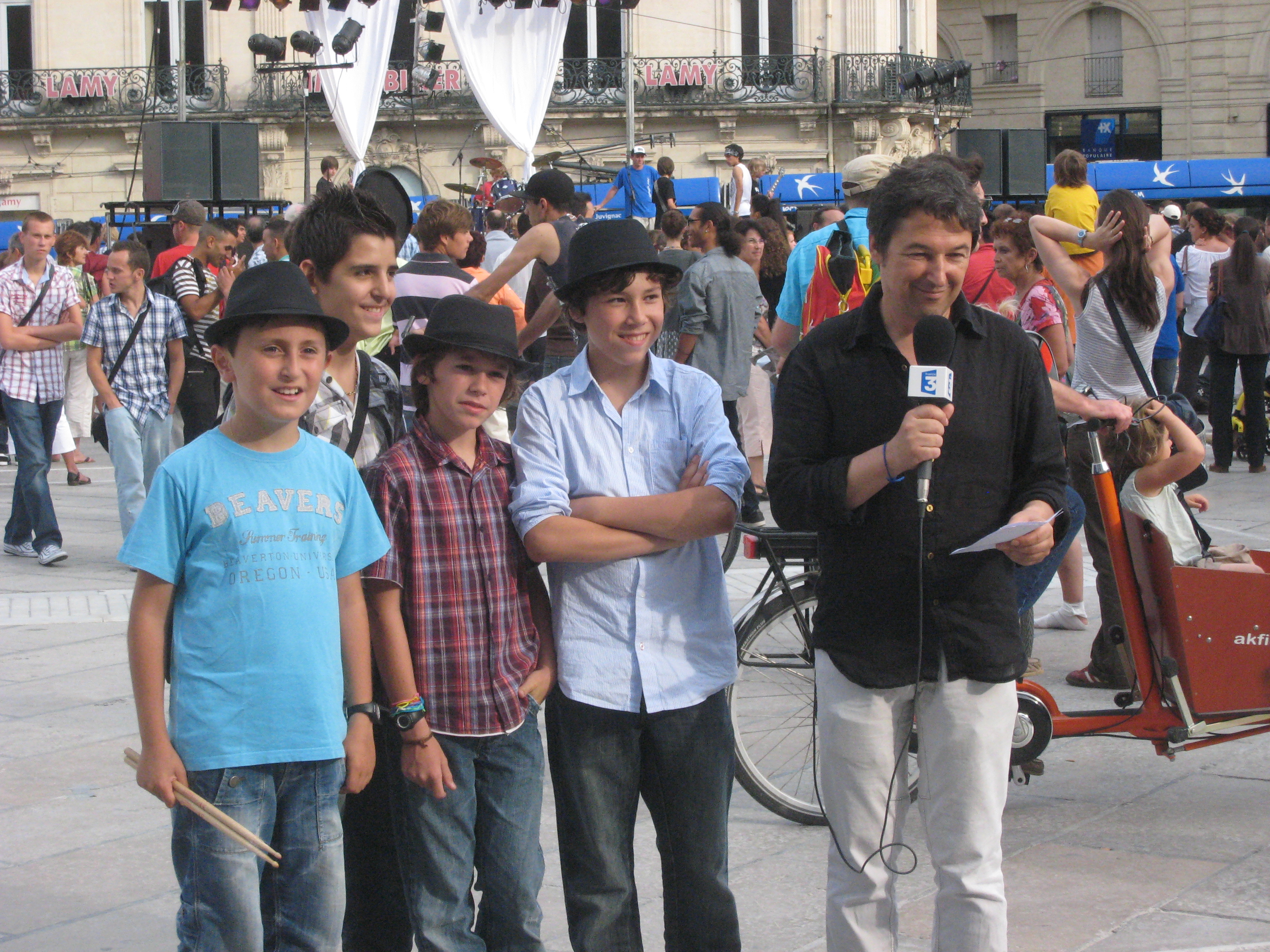 Puis il a fallu rejoindre la petite troupe des Garage Band pour participer au concert de la Fête de la Musique, place de la Comédie. Sans Marine… Expédition tramway, guitares sur le dos. Les garçons ont joué un peu comme des patates mais ont assuré le show en dépit d’aléas techniques, portés par un chouette public et sans se laisser impressionner par cette grande scène.  Le journaliste de France 3, enthousiasmé par le spectacle (Théophile a fait chanter le public sur Téléphone, le temps qu’Hervé, à plat ventre sur la scène, répare la pédale de la grosse caisse…), les a interviewé en direct sur le 19-20 ! Quelle aventure !!