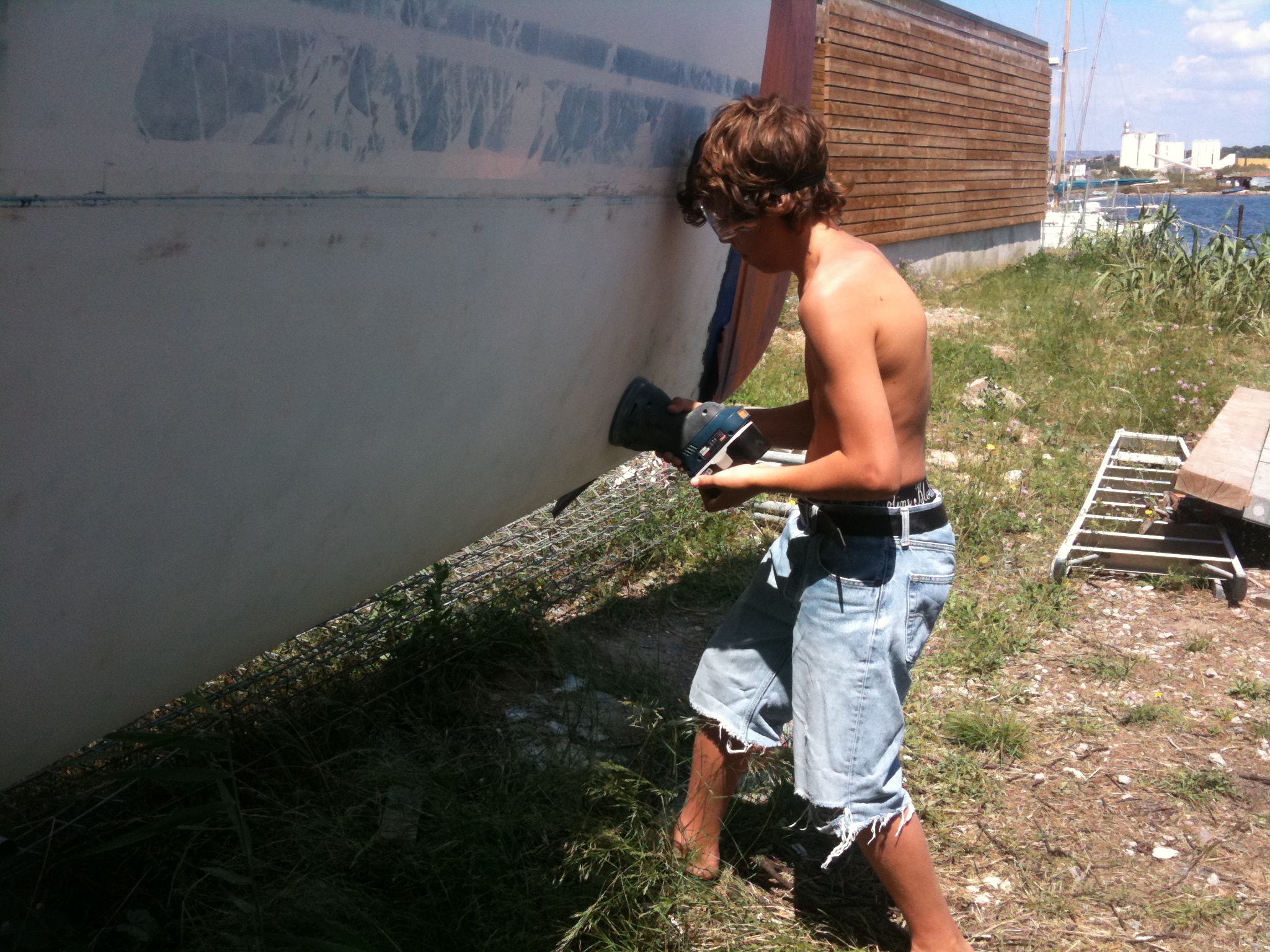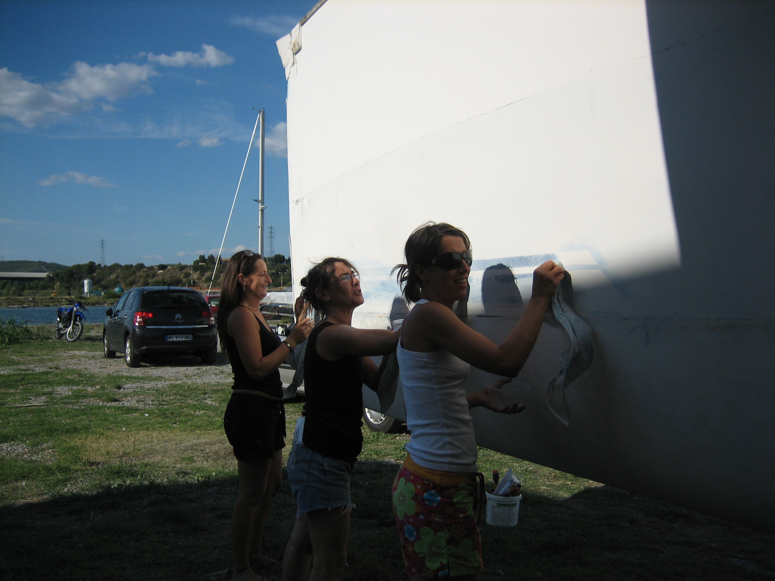 On dirait une fourmillière qui s’agite. Ca fait assez bazardesque, mais c’est très efficace : Cyril et Manu creusent 2 énormes trous sous les safrans pour qu’on puisse les descendre et changer les bagues, Paul ponçe inlassablement, les filles cassent leurs ongles sur les traces de colle très rebelles des autocollants, les 10 enfants papillonnent de l’un à l’autre.
