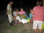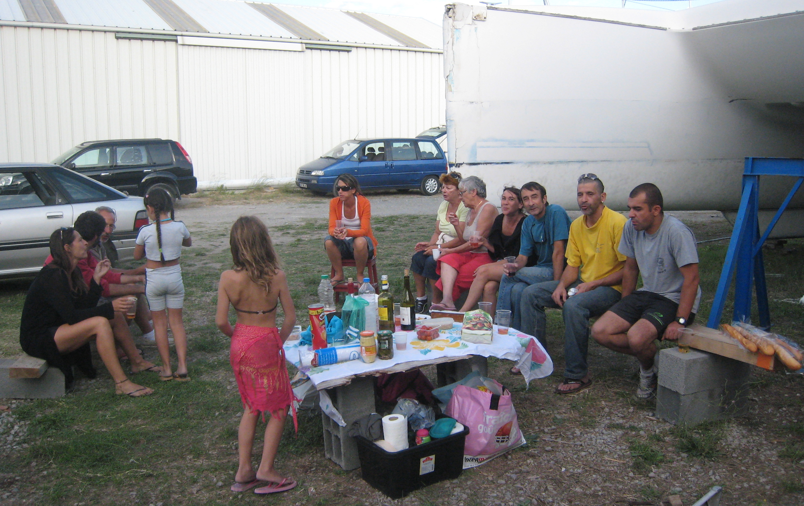 Annette et Marc nous rejoignent à bord de leur annexe pour le barbecue du soir. On bricole bancs et table avec ce qu’on trouve sur le chantier, système D un peu brut de décoffrage… Mais l’important est d’être ensemble et Juliette a même son gateau au chocolat préféré (merci Jen!), et ses cadeaux. Nous finissons la soirée à la lumière des phares des voitures, c’est très chic.