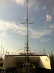 La cote du nouvel étai est envoyée dans la foulée au gréeur. En attendant, le mât est sécurisé avec les drisses (ça nous rappelle de tristes souvenirs d’abordage…).
