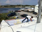 Toutes les cabines sont repeintes et seules quelques retouches sont à prévoir, dès que les cloisons étanches des pointes avant auront été refixées. Kiki dégaine le rouleau plus vite que son ombre : intérieur, extérieur, hélices, embases… laque, peinture de cale, primaire, antifouling… Isa peint comme d’hab : un peu les murs, beaucoup les mains et les jambes.