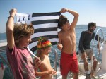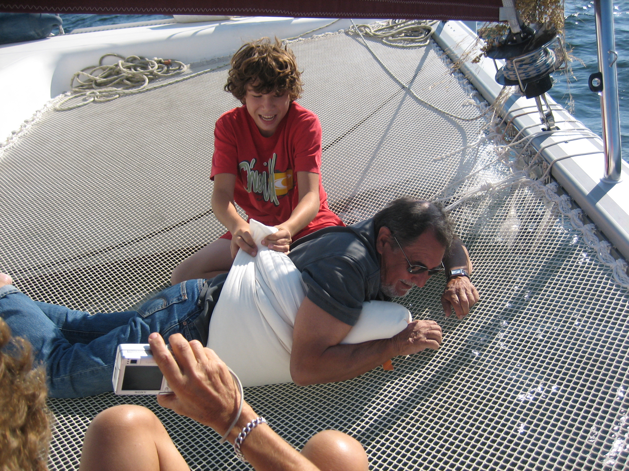 On frôle quand même le burn-out… Alors la sagesse l’emporte sur tous nos plans de départ en fanfare avec  les copains : nous décidons de passer tranquillement le dimanche sur l’eau, à balader avec nos parents (et Big Ben !), histoire d’en profiter encore un peu avant la longue séparation qui s ‘annonce. C’est une très belle journée. Et tous les copains qui devaient nous accompagner comprennent que c’est important de se préserver ce petit moment de transition. Théophile perd son oreiller en chemin (étonnant, non ?), nous obligeant à une manoeuvre olé olé de récupération qui ne doit son succès qu’à l’intervention in extremis d’un bouzigaud, venant à bord de son zodiac nous dire au revoir…
