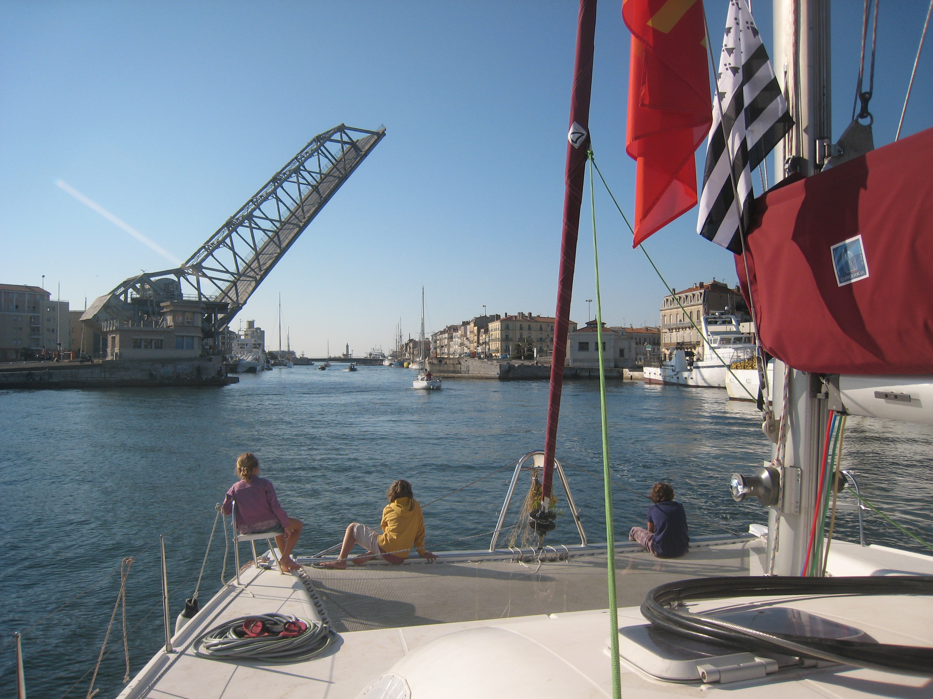 Une fois passés les ponts, nous nous arrêtons brievement dans le port de Sète pour le plein de gasoil. On rigole 2 minutes pour amarrer ce gros bateau au tout petit ponton. Puis c’est la mer, enfin ! Sète s’éloigne doucement. Sensation étrange, on n’a tellement pas l’impression de partir pour 10 mois ! La navigation est très tranquille et les enfants peuvent s’amuser sur le trampoline.