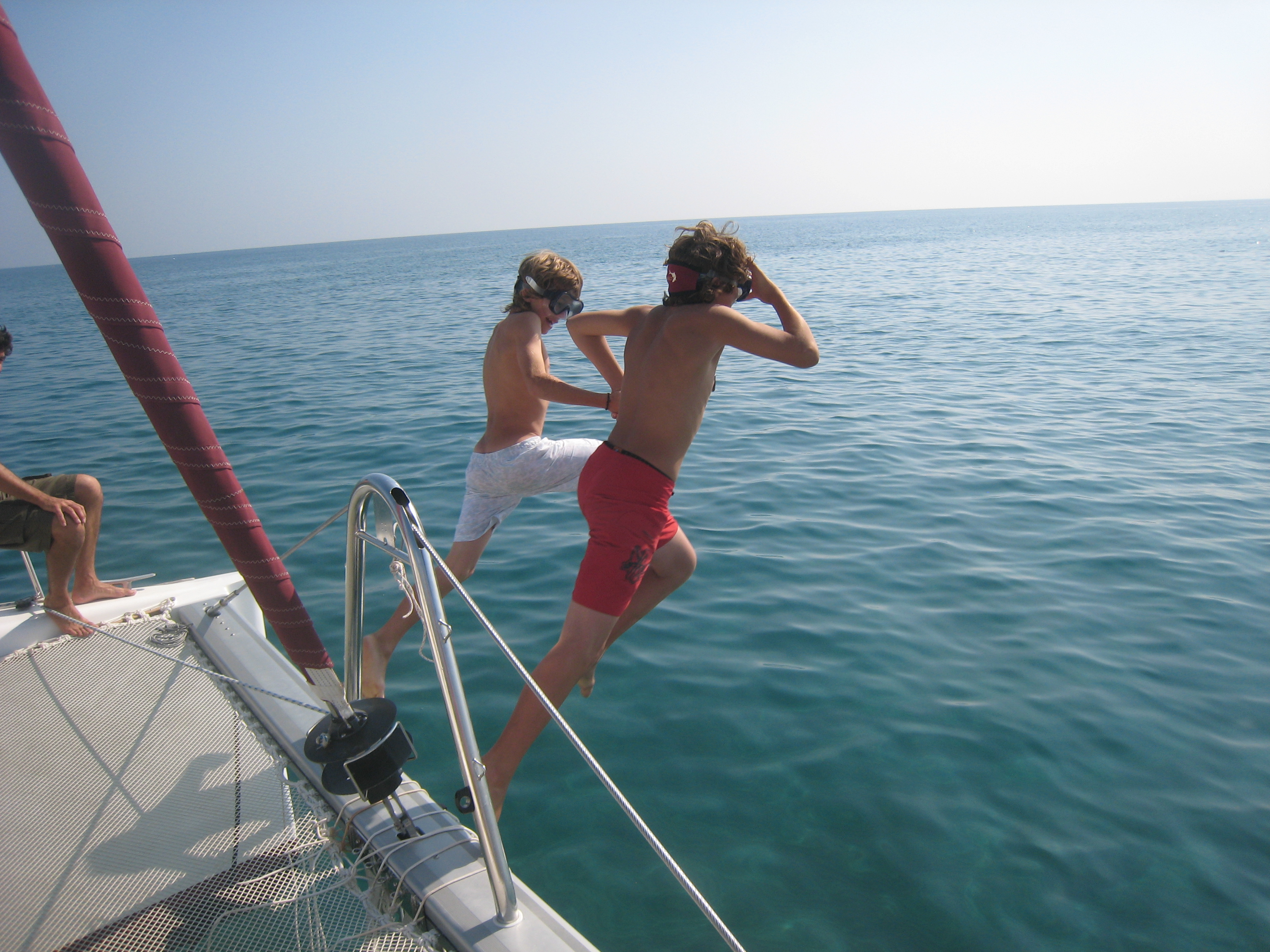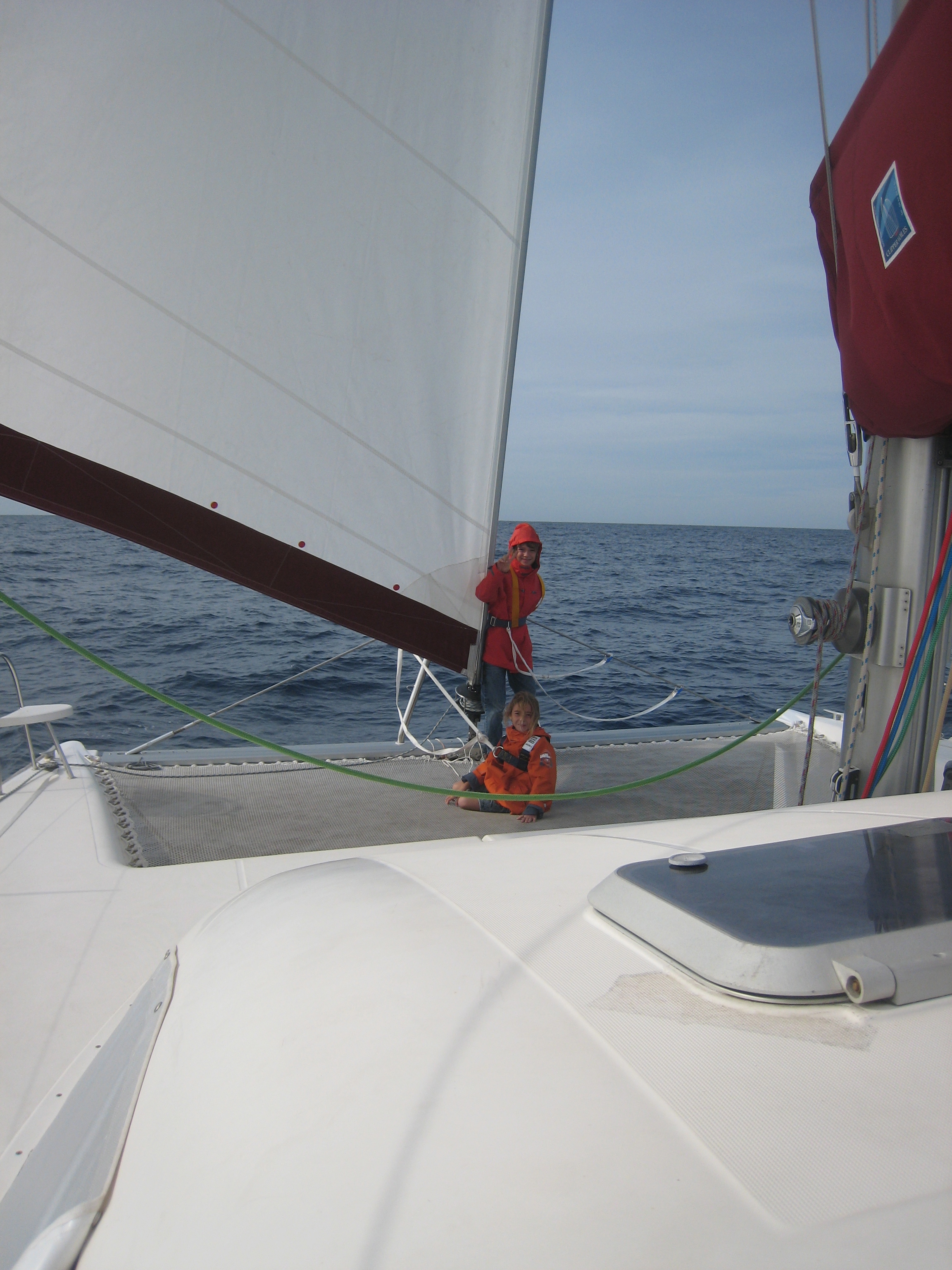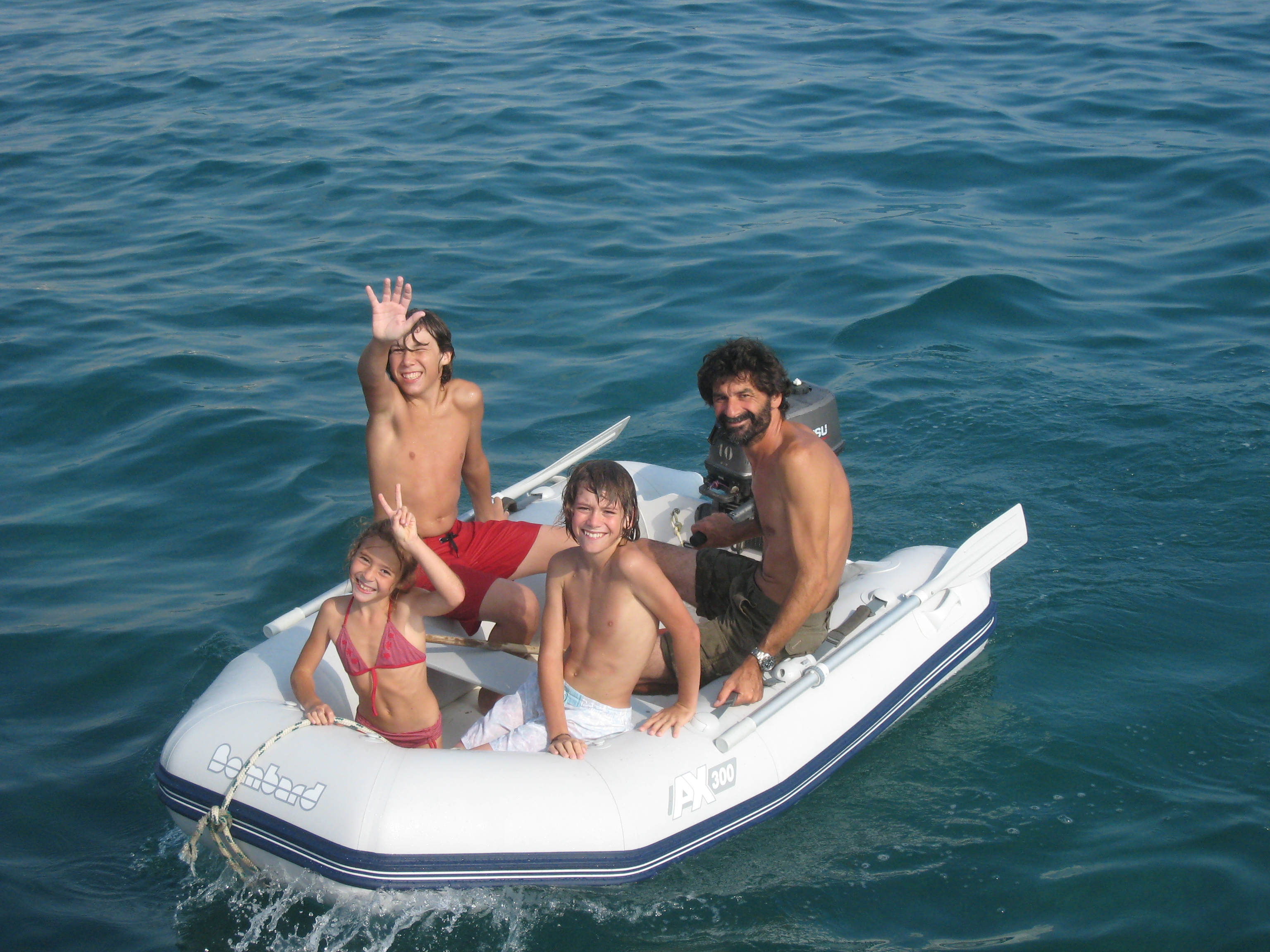 Cned sur l’eau après cette première nuit de navigation. Marin bat des records de lenteur sur son évaluation de techno: 3h30 , et ça n’est même pas vraiment terminé… En revanche il a bien regardé le paysage, compté inlassablement ses orteils, raconté des histoires … Ca va pas être drôle tous les jours…. Nous devons nous arrêter à Port Ginesta pour un stop technique (on ne peut plus se passer d’Accastillage Diffusion…). L’eau est si transparente aux abords de la côte que les enfants ne résistent pas à l’appel de la baignade (ce qui est d’autant plus courageux que des méduses très curieuses tournent autour du bateau… ). Juliette reste vaillamment sur le pont et attend que son papa l’emmène faire un petit tour de zanzibarquette pour récupérer les garçons sur la plage (ils ne semblent pas décidés à renouveler l’exploit de leur traversée à la nage au milieu des bestioles qui piquent !).