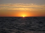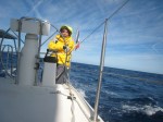 Grosse houle de travers (mais moins de vagues cassantes), 15-20 noeuds au portant : sous grand voile + génois, Zanzibar file à 8-9 noeuds tranquille. Ca secoue. Juliette en tombe même dans la pointe avant depuis la couchette de son frère : elle appelle au secours, les fesses dans le trou, il n’y plus que sa trombine qui dépasse, c’est très drôle (pour ceux qui regardent…).