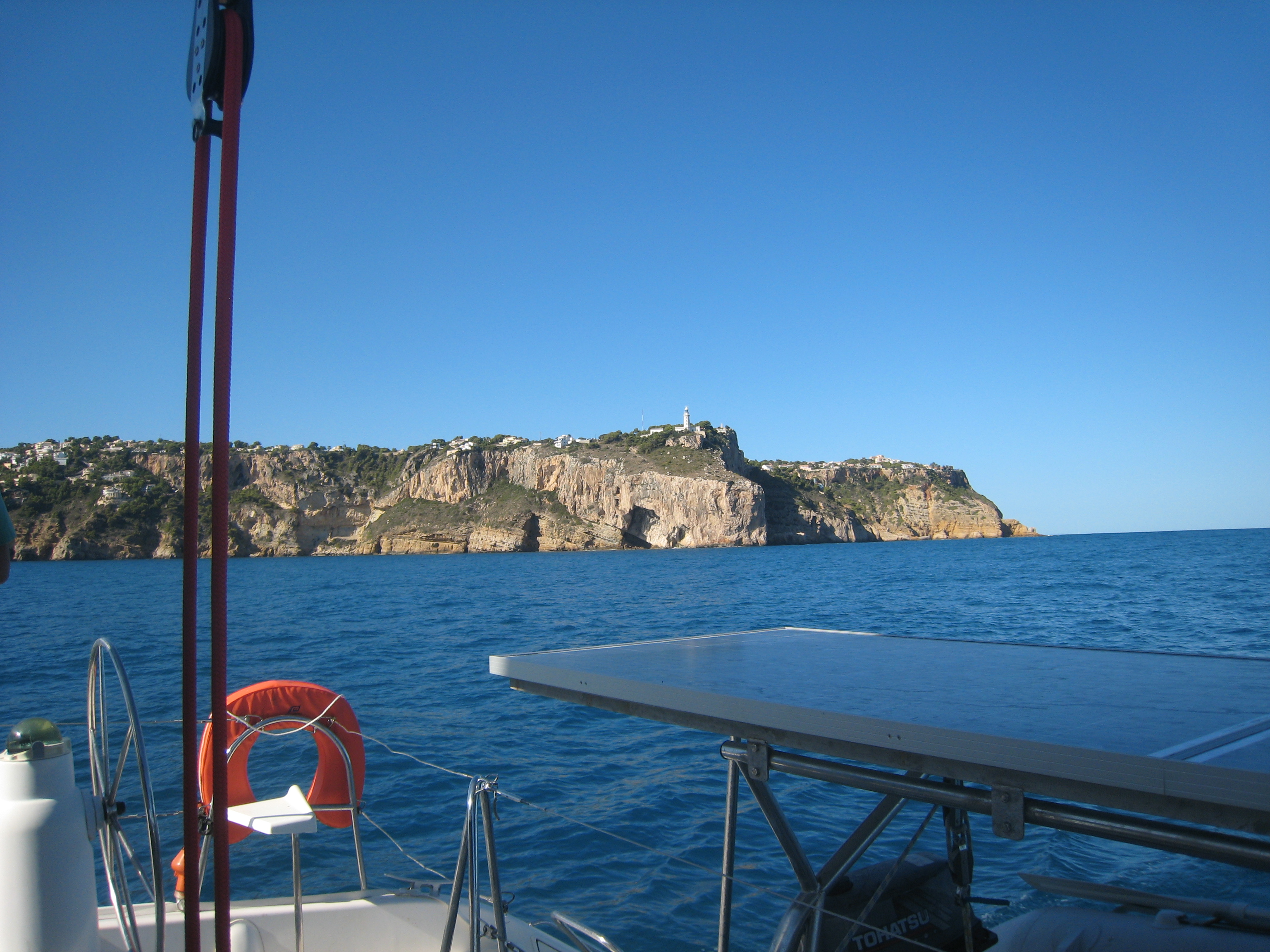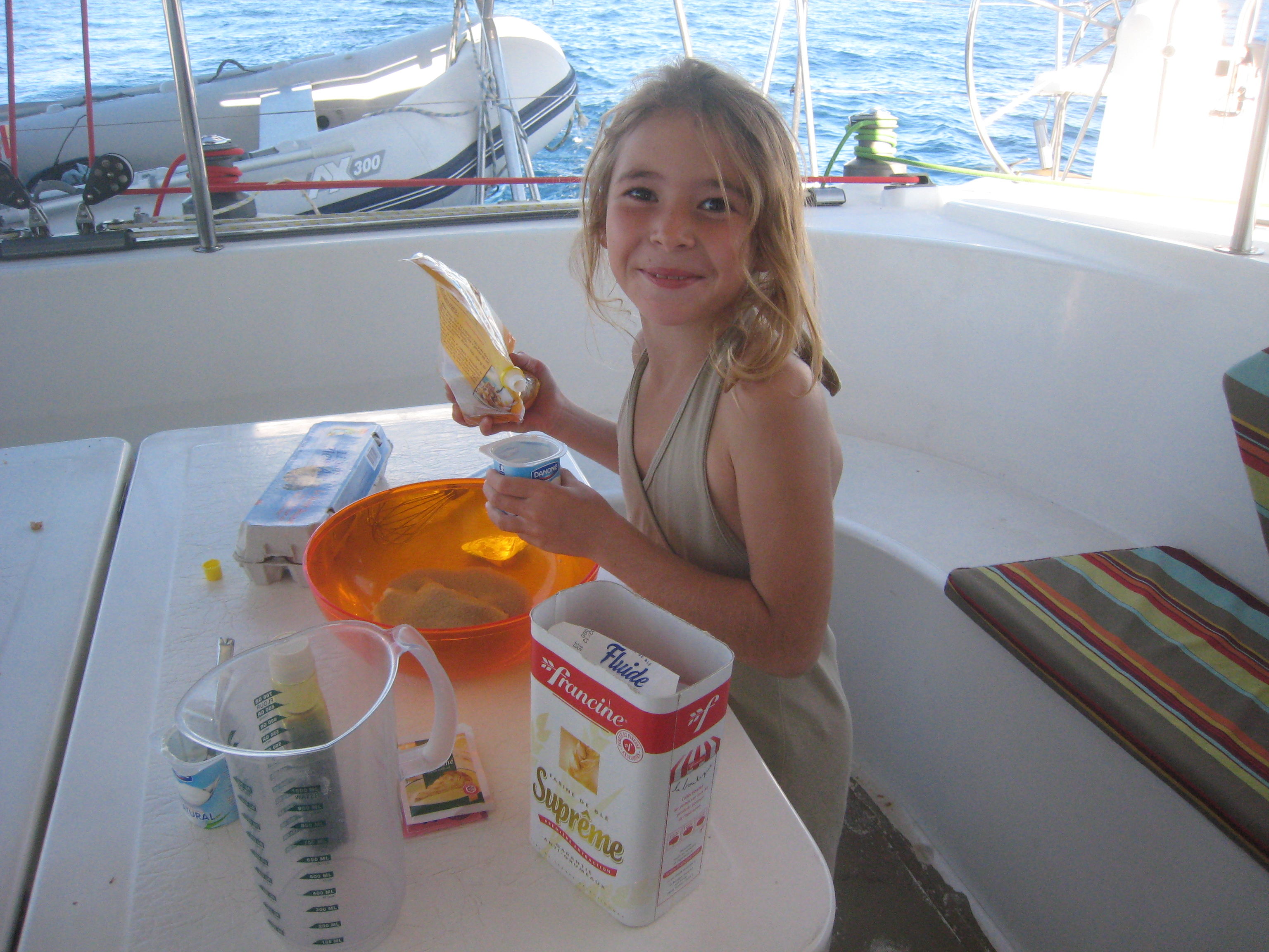 Passage du cap de la Nao. On se rapproche de la côte pour admirer le paysage : les falaises se jettent dans la mer, c’est grandiose. Le vent et la mer se calment, on doit même avancer au moteur… Et ça va durer quelques heures comme ça. On en profite pour cuisiner et bricoler. Juliette fait le gateau d’anniv de son papa. Manu installe la balise de tracking, une partie des fermetures des portes de placard (après deux jours de mer agitée, c’est devenu la priorité n° 1 pour que les objets arrêtent de voler intempestivement…), et plein d’autres trucs et bidules. La nuit est claire et très très calme, pas de vent, la mer d’huile… un peu de brume à babord (brrrrr) mais les lumières de la côte au loin à tribord. Et un ciel étoilé magnifique. Plusieurs feux d’artifices s’élèvent le long de la côte, c’est impressionant.
