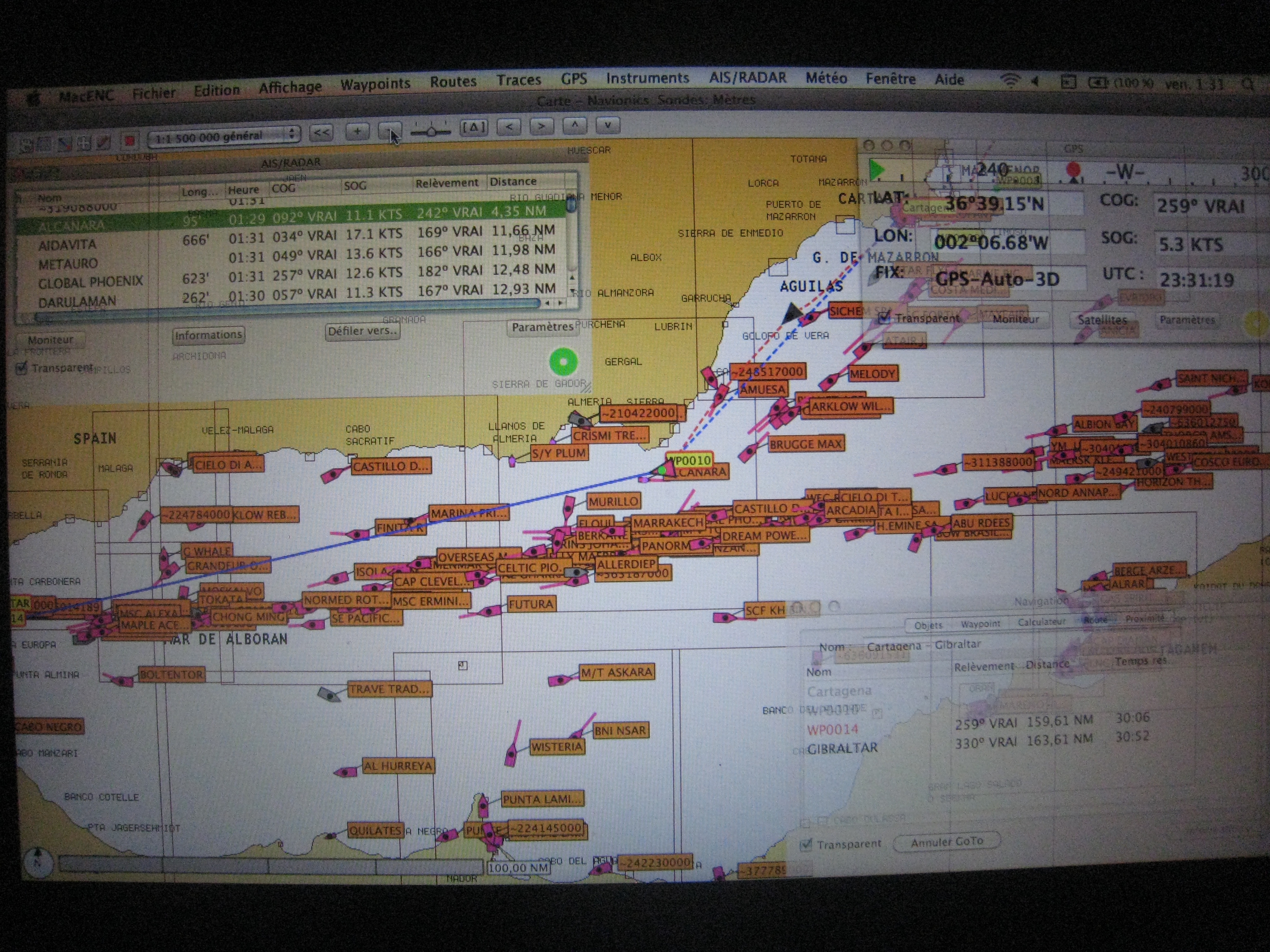 Mer d’Alboran. Panne du pilote automatique vers 5h30. Je relaie Manu vers 6h00, un peu gelé à la barre. Il reboot le système et ça repart, mais il doit bien y avoir un petit problème de faux contact qui traine…
