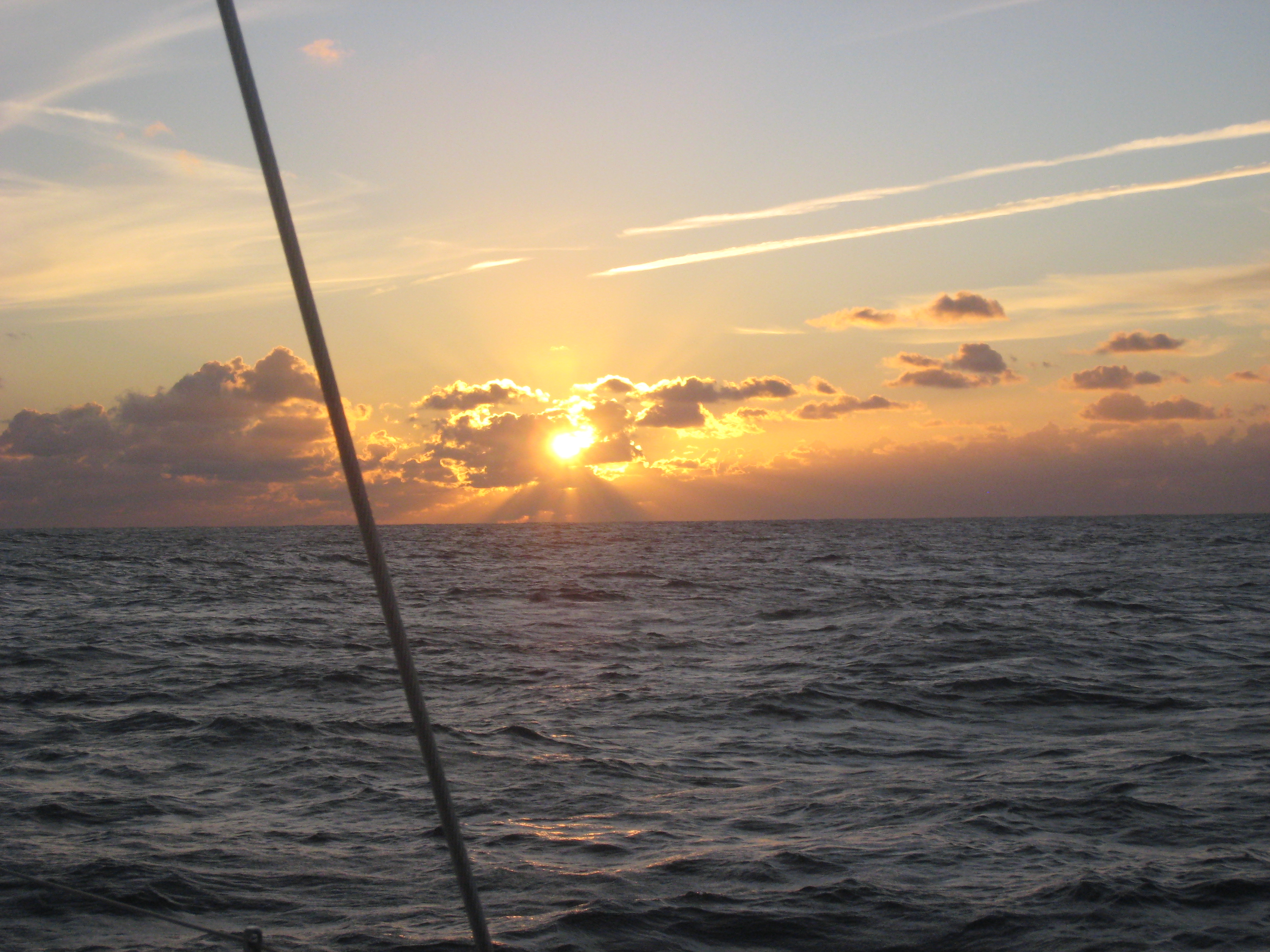 Alors que le jour décroît franchement , on aperçoit un des bateaux-copains en galère : ils se sont pris dans un filet dérivant. Tant que nous ne sommes pas assez éloignés des côtes, c’est un problème récurrent. Ces filets, même signalés par une petite bouée rouge clignotante, sont la calamité des bateaux : on ne les voit qu’au dernier moment et il est souvent trop tard pour manœuvrer. Pris dans les hélices ou les safrans, ils obligent souvent les capitaines à plonger pour aller bricoler sous le bateau (pas un truc de fille tout ça). Et quand l’eau est à 15, qu’il fait nuit et qu’il y a des vagues… les capitaines regrettent souvent de ne pas pouvoir envoyer leurs femmes sans que leur image en prenne un méchant coup… Et leurs femmes leur en sont tellement reconnaissantes !