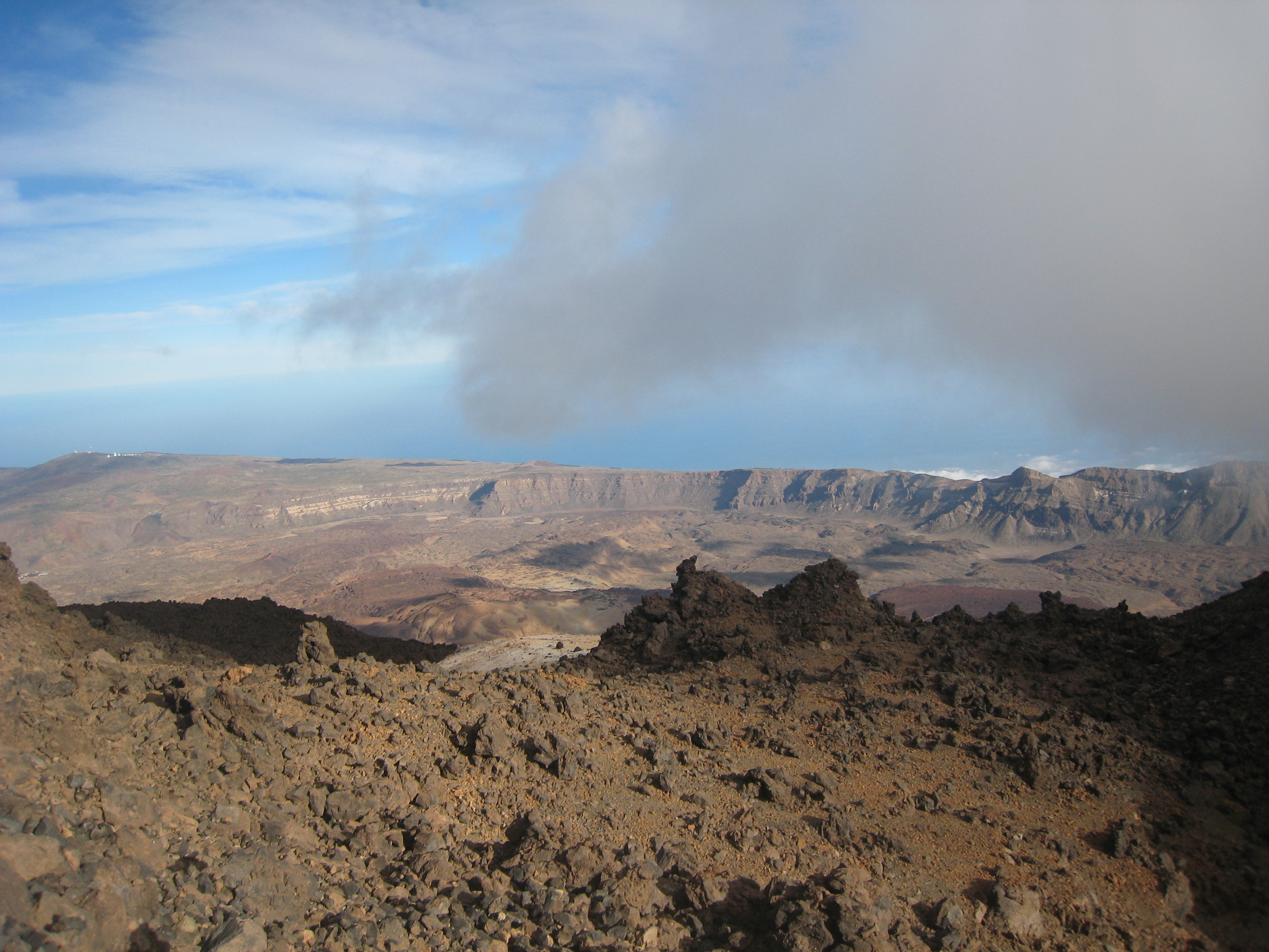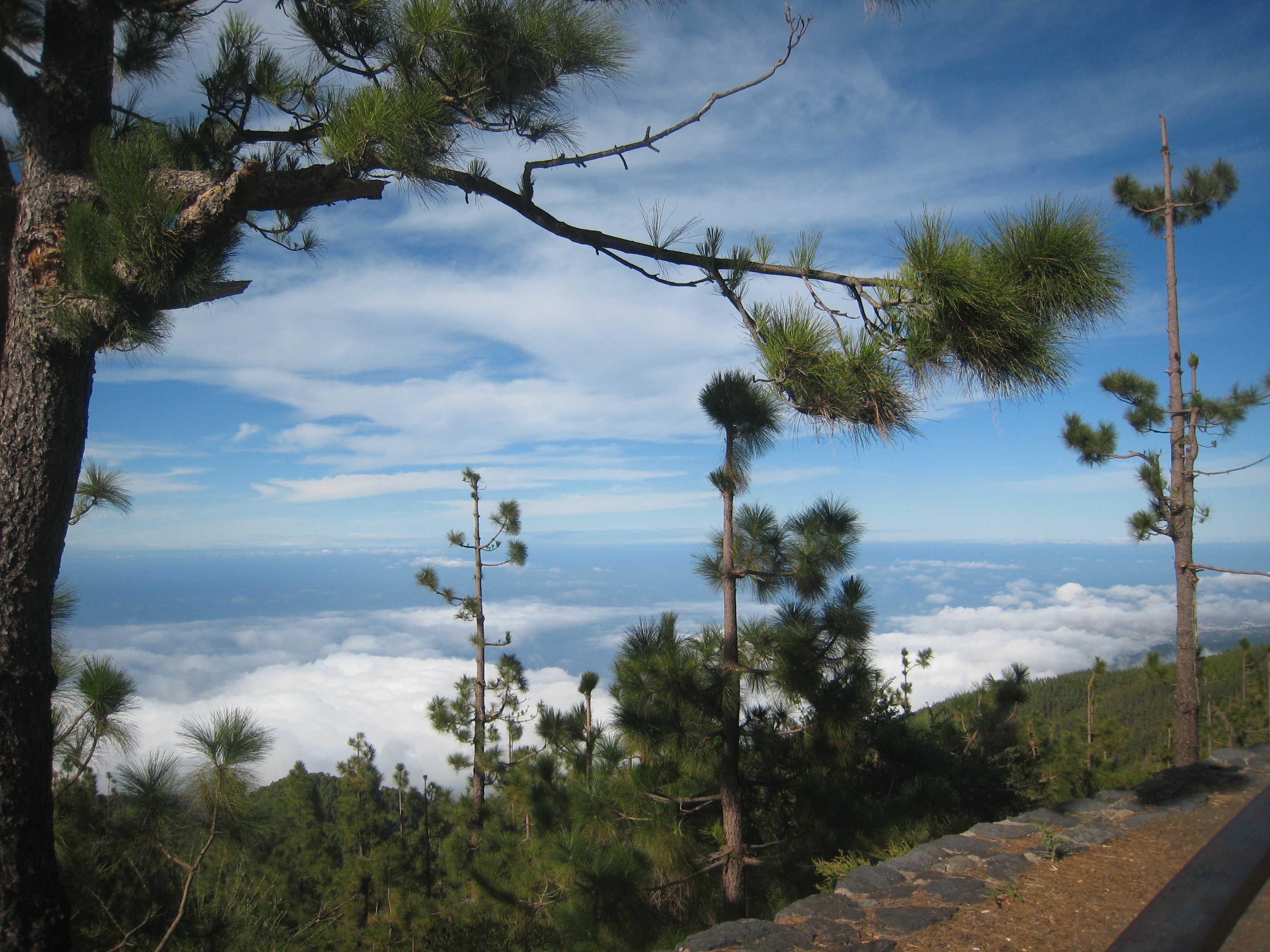 Nous partons, picnic en bandoulière, à l’assaut du Teide. La route des crètes est magnifique, découvrant à chaque virage un panorama unique. Le ciel bleu et l’excellente visibilité nous permettent d’admirer Gran Canaria, La Palma (où nous n’irons finalement pas), La Gomera… Nous traversons une forêt d’eucalyptus à faire pâlir d’envie tous les pandas d’Australie. A mesure que nous prenons de l’altitude, la végétation se fait plus rare et fait bientôt place aux lichens et bruyères qui tentent d’envahir les sols volcaniques.