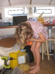 Il fait moche, ciel couvert et pluie. Les alentours de la marina se limitent à des résidences et des golfs, tout est loin et difficilement accessible à pied. Et on abandonne l’idée de louer une voiture en raison des prix prohibitifs. Coincés à s’occuper du bateau, des gosses et du cned… Y a ambiance sur les pontons ! Sauf pour les enfants, qui pêchent des crabes dans le port pendant des heures, jouent de la guitare, courent d’un bateau à l’autre en rigolant, fouillent les poubelles pour fabriquer des engins flottants non identifiés… et ne semblent pas perturbés le moins du monde par l’atmosphère un peu morose. Ni d’ailleurs par les trucs qu’ils pourraient faire pour aider ne serait-ce qu’une minute dans la journée (laver le pont, ranger un peu leur bazar,  recopier leurs évaluations…). Pas étonnant qu’ils aient cette mine réjouie !