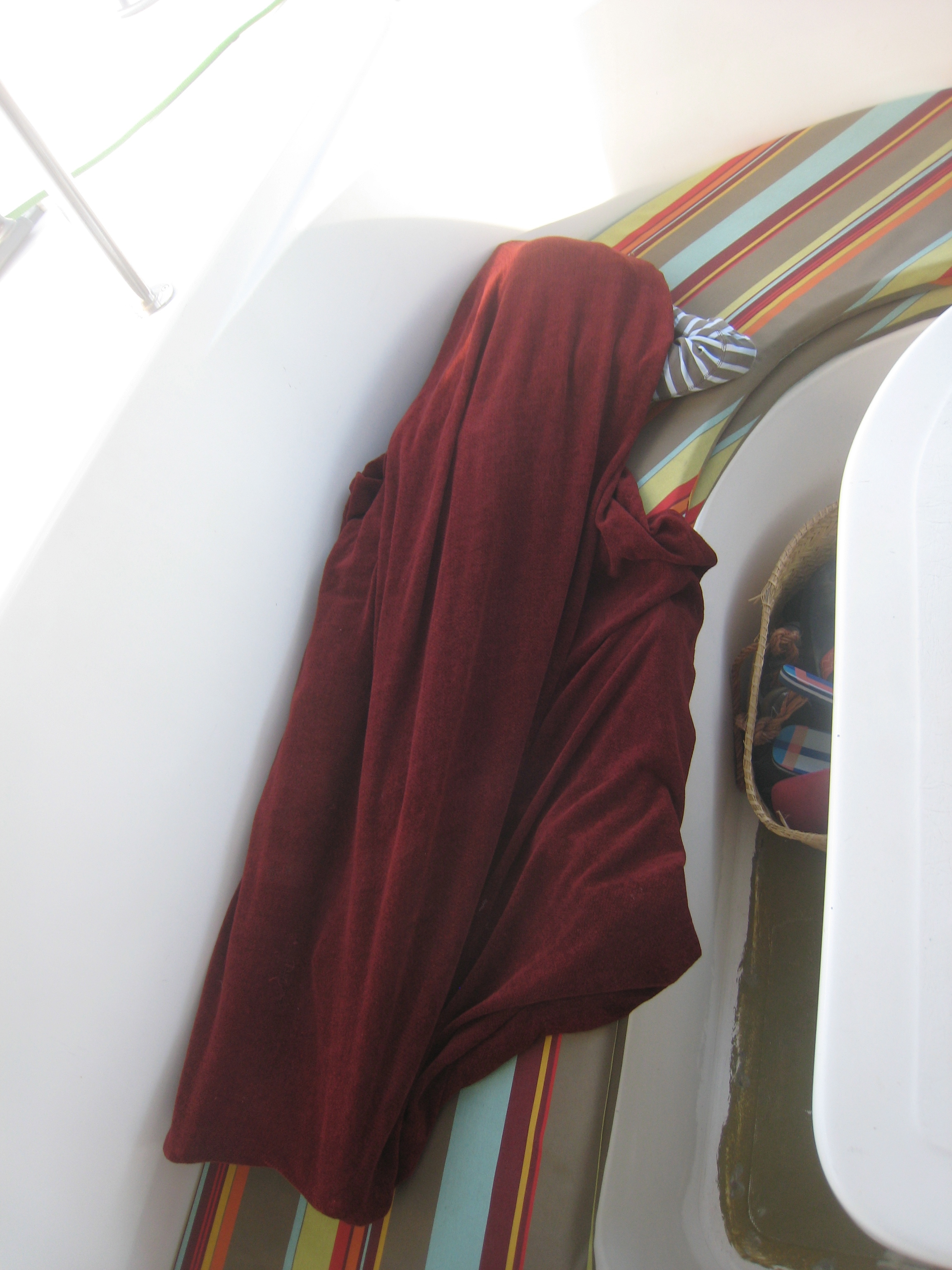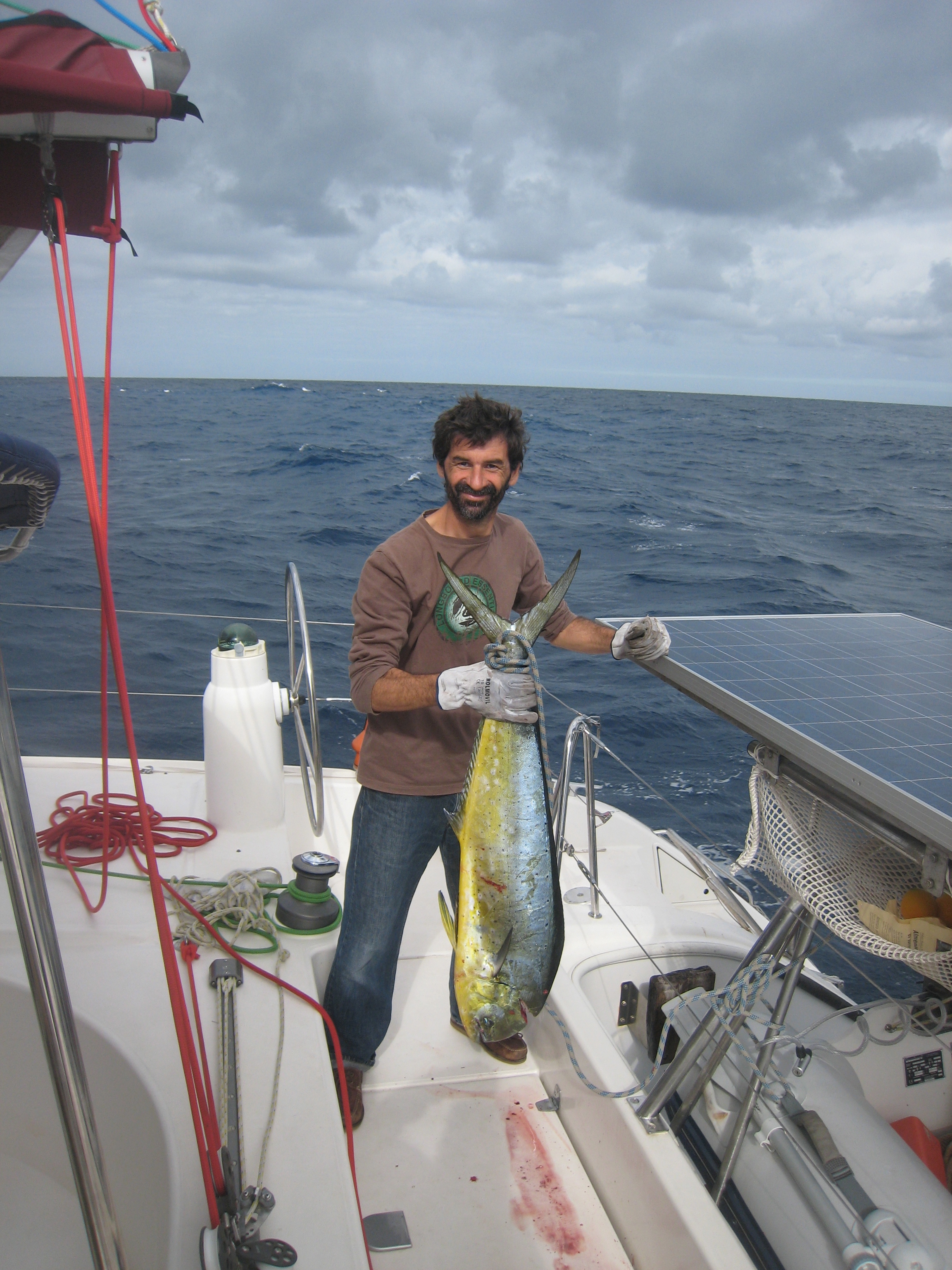 Réveil tonitruant pour les enfants, que j’appelle au secours depuis le poste de barre : un poisson ENORME se débat au bout de la ligne et je ne risque pas de le remonter toute seule à mains nues. Manu, qui vient de retourner se coucher, arrive à la rescousse et hisse à bord une magnifique dorade coryphène. Pendant qu’on contient difficilement l’excitation de Marin et de Juliette dans le cockpit, Théophile essaie d’abréger les souffrances de l’animal. Impossible de retrouver la « barre-à-assommer-le-poiscaille », il essaie donc comme il peut (et avec courage !) … au gros couteau de cuisine. Manu ligote la Bête qui se tord, s’agite et essaie frénétiquement de retourner à la mer. Théophile vise la tête (du poisson) mais j’ai vraiment peur pour ses pieds (à lui !). Et j’ai raison : dans un dernier sursaut, notre belle dorade lui croque les orteils !… Vision d’horreur que cette lutte acharnée au petit matin, alors que les vagues font rouler le bateau et que le sang gicle partout sur le passage arrière… Mais quel trophée : 1 mètre tout rond (ou tout long), presque une Juliette ! Et presque plus lourd que notre sirène. On va manger du poisson pendant 3 jours au moins.