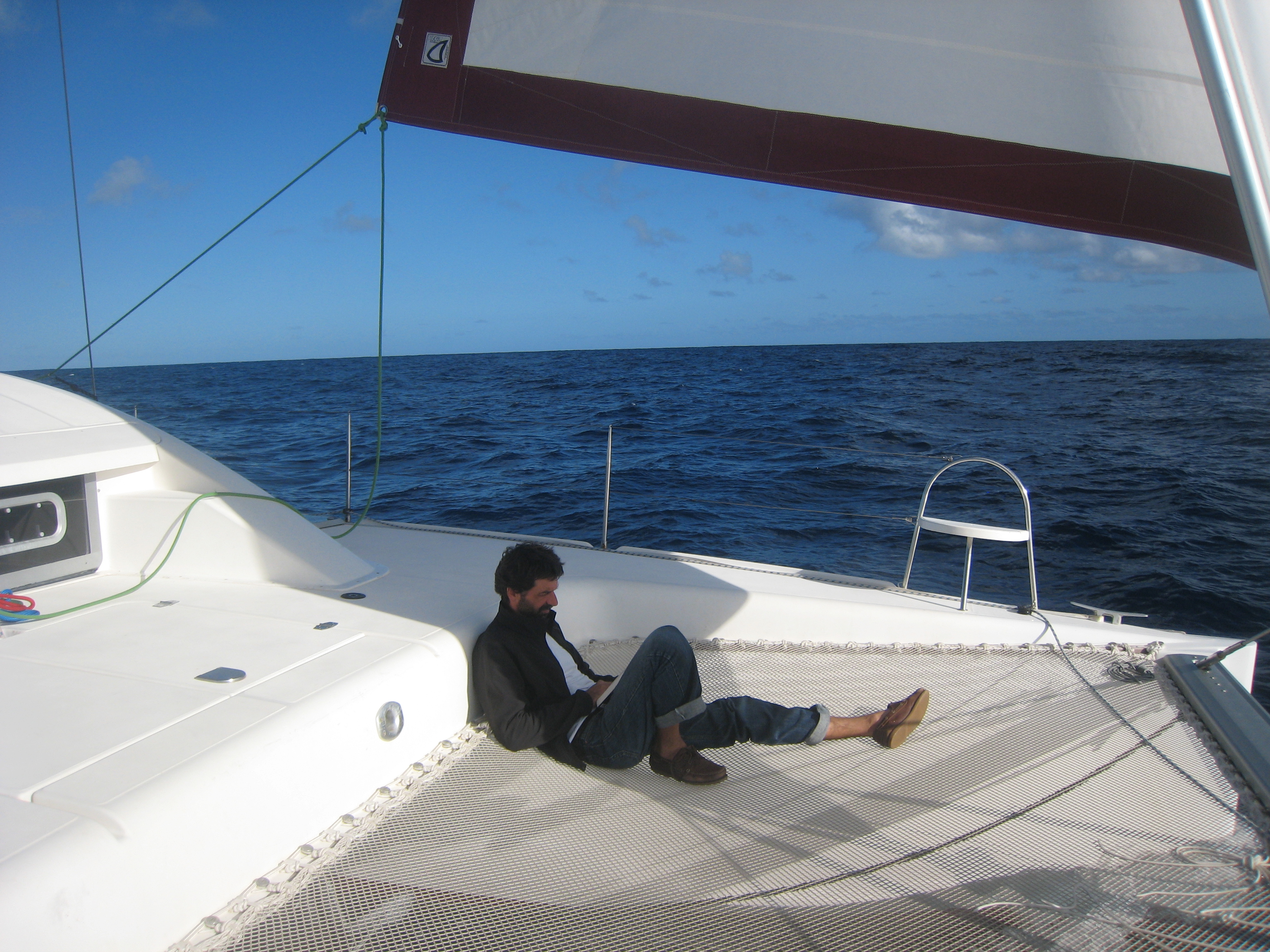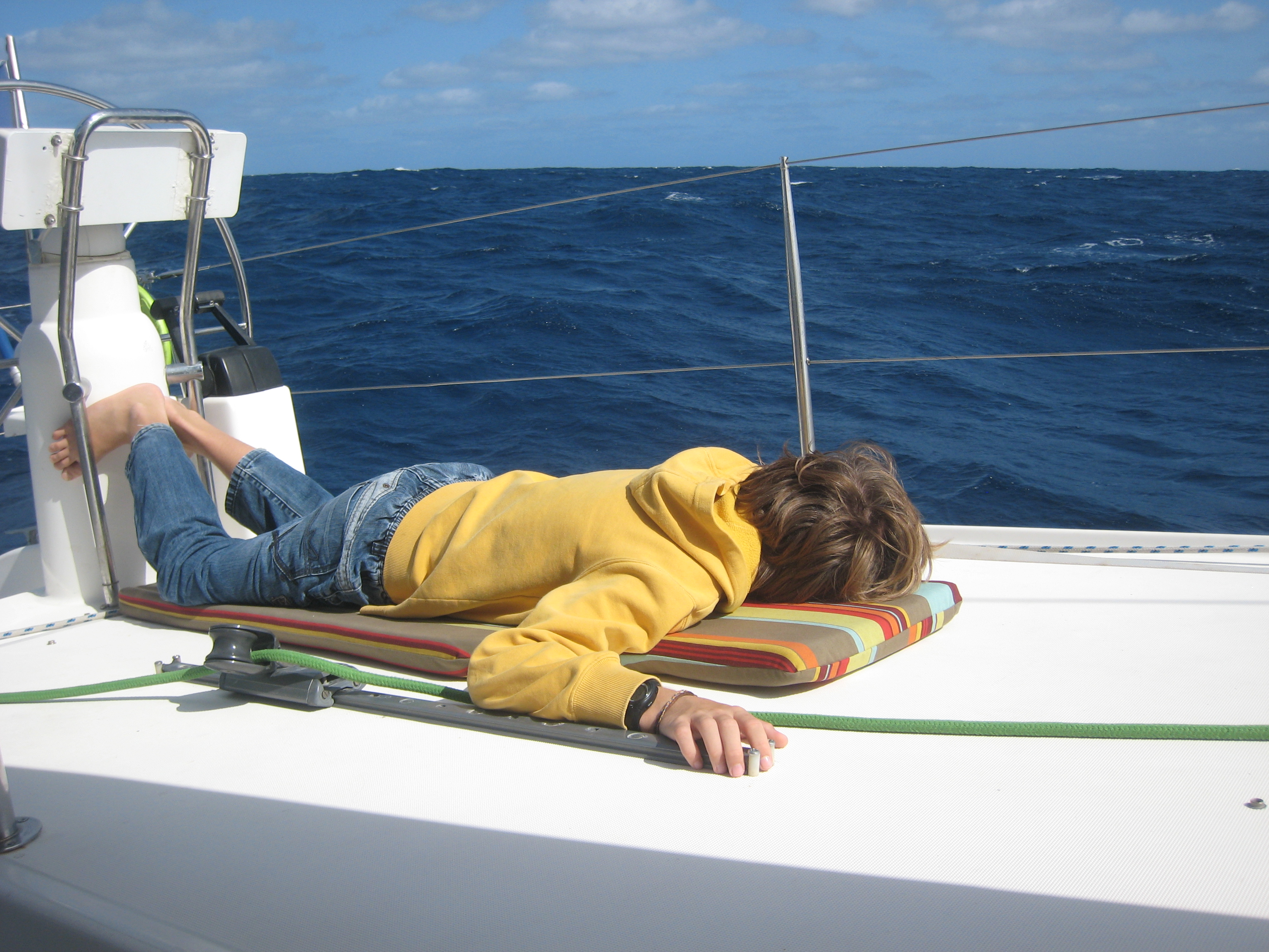 ça tellement magique et poétique, cette mer d’huile scintillant sous la pleine lune (bref, un truc de fille, quoi). Je n’avais pas pensé que la lune n’est pas toujours haute dans le ciel, que les nuits sont parfois tellement noires qu’on ne voit pas la mer autour du bateau, que la houle ne s’arrête jamais ô grand jamais, qu’un force 6-7 est beaucoup plus impressionnant dans le noir… et qu’on n’a encore rien vu ! Mais heureusement que je n’y avait pas pensé, sinon nous ne serions pas là, ce serait dommage.