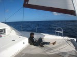 Joyeux anniversaire Tatie ! Désolée, tu n’auras pas de gâteau, une flemme hallucinante a atteint tout l’équipage… Depuis 2 jours déjà une houle forte et hachée rend tous les mouvements pénibles et fatigants. Pas de cned (même à l’oral), repas réduits au strict minimum (on tape direct dans le plat pour limiter la vaisselle), on regarde les grosses vagues et on laisse passer le temps. Les enfants fabriquent des bracelets brésiliens pendant des heures et reprennent inlassablement le jeu de rôles inventé avec Jules et Billy avant notre départ. Nous poursuivons nos essais de réglage des voiles et avançons suffisamment rapidement pour commencer à envisager sérieusement une arrivée demain soir (et s’éviter ainsi une nuit de veille supplémentaire).