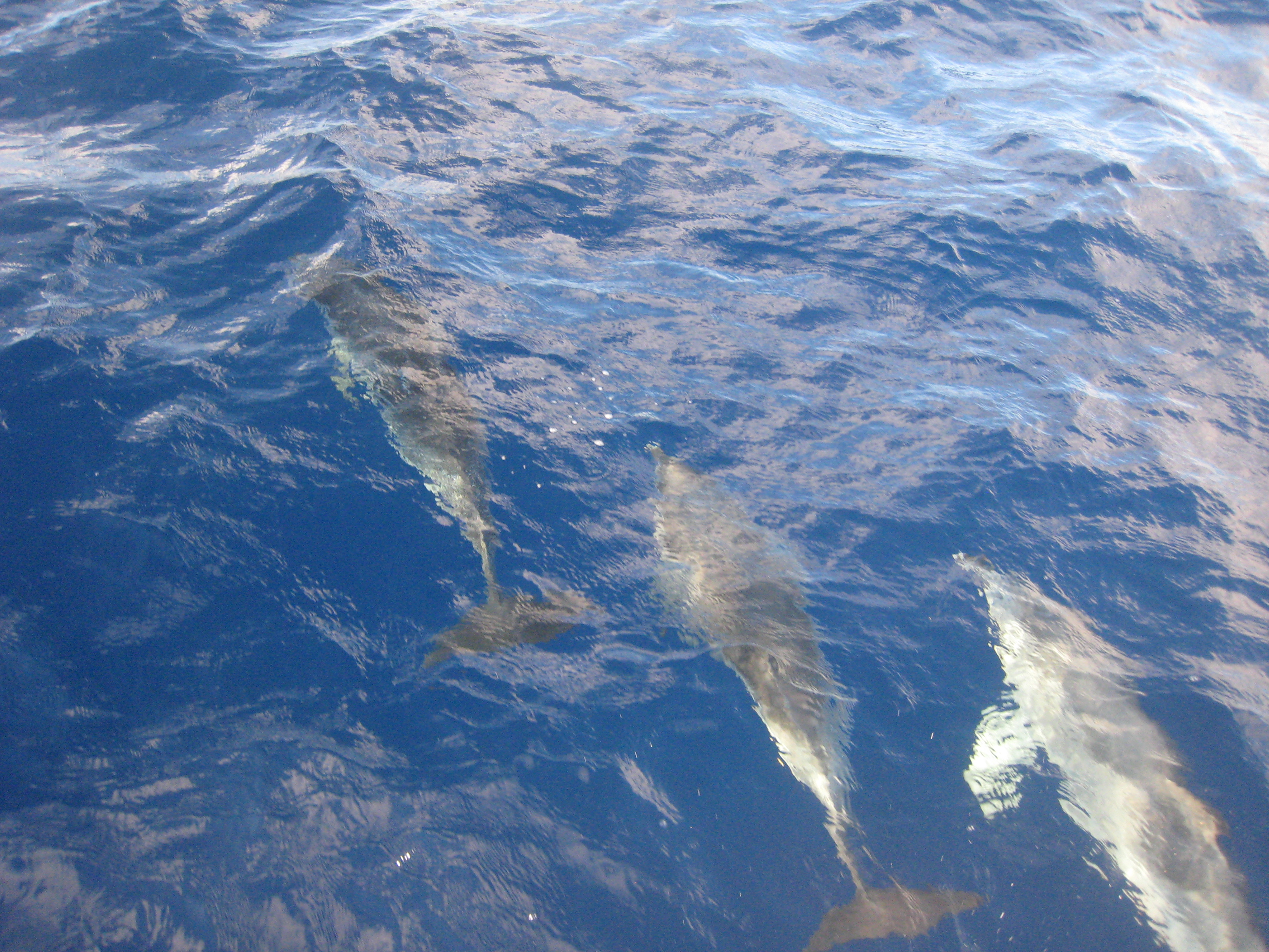 La houle s’est aussi un peu calmée. Nous nous précipitons aux fourneaux (lasagnes !) et enchaînons les séances de cned à l’oral (écrire reste encore parfois un exercice périlleux). Nous sommes interrompus par le spectacle grandiose d’une bande de dauphins qui semblent vouloir nous accompagner un bout de chemin : ils jouent longtemps dans les sillages de Zanzibar, puis sautent à quelques centimètres de étraves ! C’est magnifique !