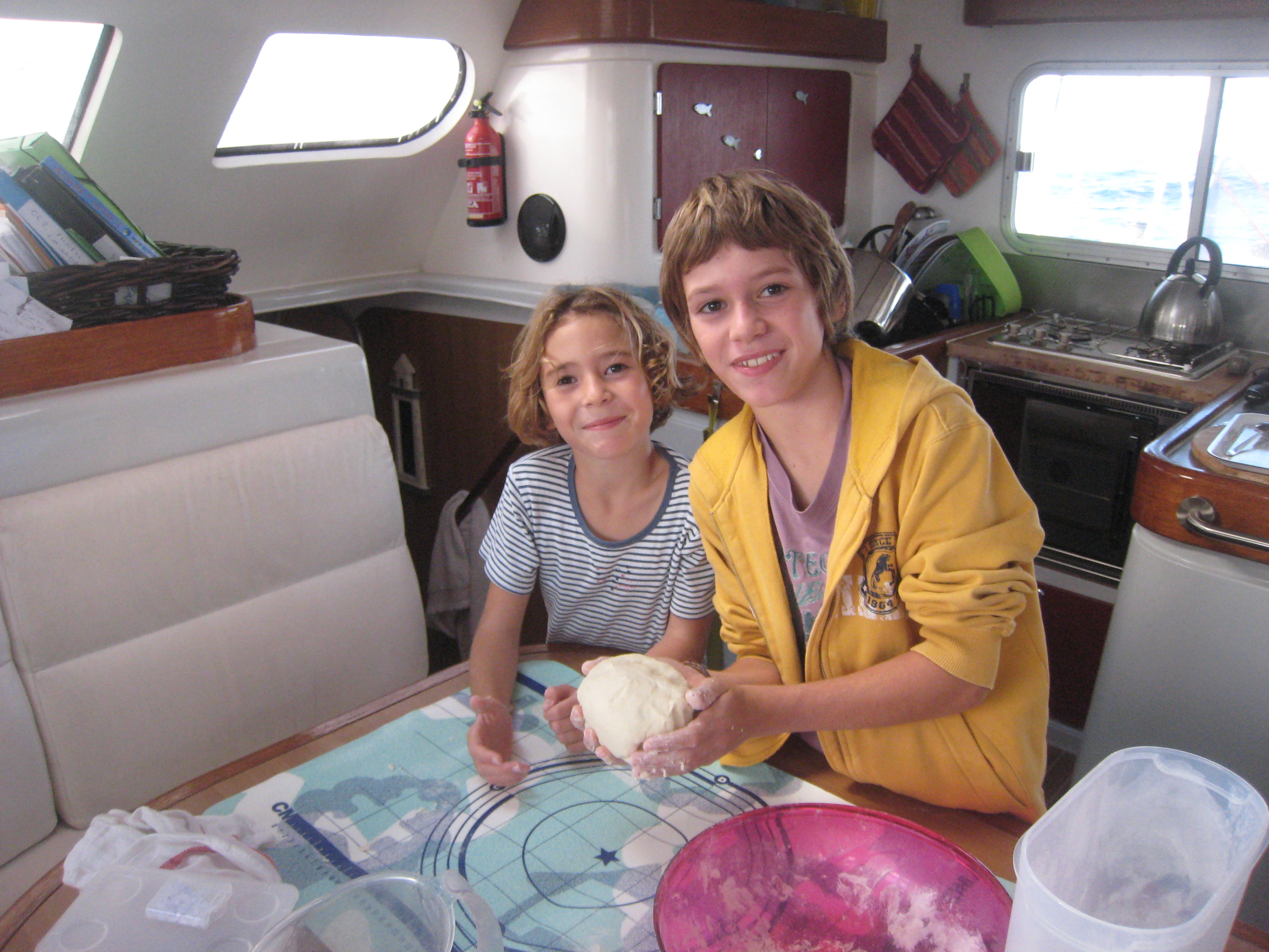 Nous sommes surpris que les enfants ne se plaignent pas de ces longues journées de navigation et qu’ils soient si « paisibles » : ils s’occupent avec rien ou pas grand chose, inventent des jeux, se chamaillent… Les mouvements du bateau et le bruit violent des vagues ne les détournent pas de leur petite vie, ils ramassent ce qui est tombé, rattrapent au vol ce qu’ils peuvent, et recommencent à jouer sans se poser plus de question. Ce qui ne les empêche pas non plus d’évoquer souvent tout ce qu’ils feront dès qu’on retrouvera la maison… et de s’inquiéter de leur liste au Père Noël !