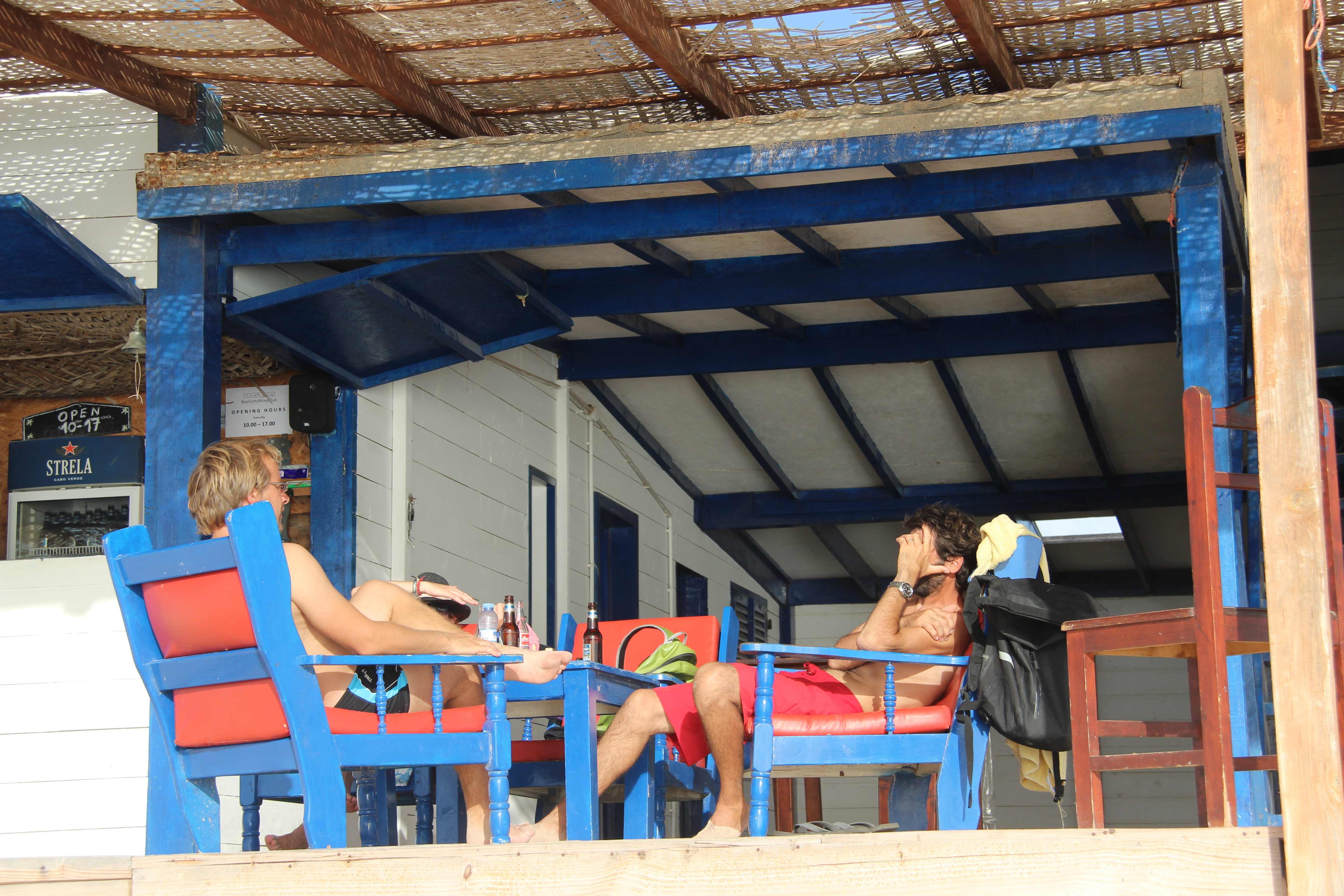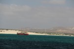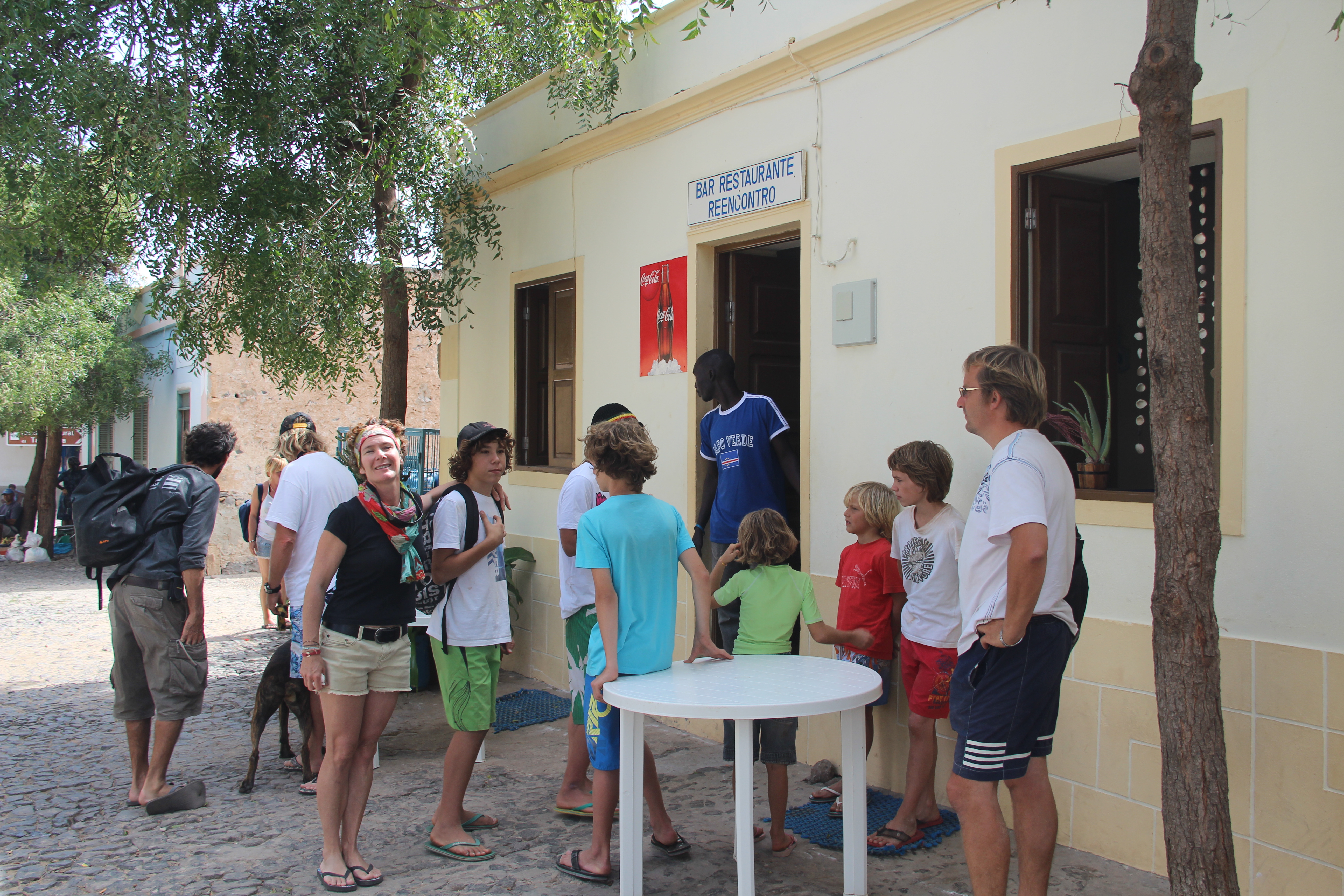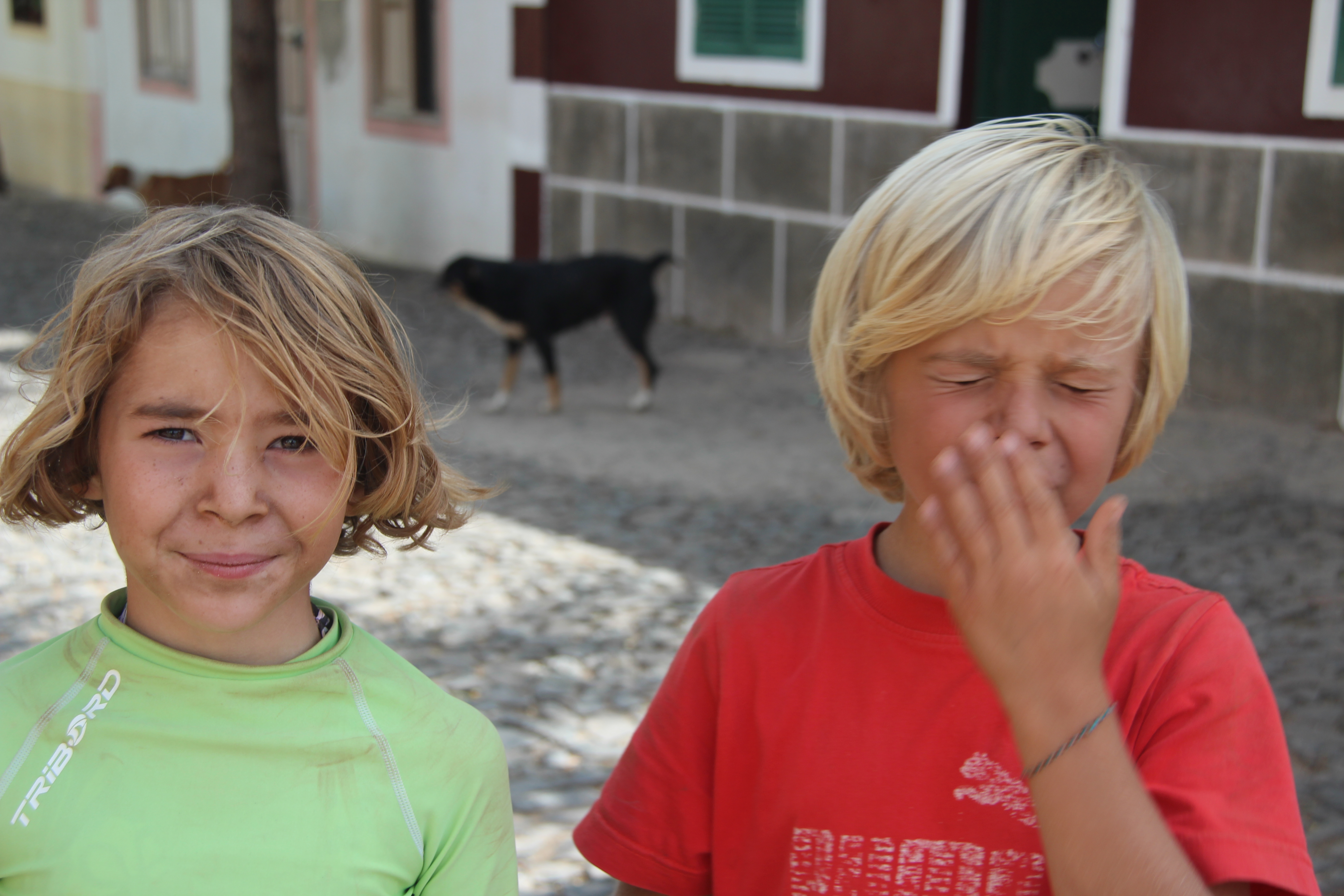 Nous jetons l’ancre par 4 mètres de fond à peine. Le mouillage est venté, bien que pourtant abrité du vent de Nord-Ouest qui souffle sans faiblir, mais le paysage est plutôt sympathique et dépaysant : le village de Sal del Rei affiche ses maisons et ses barques de pêches colorées, puis la plage s’étend loin au sud, déroulant ses dunes de sable fin au dessus des eaux turquoises. Nous sommes sous le charme. Quelques cabanes sur la plage témoignent de l’orientation touristique de l’île : nous profiterons d’ailleurs sans scrupule des terrasses ombragées pour réfléchir à notre avenir en sirotant des bières, pendant que les enfants se rouleront inlassablement dans le sable.