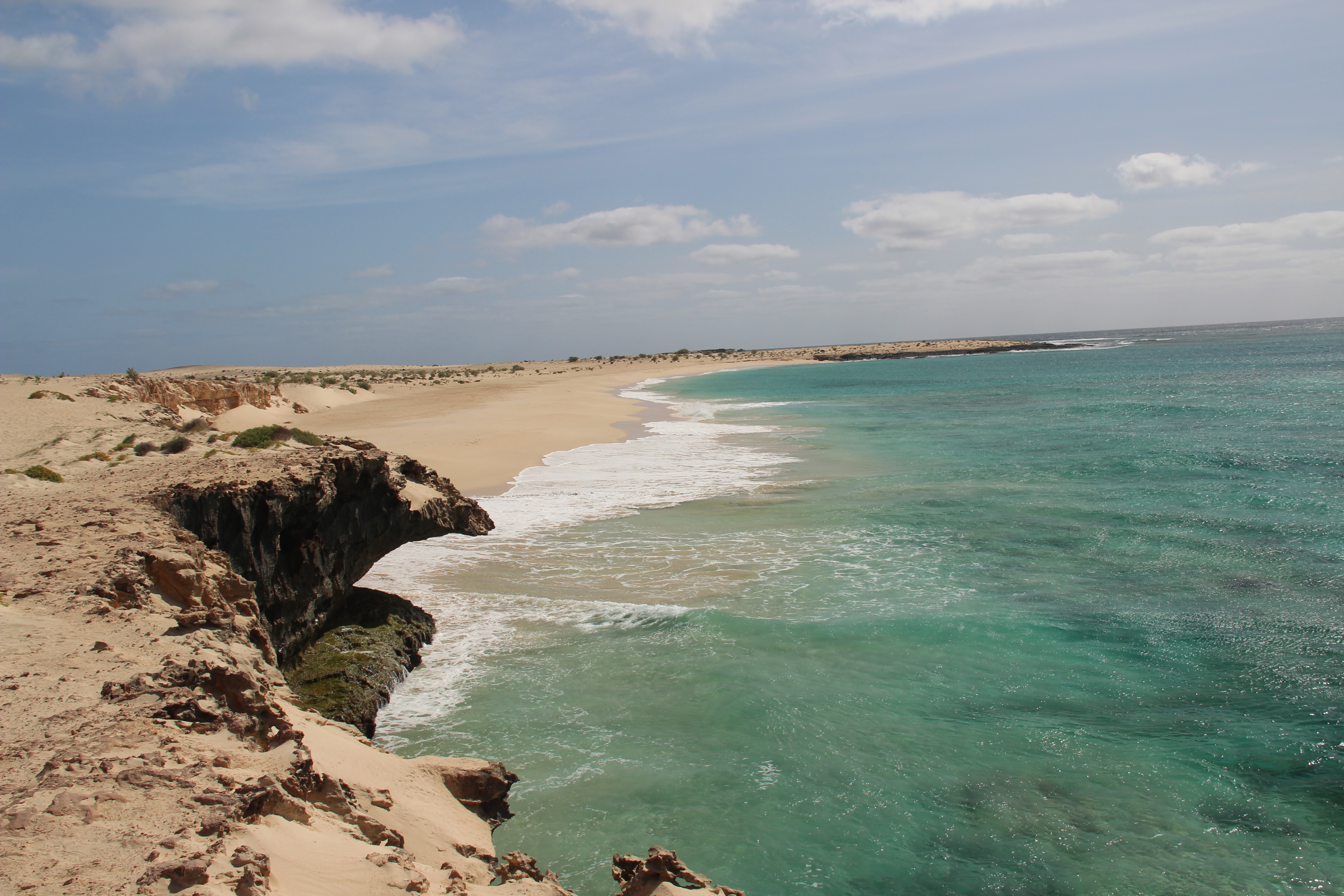 Direction le Sud de l’île, plage de Curralinho, surnommée Santa Monica pour sa ressemblance avec la plage californienne. 10 km de sable blanc, de rivages turquoises, de petites falaises déchiquetées par la mer. C’est magnifique (si ce n’était un énorme complexe touristique à l’architecture un peu étrange, quoiqu’assez discrète, comme sortie des sables). Nous papotons avec un chauffeur de taxi qui promène des touristes et qui nous propose de le suivre dans les dunes jusqu’à la plage aux tortues (qui ne sont plus là en cette saison mais ont laissé quand même quelques trous dans le sable). Les gosses prennent l’air, accrochés à l’arrière des pick-up, on ne voit plus que leur sourire !