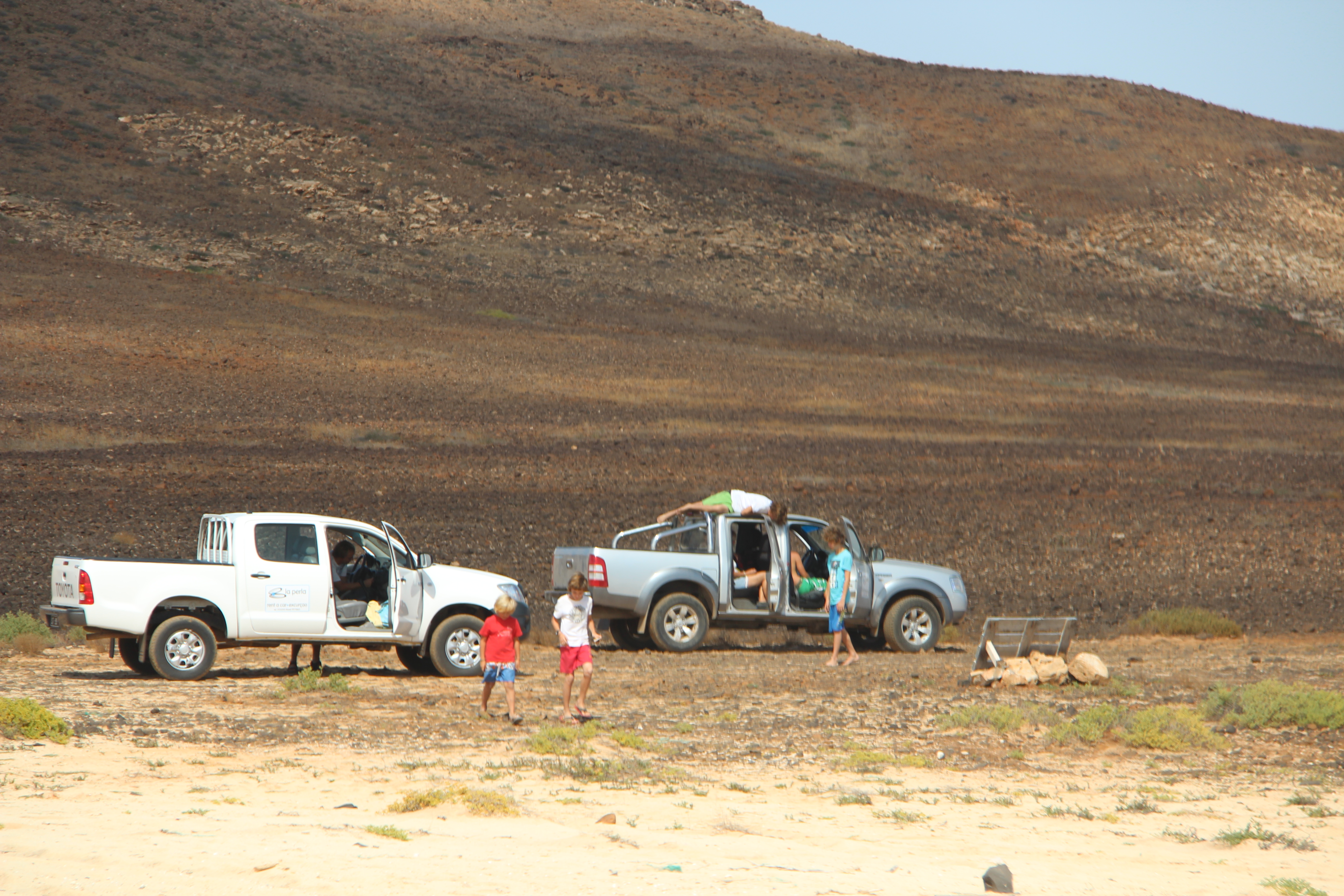 L’île de Boa Vista est souvent définie comme un petit bout de Sahara perdu au milieu de l’atantique. Après une journée à trainer nos tongues dans le village, en repérage de boulangerie, épicerie, restaus et bistrots, les enfants ont des envies de désert et d’aventure : nous louons des pickups pour emmener tout notre petit monde en balade (3 bateaux, 6 adultes, 6 enfants et un (gros) chien). Et quelle balade !!