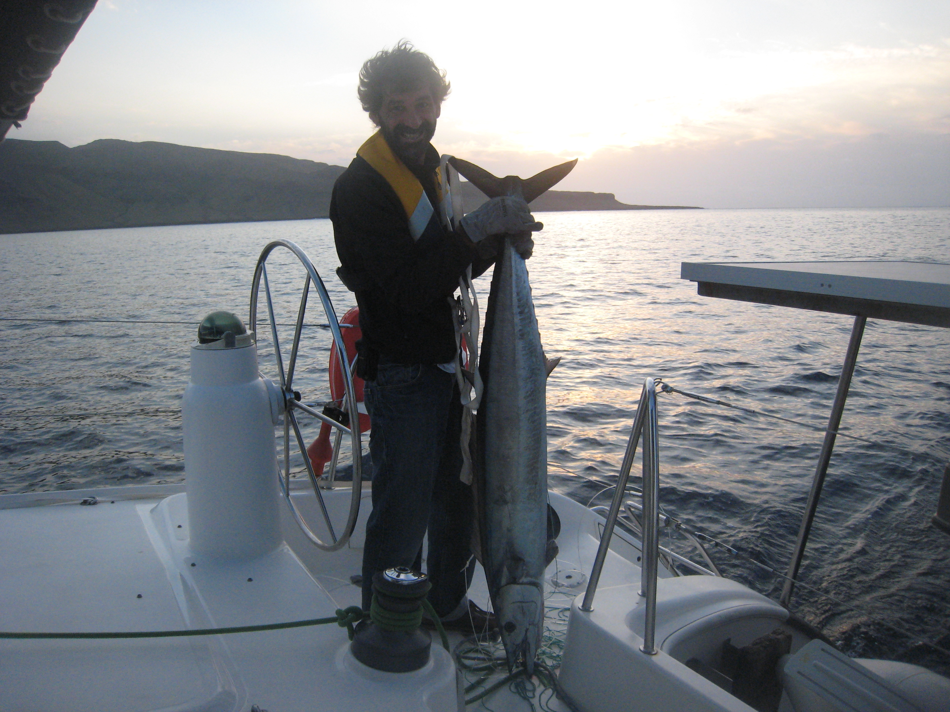 Nous reprenons la mer en fin de journée pour naviguer de nuit : 90 nautiques nous séparent de Sao Nicolao, notre prochaine escale, soit une petite vingtaine d’heures. Le vent, 20-25 nœuds de travers, nous permet de belles pointes (Juliette est contente, les yeux rivés sur le speedo à attendre le record). La mer, de travers, nous permet de bien ranger le bateau : tout ce qui trainait vole et trouve ainsi sa place un étage plus bas. Pratique. (On arrête la cafetière à temps, elle ne nous fera pas le coup 2 fois !). Entre ceux qui résistent et ceux qui s’endorment, le diner est un peu désorganisé : chacun se débrouille quand il émerge. On avance tellement bien qu’il nous faut même réduire un peu la toile pour ne pas atterrir dans le noir complet à Tarrafal. Un petit coup de vague « pétole » avant le lever du soleil achève de nous ralentir. Manu en profite pour pêcher un ENORME poisson !