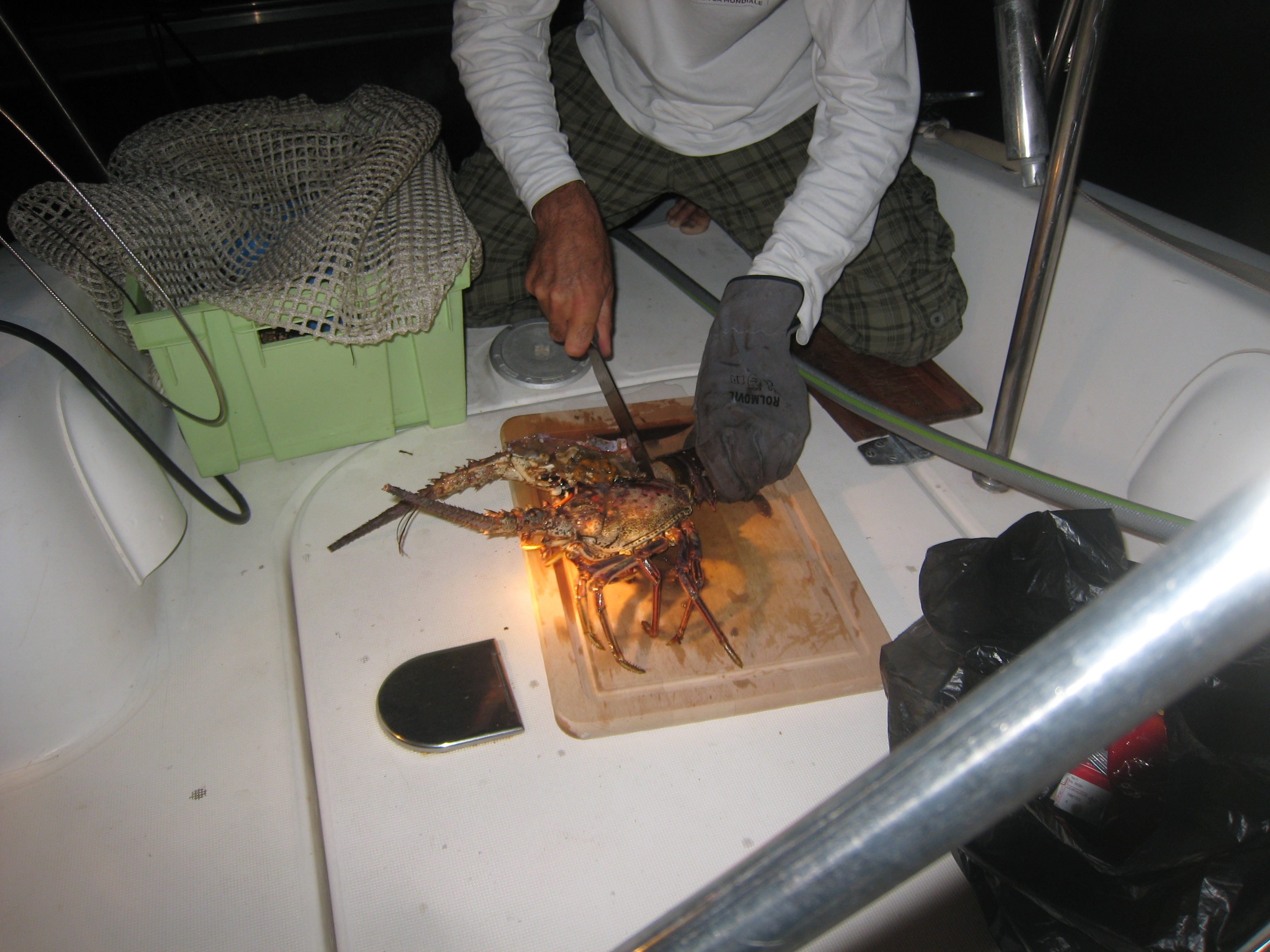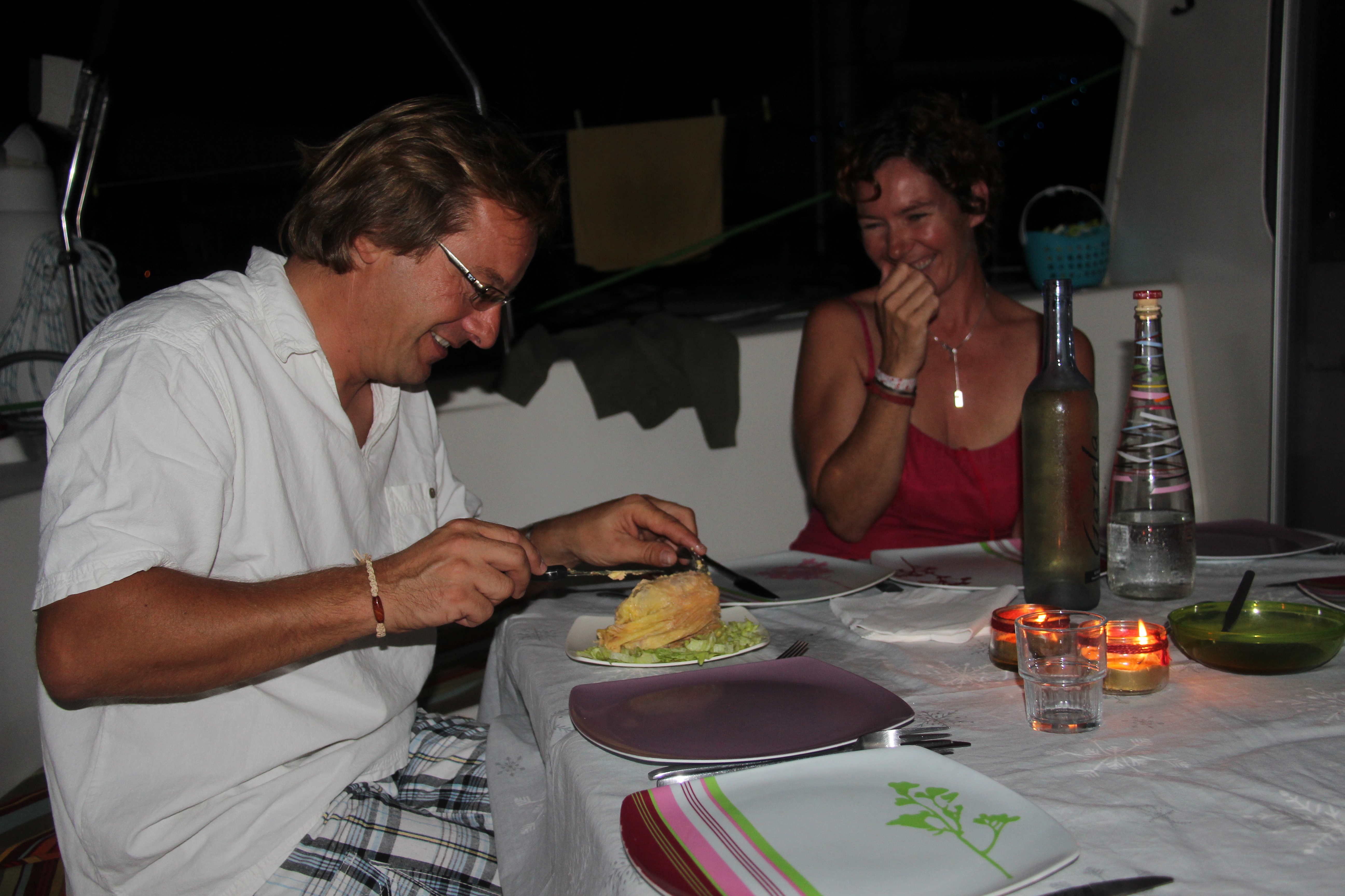 Pour ce premier réveillon sur Zanzibar, partagé avec l’équipage du Bubu, nous ne lésinons pas : langoustes fraichement pêchées, dégotées directement sur le bateau des pêcheurs (qui doivent nous prendre pour des parisiens en nous voyant arriver sur le ponton sans même un sac pour mettre les bestioles….). Après le traditionnel foie gras (merci la famille Rohrer !), Manu se lance très courageusement : il paraît qu’il faut couper les langoustes en deux, vivantes, et les jeter sur le barbecue.