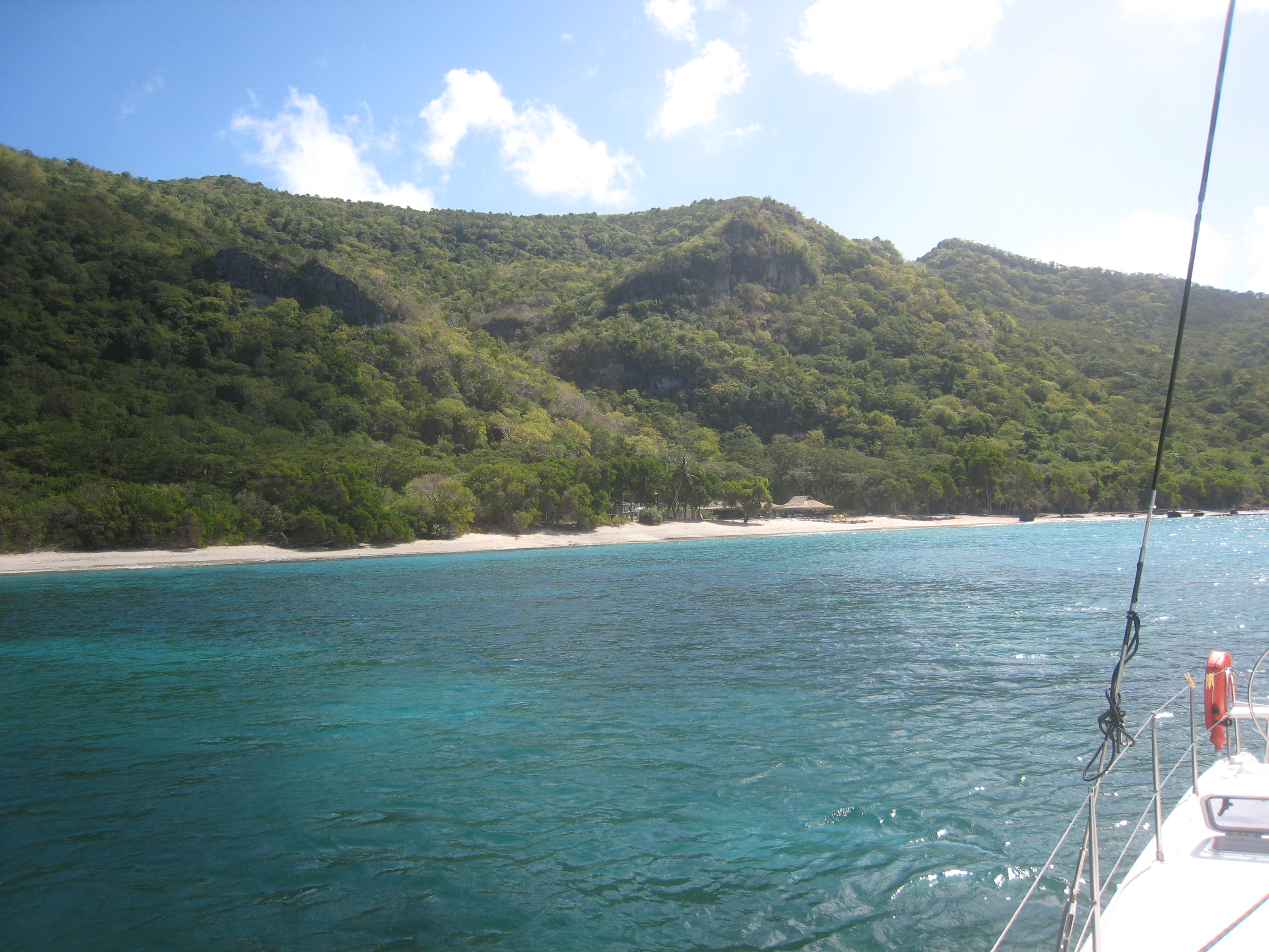 Après une nuit courte et agitée, ayant malgré tout récupéré toutes nos facultés de jugement, nous ne pouvons qu’être sous le charme de cette petite île : une végétation exubérante, une plage de sable blanc qui s’étire sous les cocotiers, des raies et des tortues qui nagent autour des bateaux… c’est vraiment très beau et nous ne regrettons plus notre mouillage de Marigot Bay !
