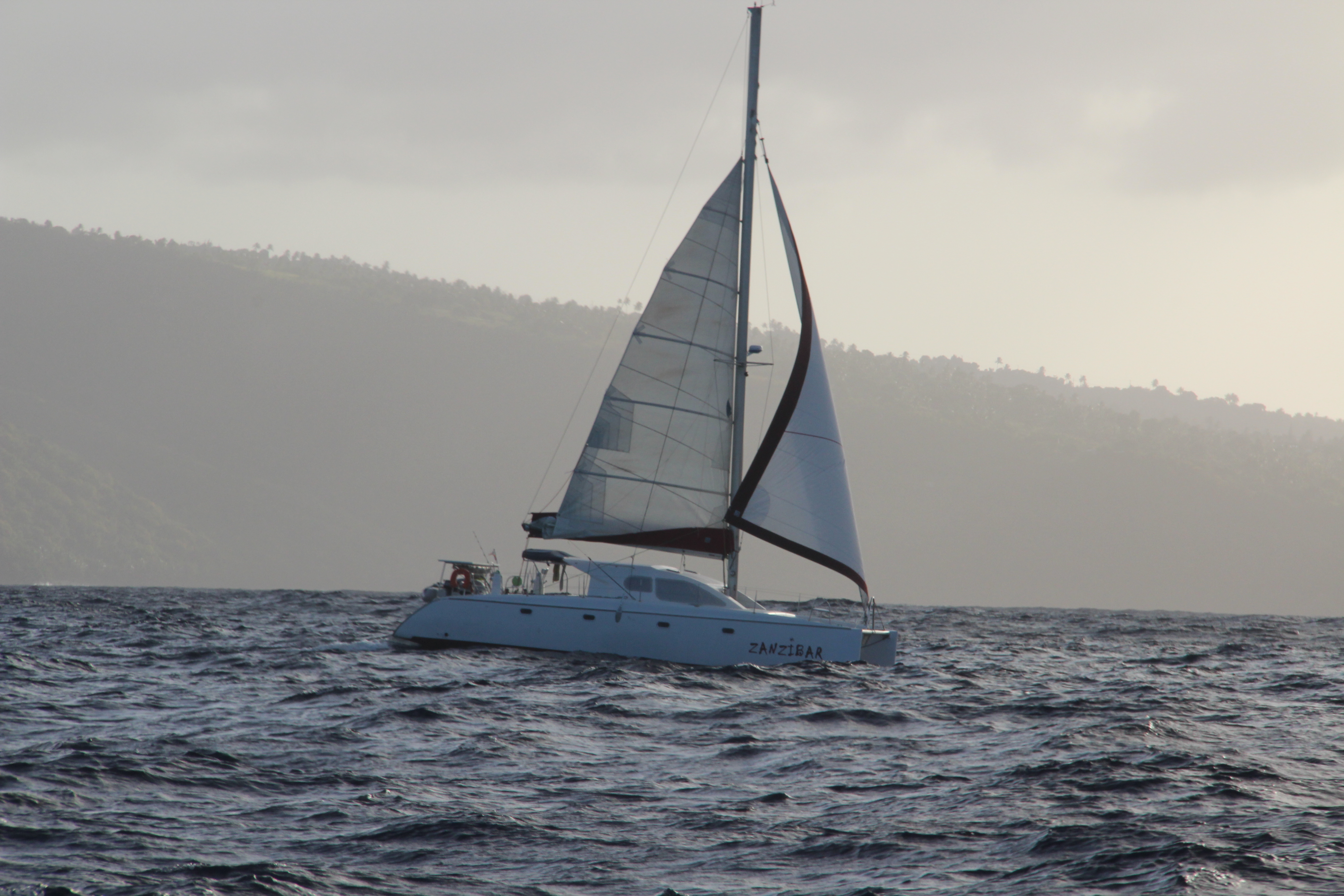 Départ à 5 heures du matin et navigation musclée pour couvrir les 87 milles nautiques qui nous séparent de l’île d’Union, aux Grenadines : 27 à 30 nœuds établis plein travers, rafales à 40, grosse mer de côté, déferlantes qui inondent le cockpit (et le roof !) : nous sommes mouillés, salés et fatigués quand nous arrivons à Chatham Bay en fin d’après-midi. Mais une fois encore heu-reux de ces quelques heures en mer sur notre Zanzibar, si à l’aise dans la houle et dans le vent. L’arrivée  (pourtant attendue !) n’est finalement pas un doux moment d’allégresse : le mouillage est très fréquenté,  très venté, un grain assombri le ciel et un Lagoon de 50 pieds, échoué coque tribord éventrée sur les cailloux au sud de la baie, n’engage pas vraiment à jeter l’ancre au hasard…