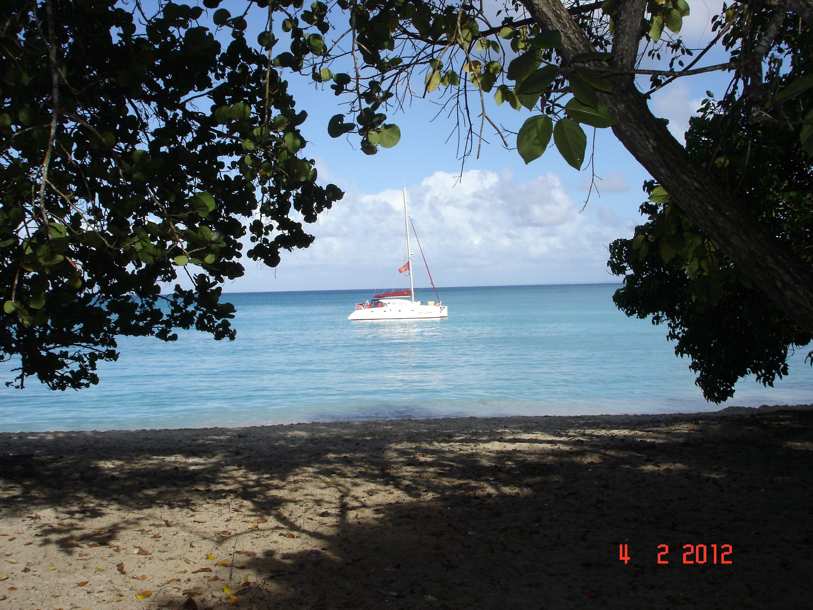 Hélène et Jojo, arrivés quelques jours plus tôt à Ste Anne, ne tardent pas à venir nous voir et nous accompagnent gentiment le lendemain assurer notre avitaillement. Pas de voitures dispo avant mardi matin (ben tiens), et il a encore fallu chercher partout ! Nous bichonnons Zanzibar (grand rinçage à l’eau douce !) avant de récupérer mamie Nicole-papy Kiki et de repartir pour 2 semaines de mouillages sauvages.