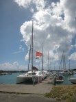 La mer est un peu plus « tranquille » pour cette nouvelle journée de navigation, et puis on s’habitue… Nous remontons au près, cap sur Grande Terre, tirons un long bord vers Marie-Galantes et atteignons la marina du Bas du Fort en début d’après-midi. C’est dimanche, service minimum : on nous colle au ponton d’accueil des grands yachts, au milieu de voiliers magnifiques. Avec le linge qui sèche aux filières et nos gosses hirsutes, on fait un peu pacoulis…