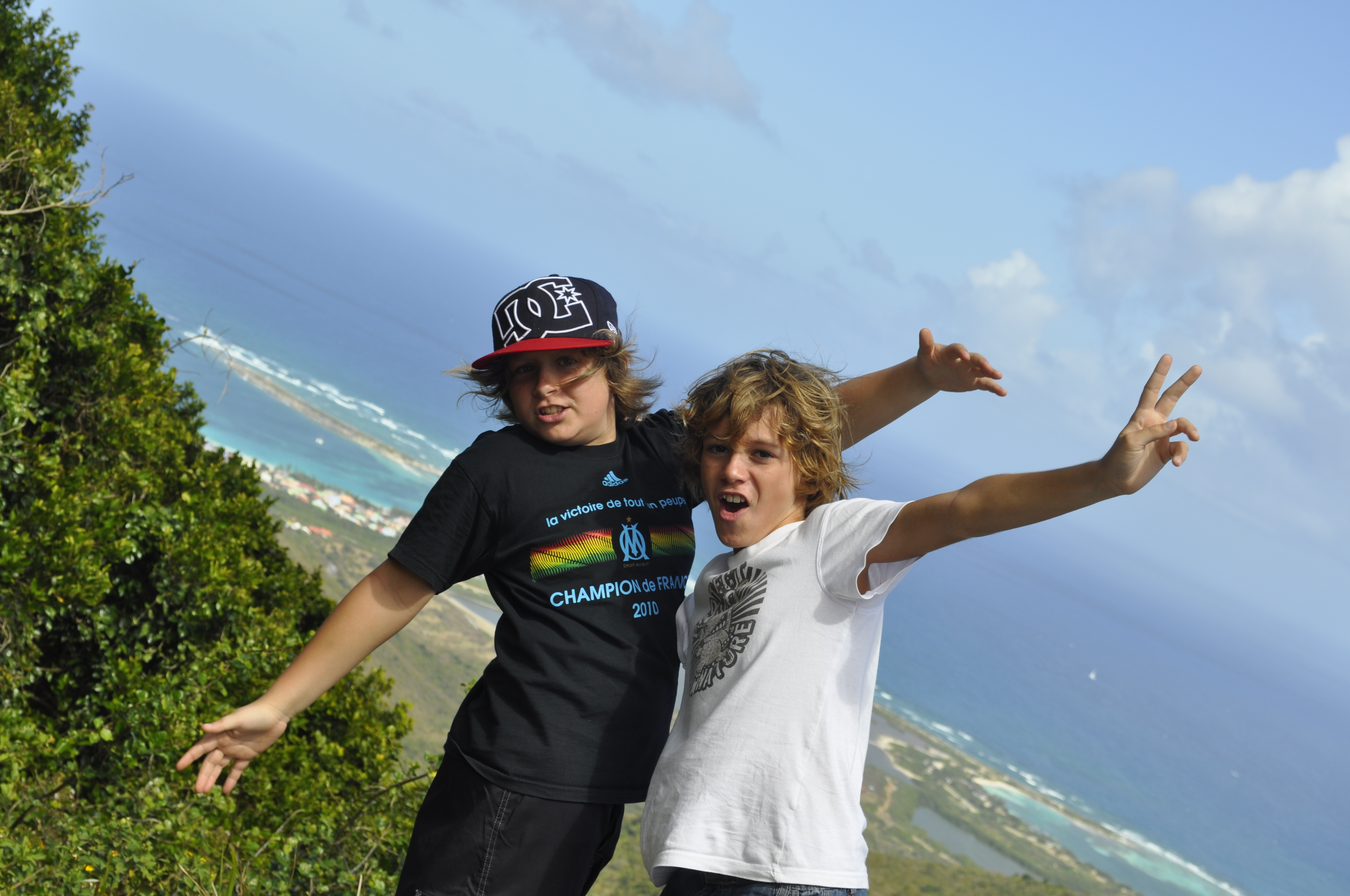 Puisque nous sommes bloqués dans cette magnifique marina d’Oyster Pond, où on ne peut même pas se baigner (sauf Val, Nathan et Agnès… avant de savoir qu’ils risquaient un beau staphylocoque doré !), nous nous organisons pour balader la joyeuse bande des schtroumpfs (ce qui représente un vrai challenge vu l’inertie développée à 10 sur un bateau) :