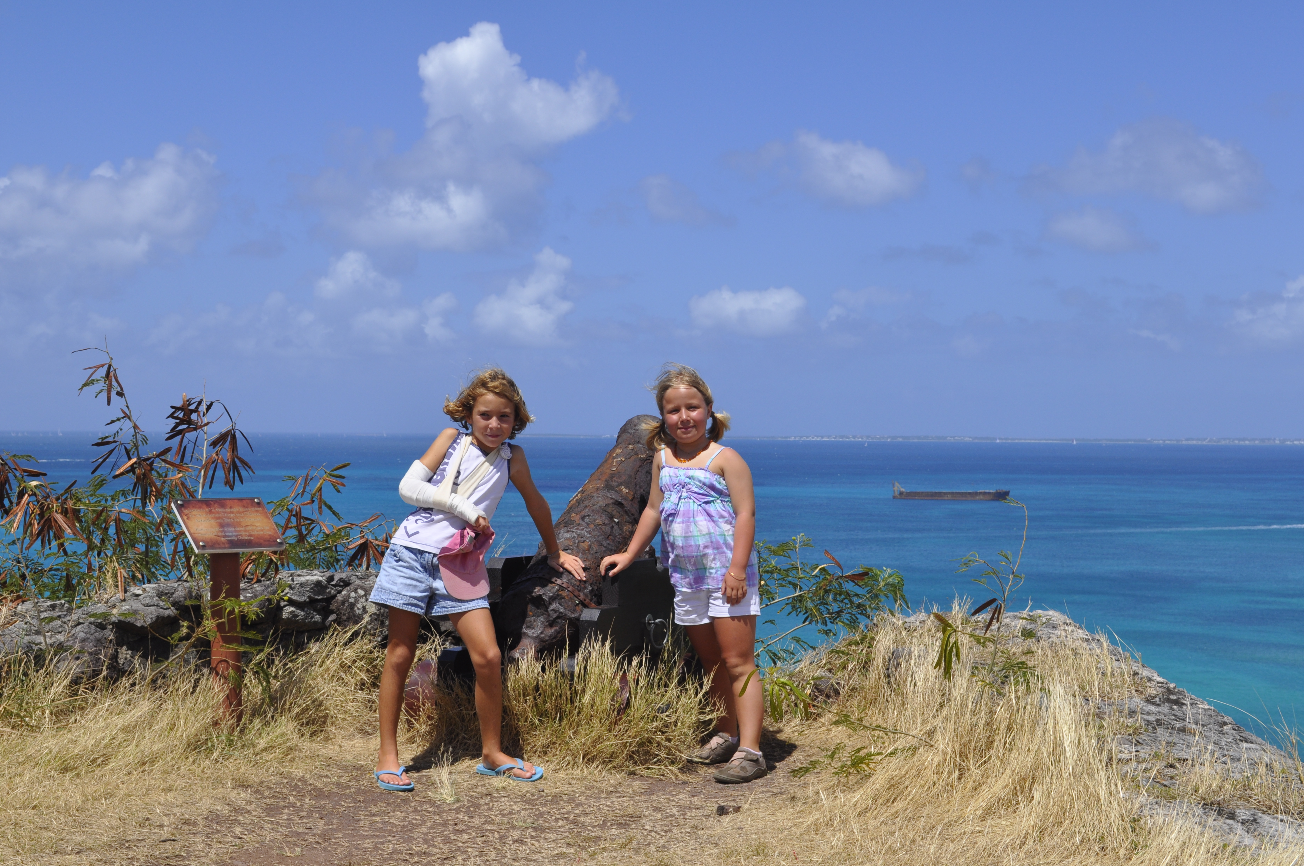 Ilet Pinel : nous prenons la barque pour traverser (la mort dans l’âme de ne pas être là avec Zanzibar !), pendant qu’ Agnès décide de nous suivre à la nage…  Nous trouvons un joli carbet pour installer notre marmaille, face au vent et aux vagues de l’atlantique. Les plus vaillants s’en vont palmer-masquer-tubater tandis que les moins vaillants trainent sur le sable (et c’est chouette aussi de faire des trous et des chateaux, voire même rien du tout). Nous admirons les voiliers de la Heineken Regatta qui croisent à quelques encablures. Et re-pincement au coeur : Manu aurait tellement aimé embarquer comme équipier, si ce maudit moteur en panne ne l’avait pas contraint à modifier ses plans…