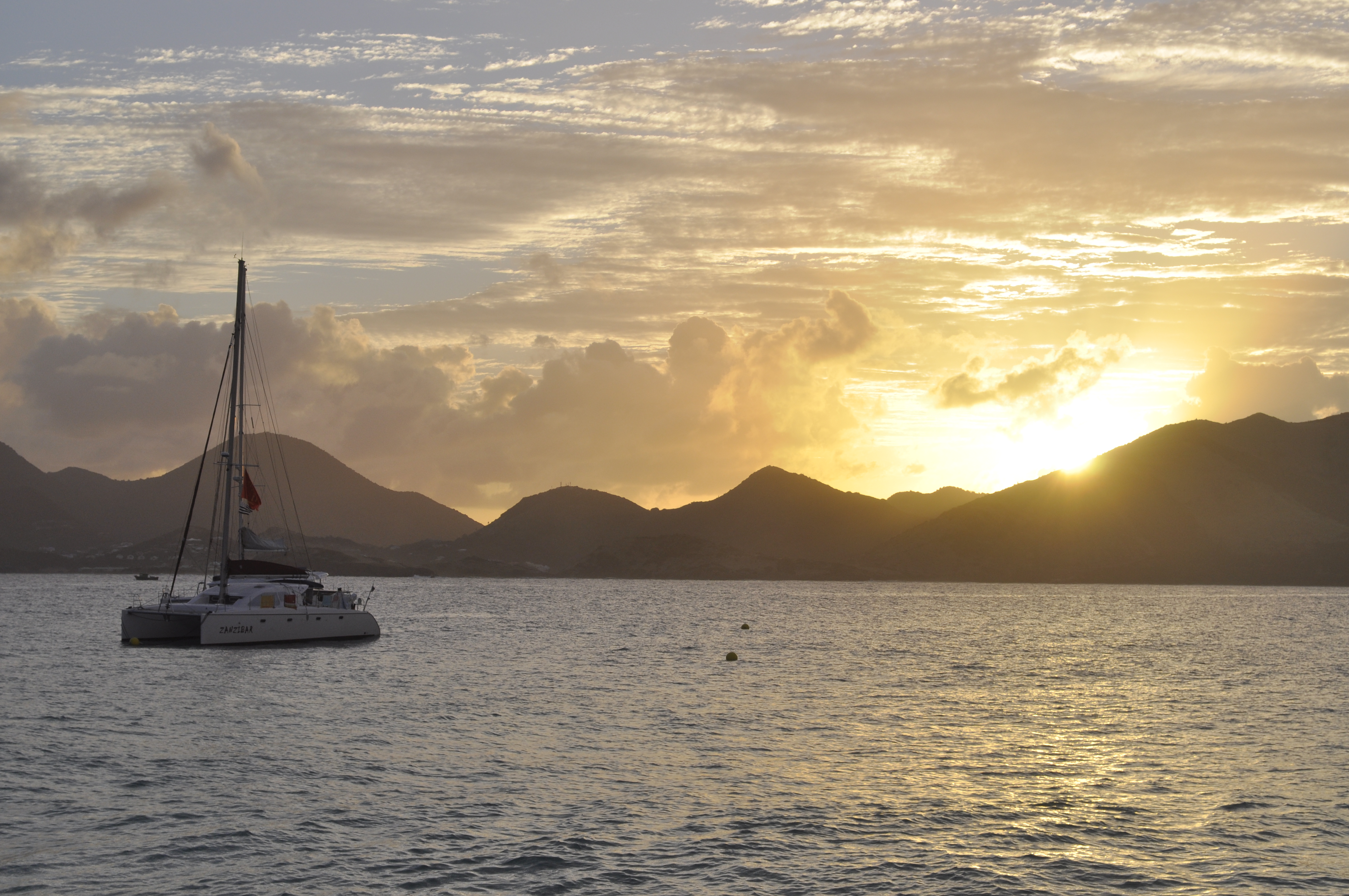 Nous remontons par l’ouest et allons jeter l’ancre dans la baie de Grand Case.  Baignade et soirée paisible face au village pour recaler les gyros de la petite troupe. Nous admirons le soleil qui se noie dans la mer des Caraïbes, embrasant l’horizon. C’est chaque fois tellement magique.
