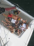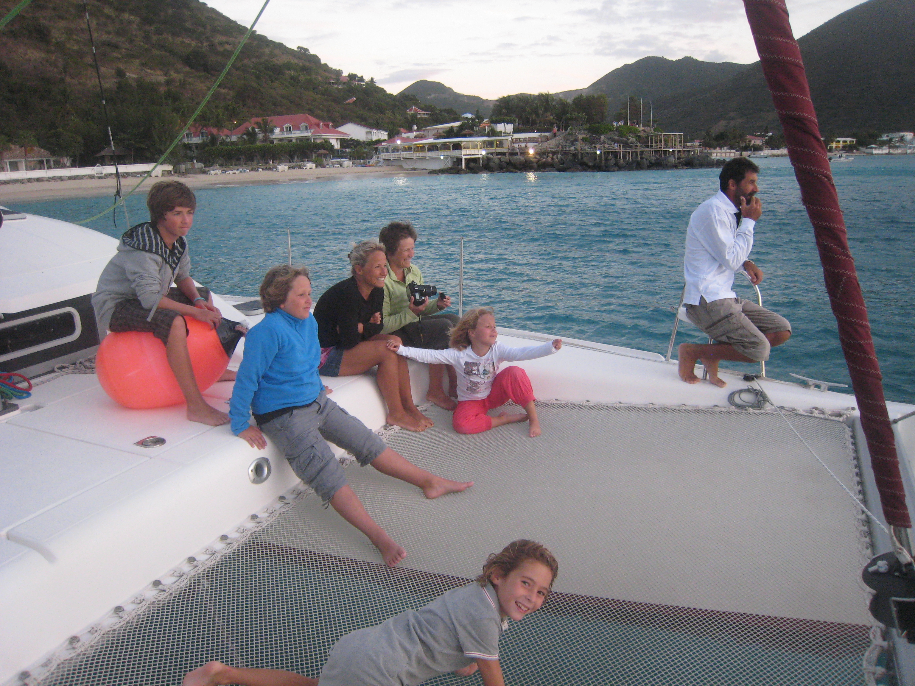Voiture filles, voiture garçons, nous rejoignons notre camp de base pour le premier transbordement via annexe. Que du bonheur ! Tellement épique (10 zozos + les bagages) que Nadia, amusée de notre petit cirque sous la terrasse de son restau, nous envoie un voisin avec un énorme dinghy pour limiter les allers retours entre le ponton et la bouée où nous sommes amarrés. Et comme nous ne sommes pas encore lassés, nous repartons direct passer la soirée à Orient Bay. Il ne faut jamais se laisser engluer par le décalage horaire !