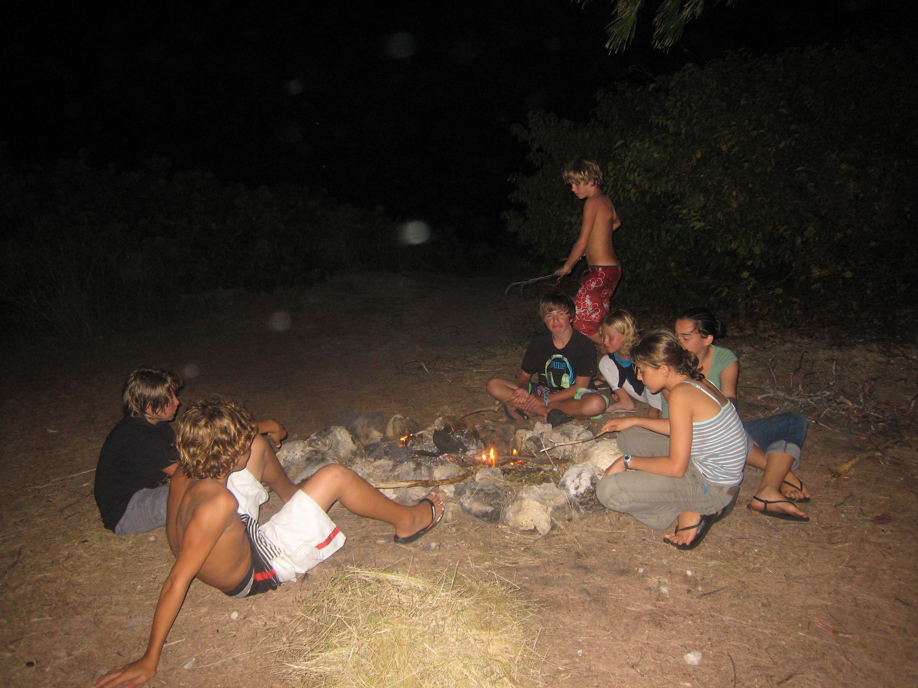 Barbecue à terre. Ce qui relève du défi quand on sait comme le débarquement en annexe sur la plage est sportif ! Les enfants ramassent du bois et nous préparent un feu. Tandis que la soirée s’étire tranquillement, ils s’arment de courage et s’enfoncent dans la nuit pour une petite expédition sur l’île. Jolie file indienne de têtes blondes : deux lampes frontales pour 8, ils se serrent les tongues ! D’autant qu’on entend quand même des bêbêtes courir… en l’occurrence une multitude de petits rats très mignons. Le retour sur le bateau est aussi olé olé que l’aller. On arrive un peu trempés, mais il faut savoir sacrifier à son petit confort pour vivre le grand frisson de temps en temps !