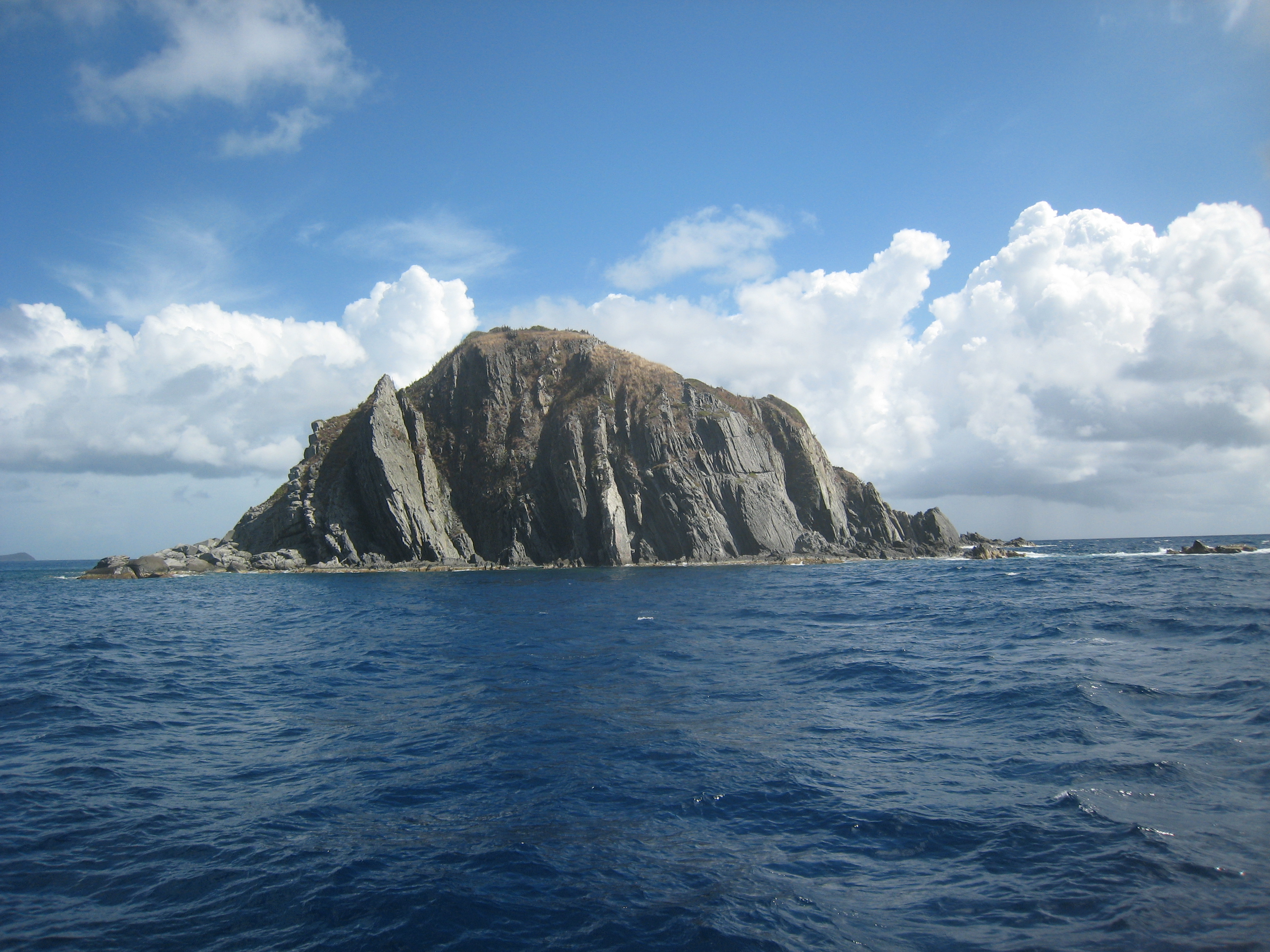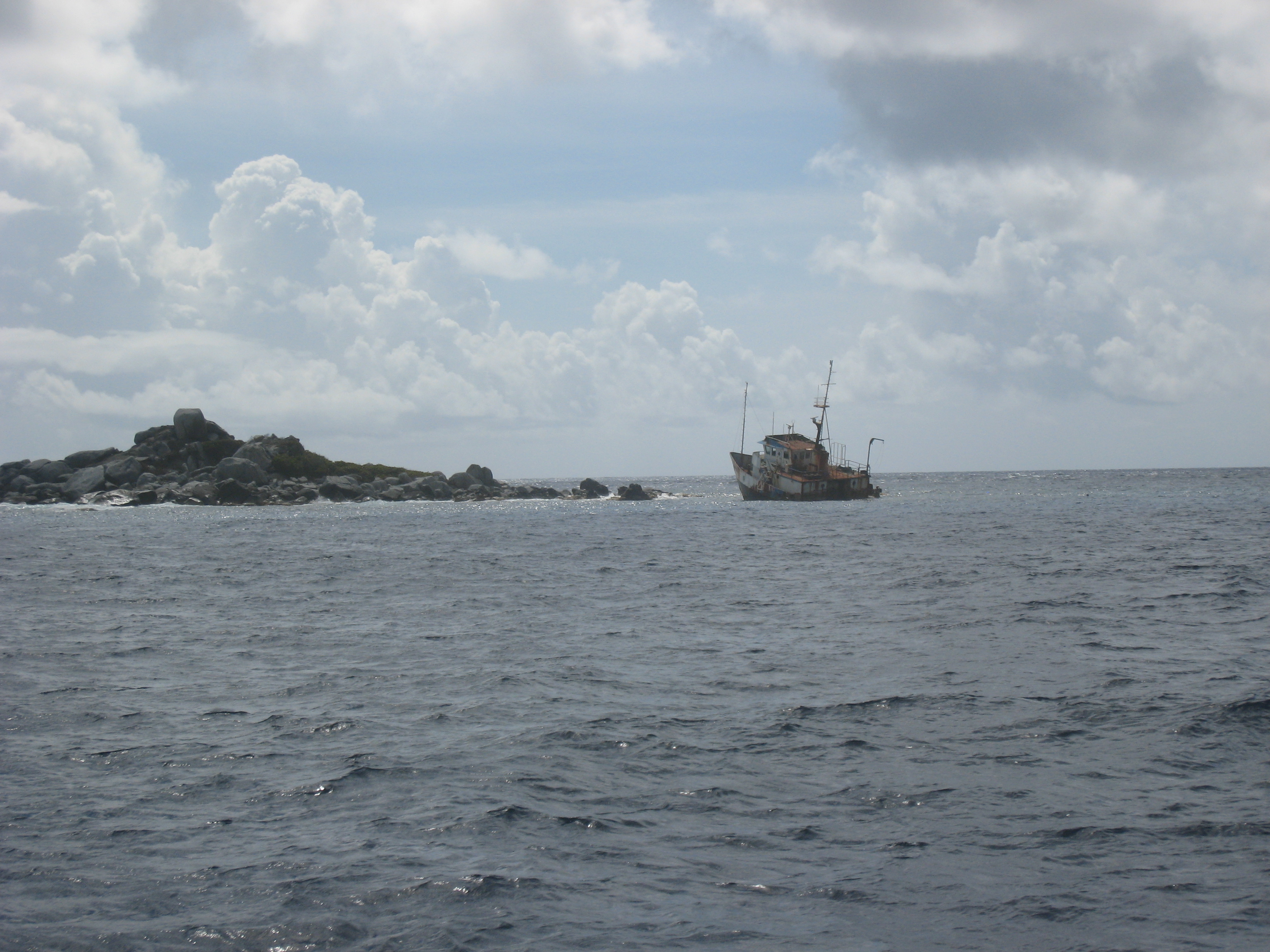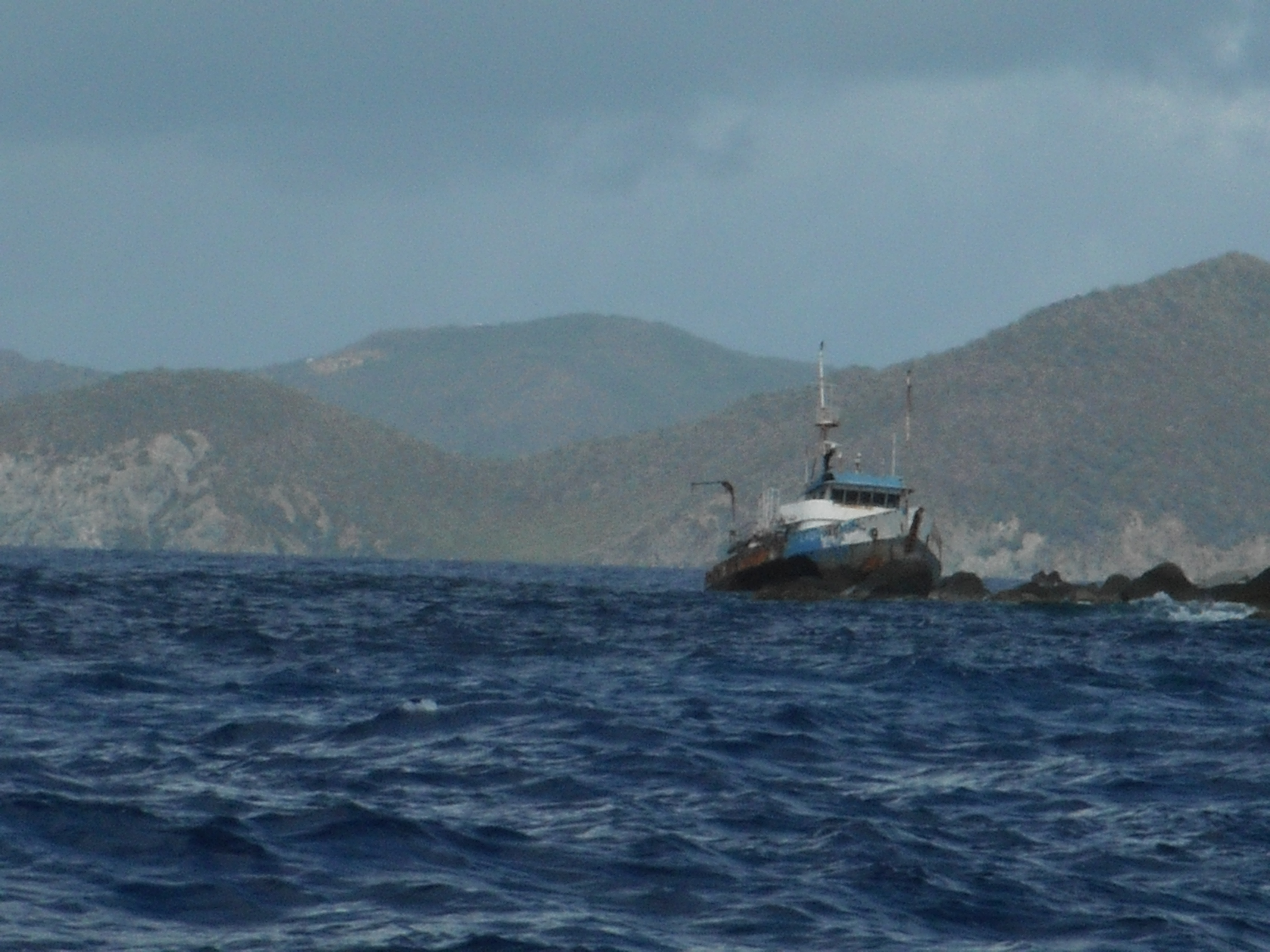 Nous atterrissons sur la côte extrême sud-ouest de l’île de Virgin Gorda, après avoir fait le tour de Round Island pour ne pas tenter le diable dans la passe au Nord des Blinders… Un petit cargo échoué sur les rochers n’invite d’ailleurs pas à prendre des risques inutiles.