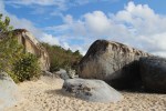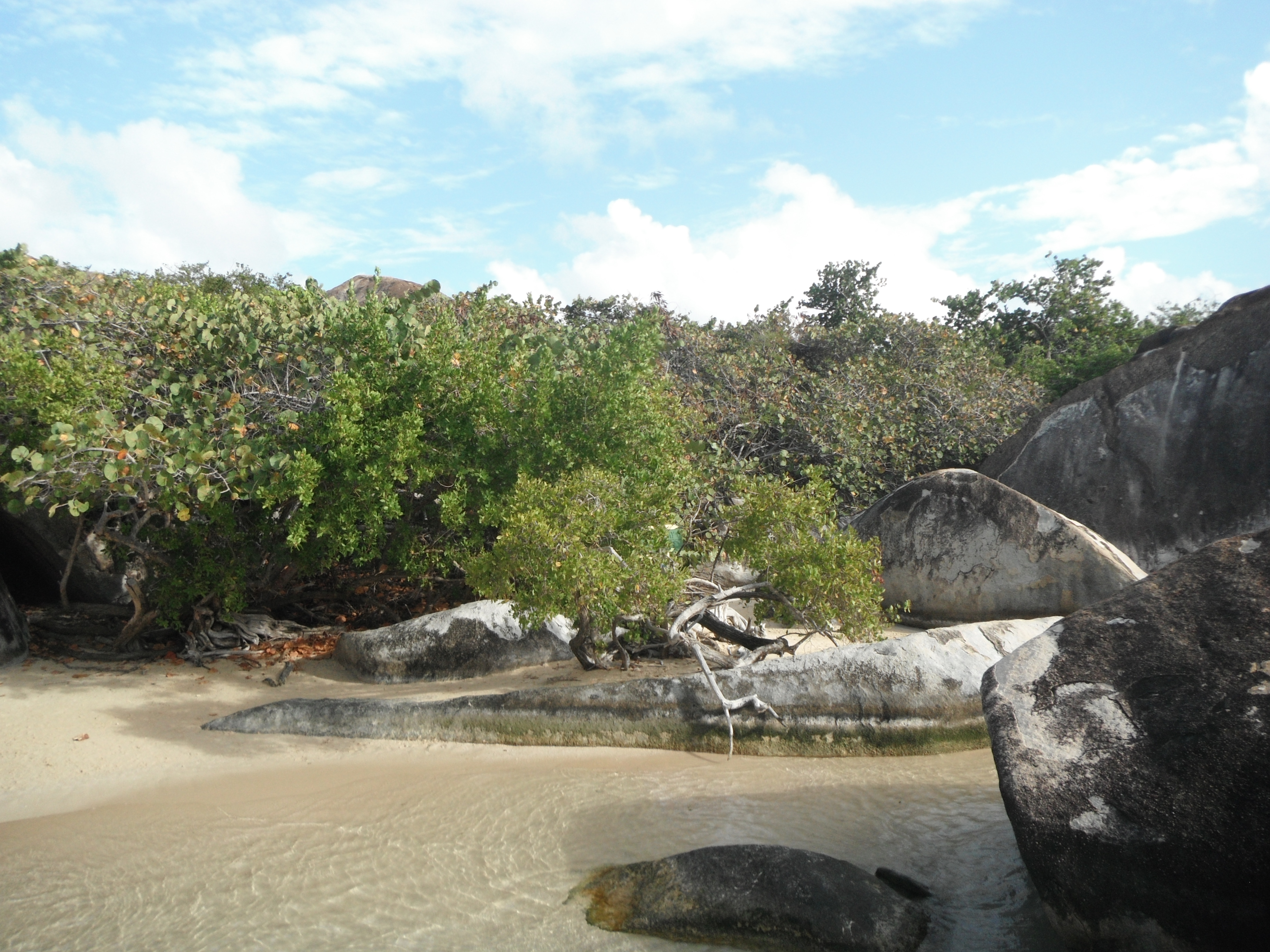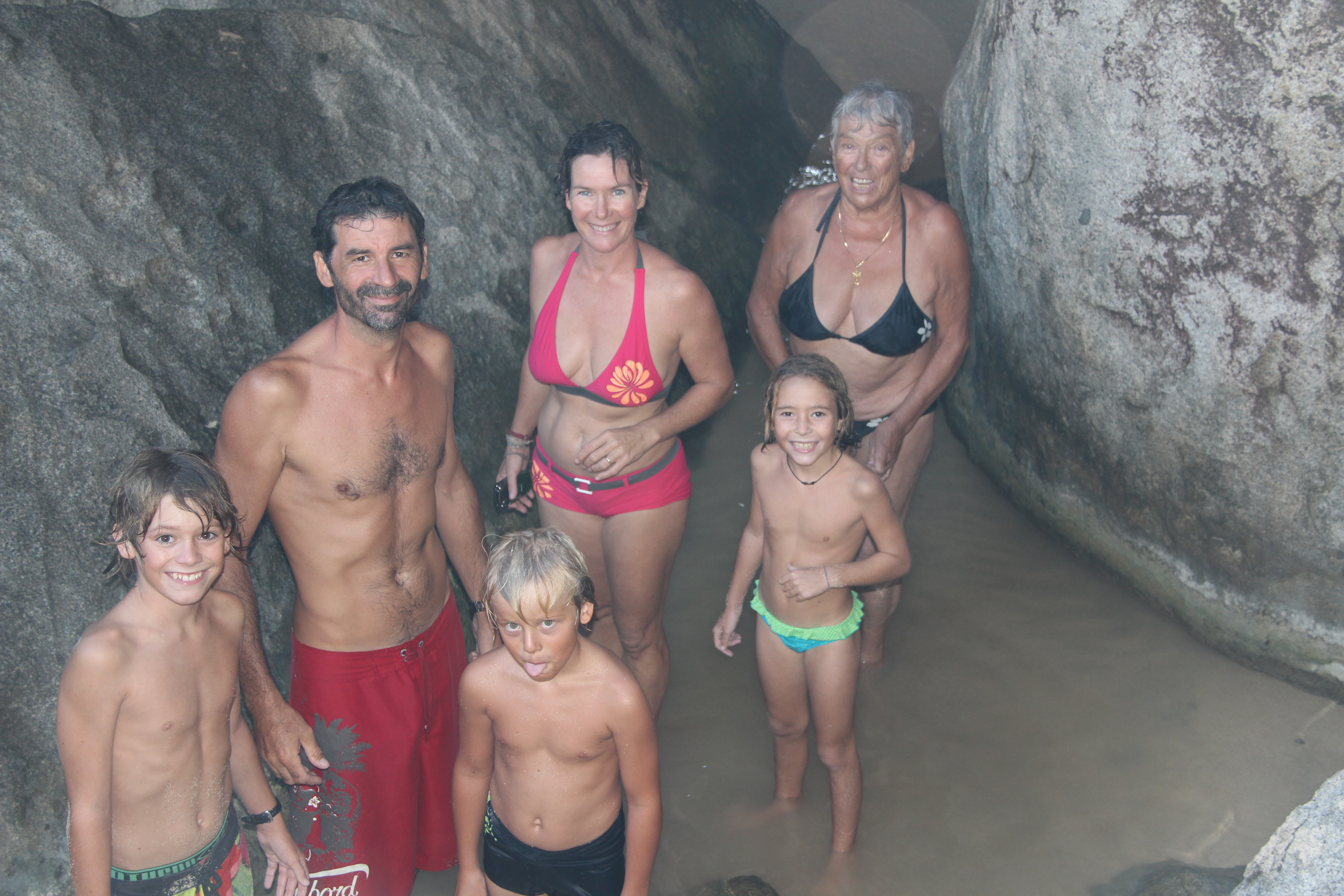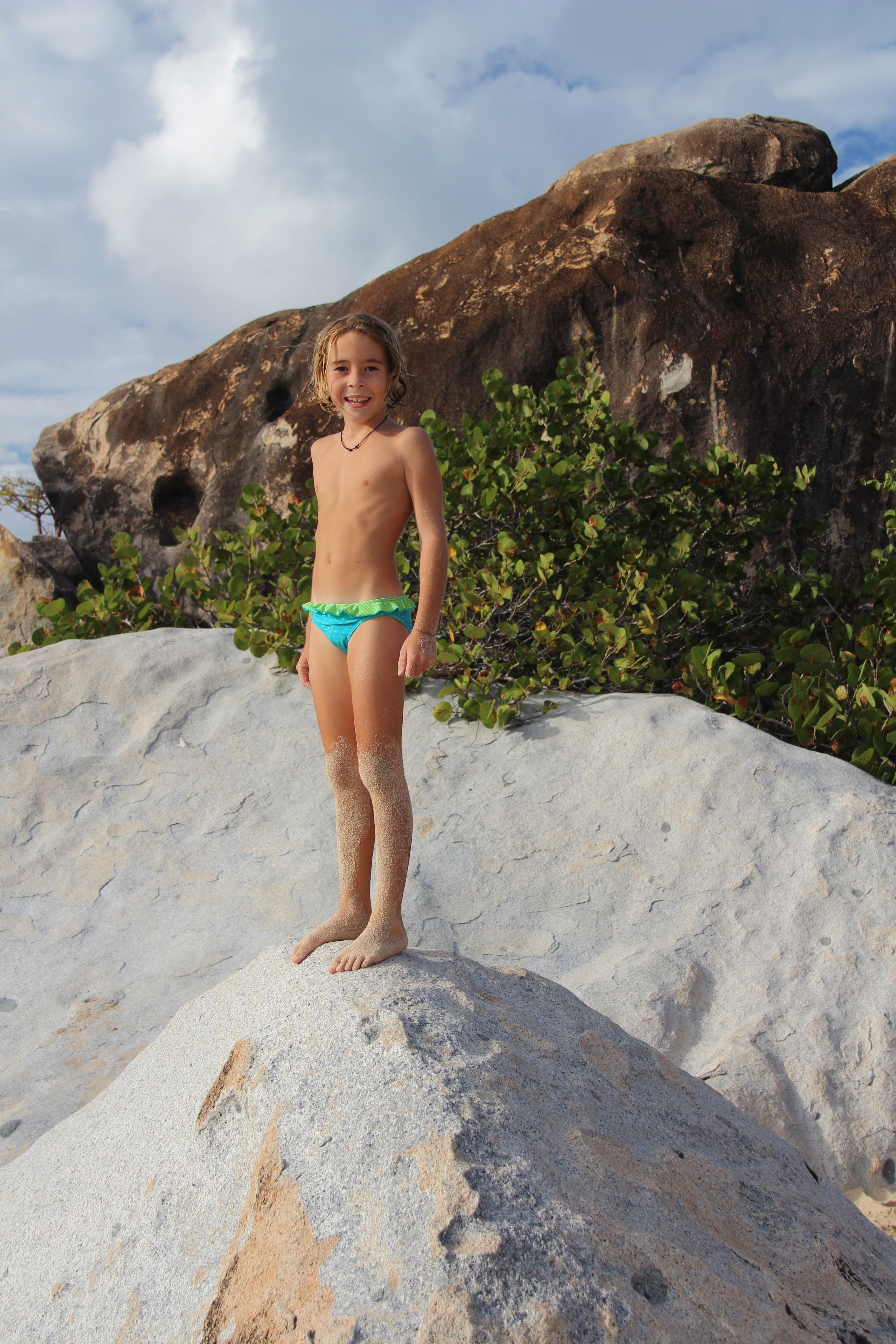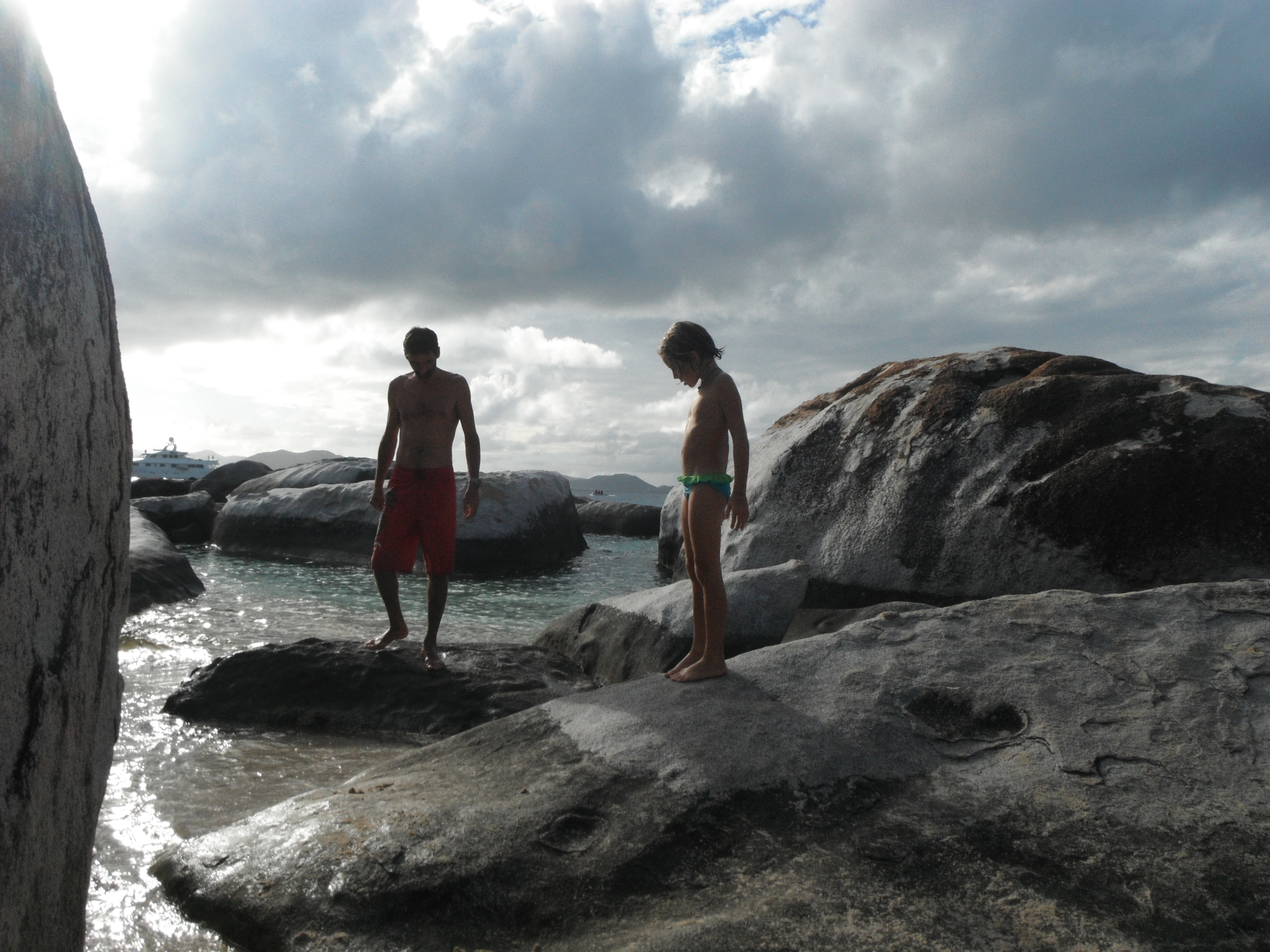 Nous retrouvons l’équipage du Bubu, parti quelques jours avant nous de St Martin. Réserve naturelle oblige, le mouillage est interdit dans la zone et nous prenons une bouée devant les mythiques Baths, sous un beau grain (comme d’hab !) et à l’arrache (c’est un peu la loi de la jungle : il faut être drôlement réactif pour ne pas se faire piquer la bouée sous l’étrave…). Les Baths sont un labyrinthe de baignoires naturelles en partie envahies par la mer, formées dans un amoncellement de blocs de granit d’origine volcanique, disséminés le long de la plage. Le spectacle est tout à fait étonnant : des petites piscines aux eaux cristallines se cachent entre les rochers ou dans les grottes creusées par le vent, les marées ou les tempêtes. Les dinghy n’étant pas autorisés à accoster, on nage jusqu’à la plage puis on chemine lentement dans le dédale de roche jusqu’à Devil’s Bay. Jolie promenade aquatico-pédestre. Les enfants se régalent de ces rochers à escalader, des grandes flaques d’eau claire où se trempouiller, des nombreuses cachettes où jouer aux pirates.
