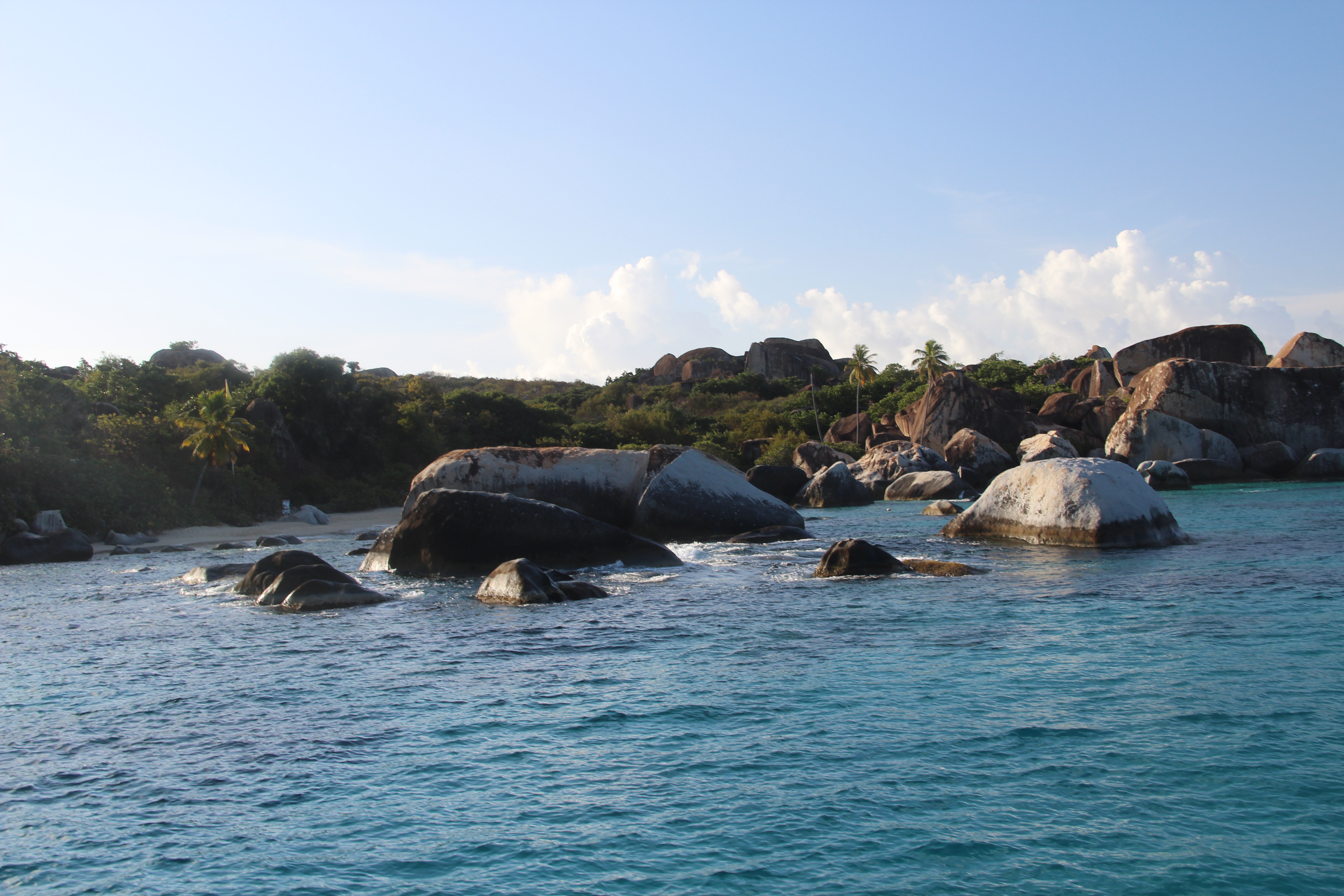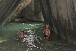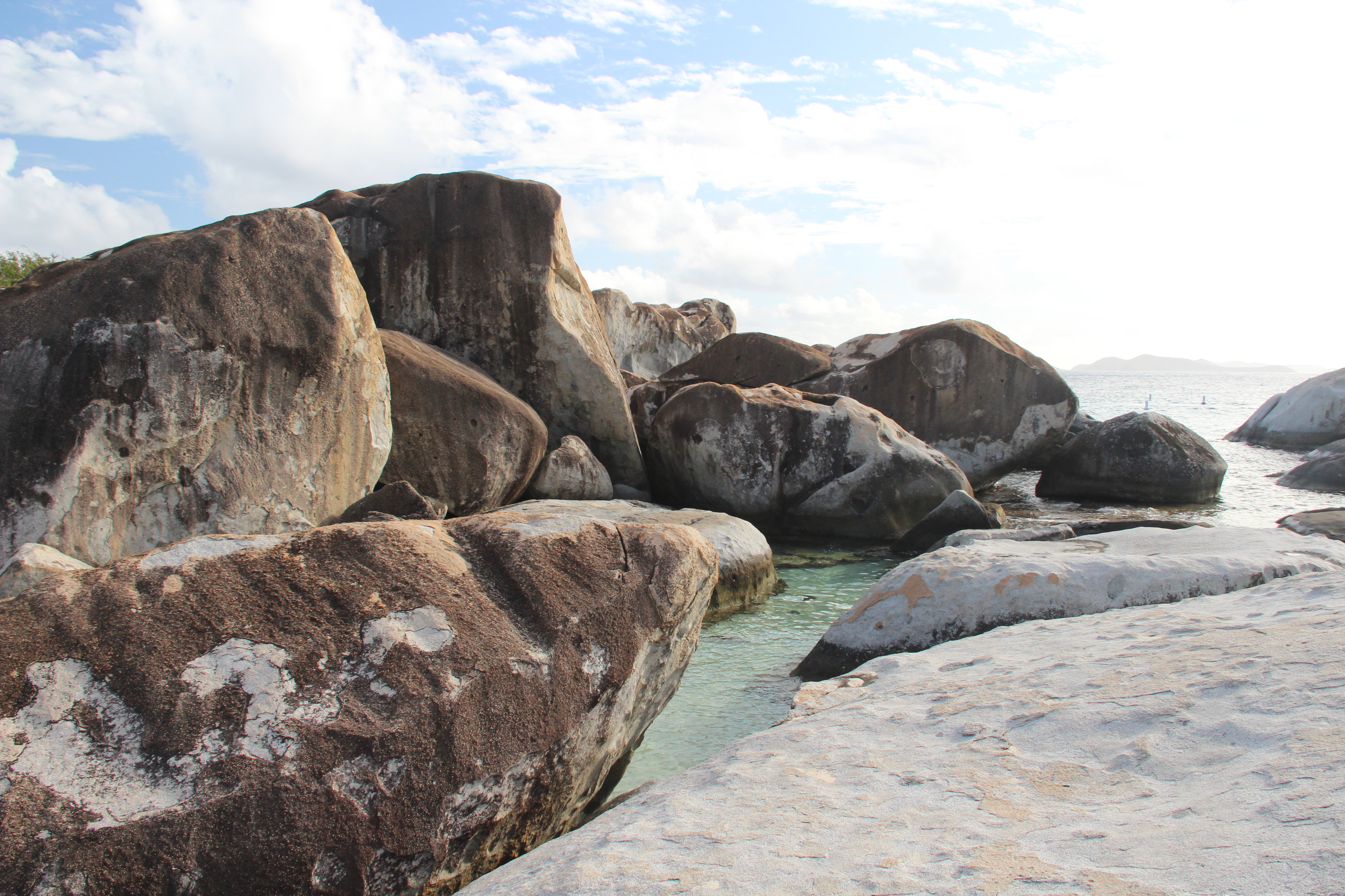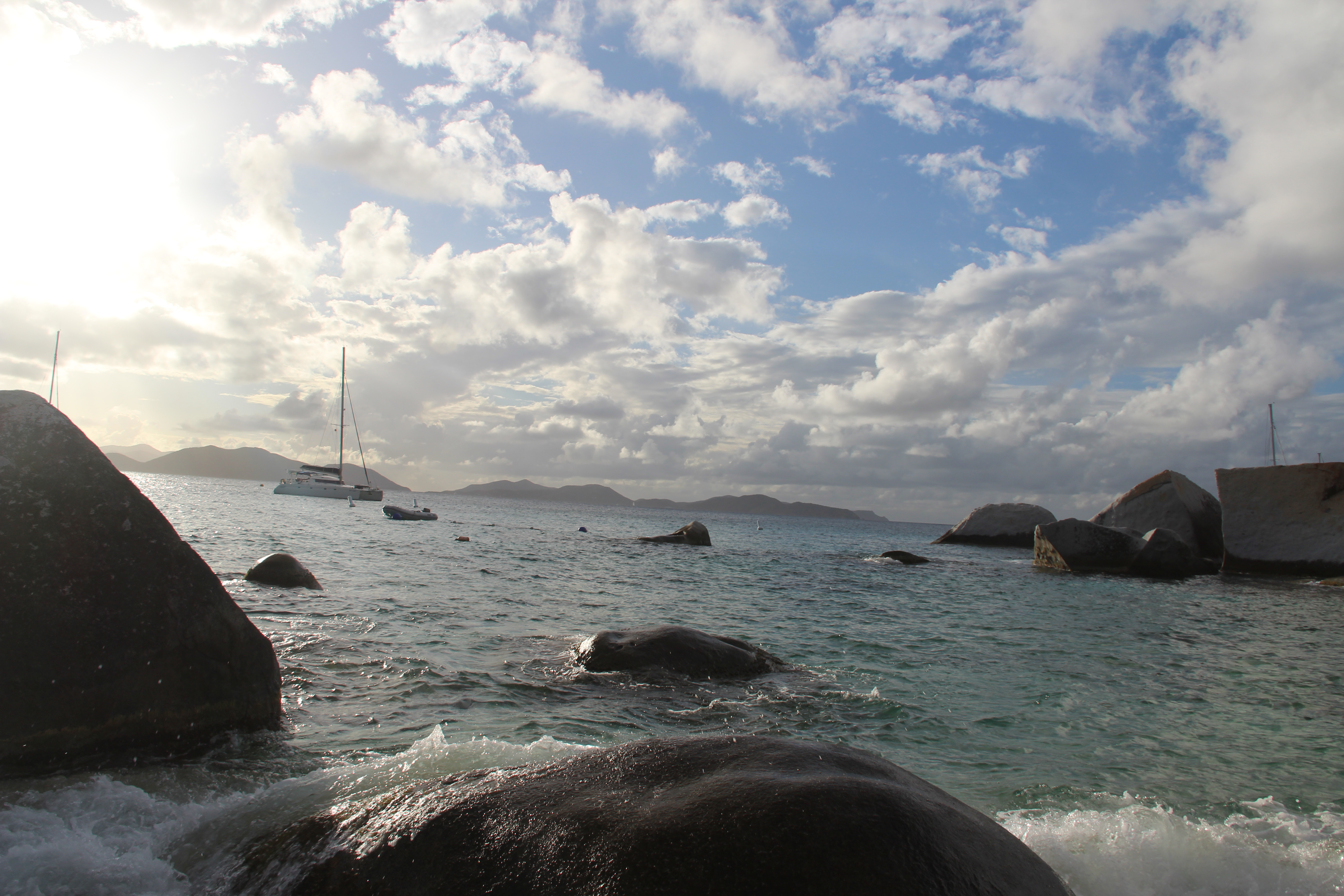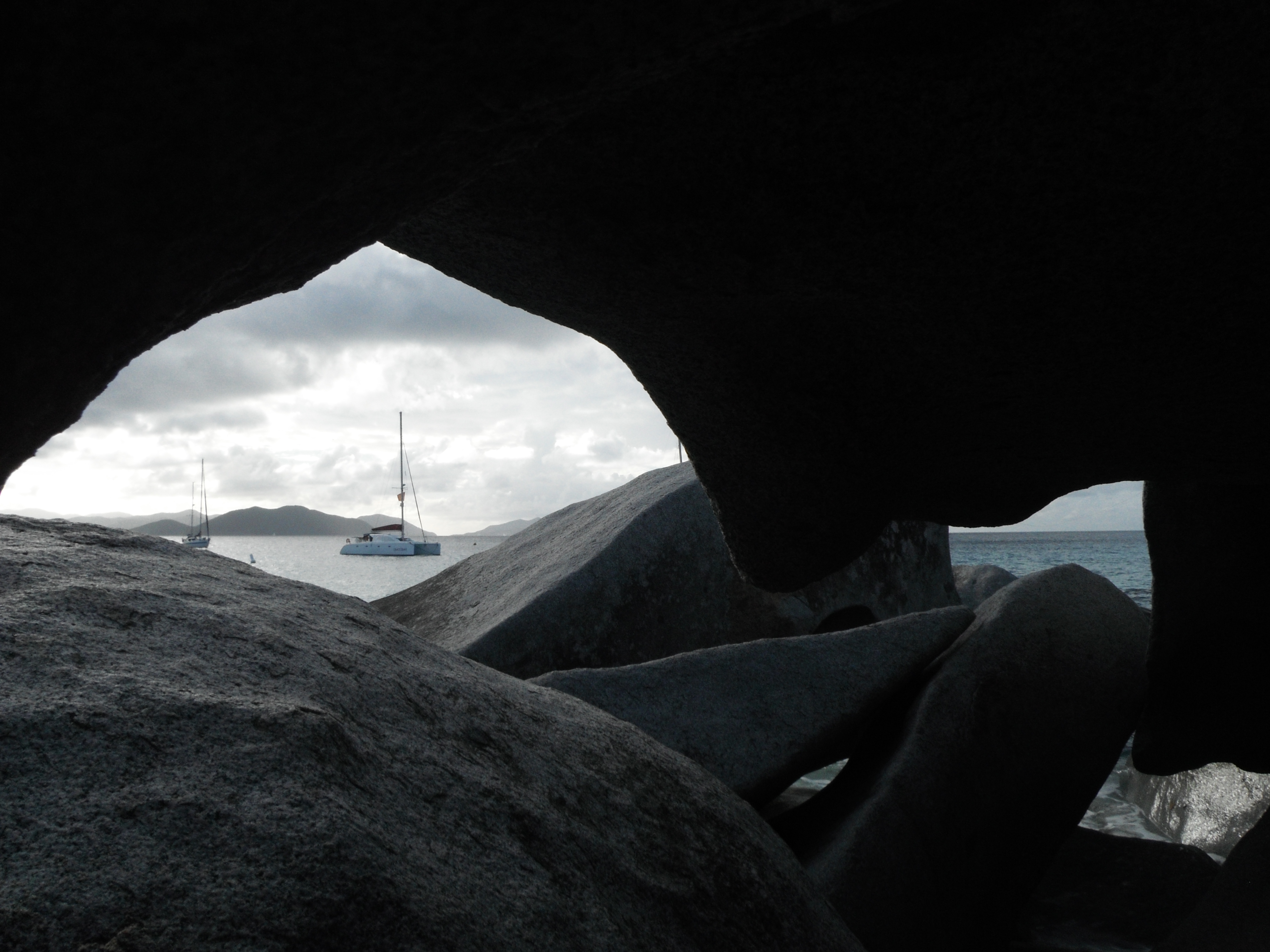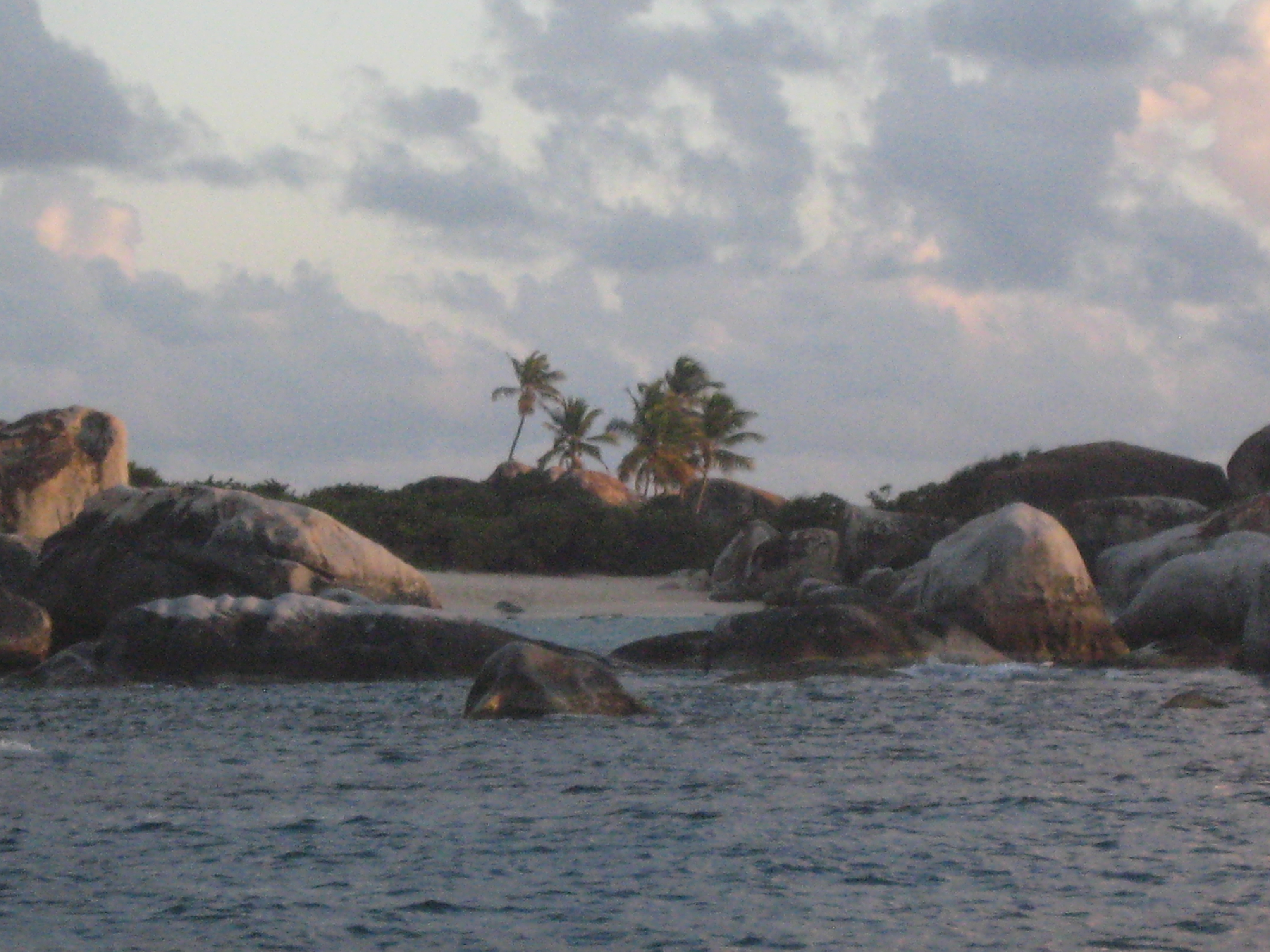 Nous retrouvons l’équipage du Bubu, parti quelques jours avant nous de St Martin. Réserve naturelle oblige, le mouillage est interdit dans la zone et nous prenons une bouée devant les mythiques Baths, sous un beau grain (comme d’hab !) et à l’arrache (c’est un peu la loi de la jungle : il faut être drôlement réactif pour ne pas se faire piquer la bouée sous l’étrave…). Les Baths sont un labyrinthe de baignoires naturelles en partie envahies par la mer, formées dans un amoncellement de blocs de granit d’origine volcanique, disséminés le long de la plage. Le spectacle est tout à fait étonnant : des petites piscines aux eaux cristallines se cachent entre les rochers ou dans les grottes creusées par le vent, les marées ou les tempêtes. Les dinghy n’étant pas autorisés à accoster, on nage jusqu’à la plage puis on chemine lentement dans le dédale de roche jusqu’à Devil’s Bay. Jolie promenade aquatico-pédestre. Les enfants se régalent de ces rochers à escalader, des grandes flaques d’eau claire où se trempouiller, des nombreuses cachettes où jouer aux pirates.
