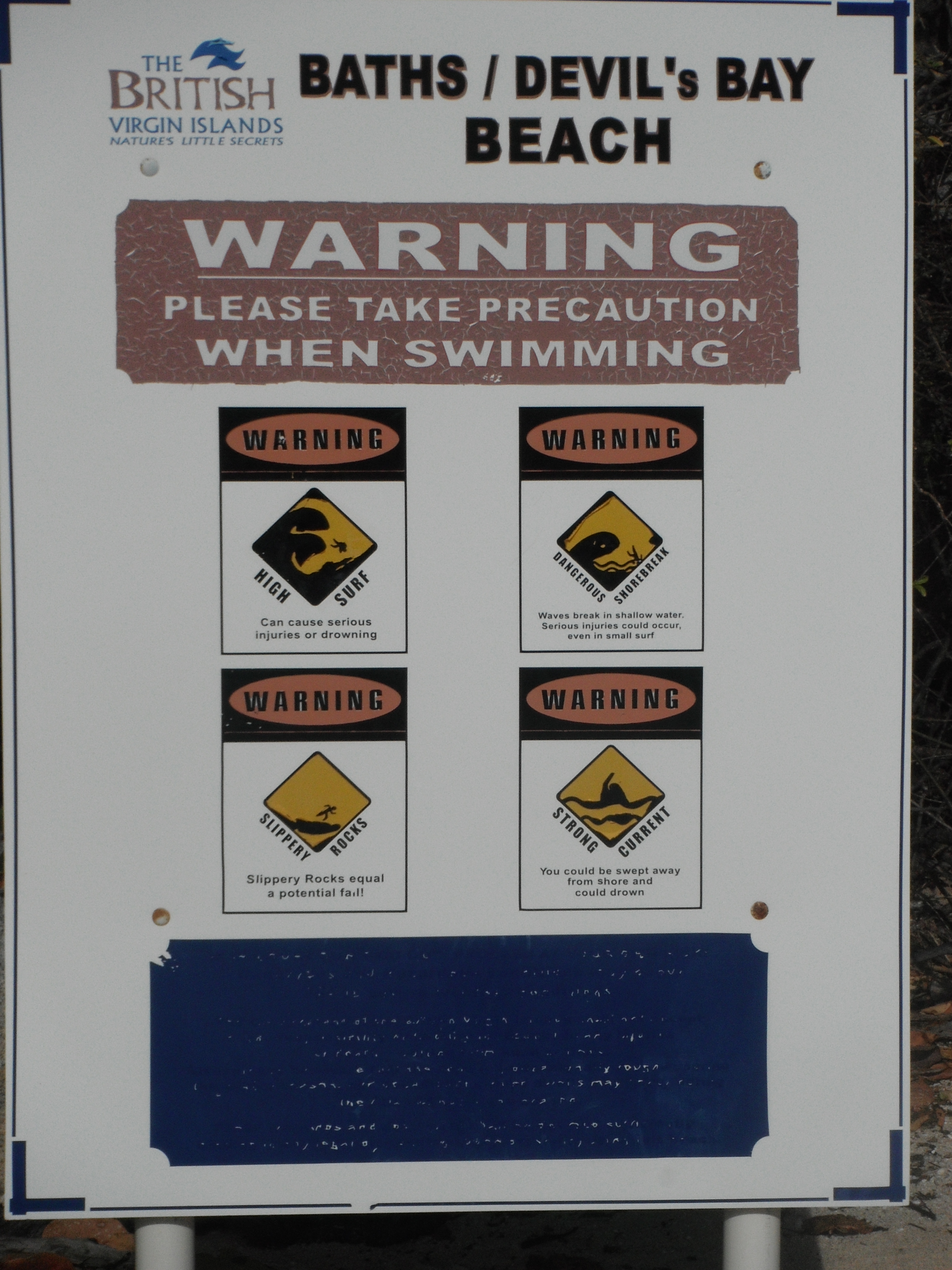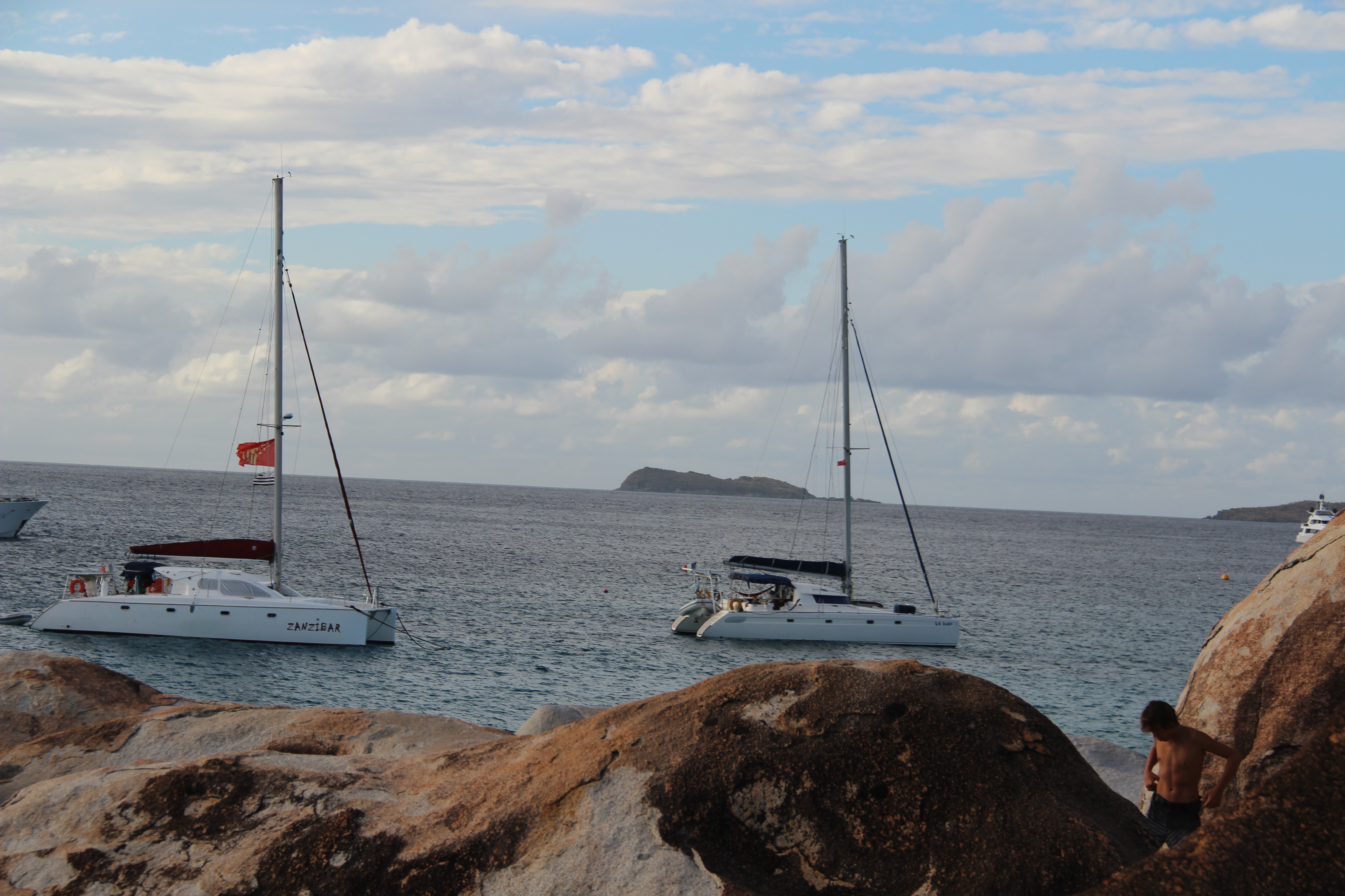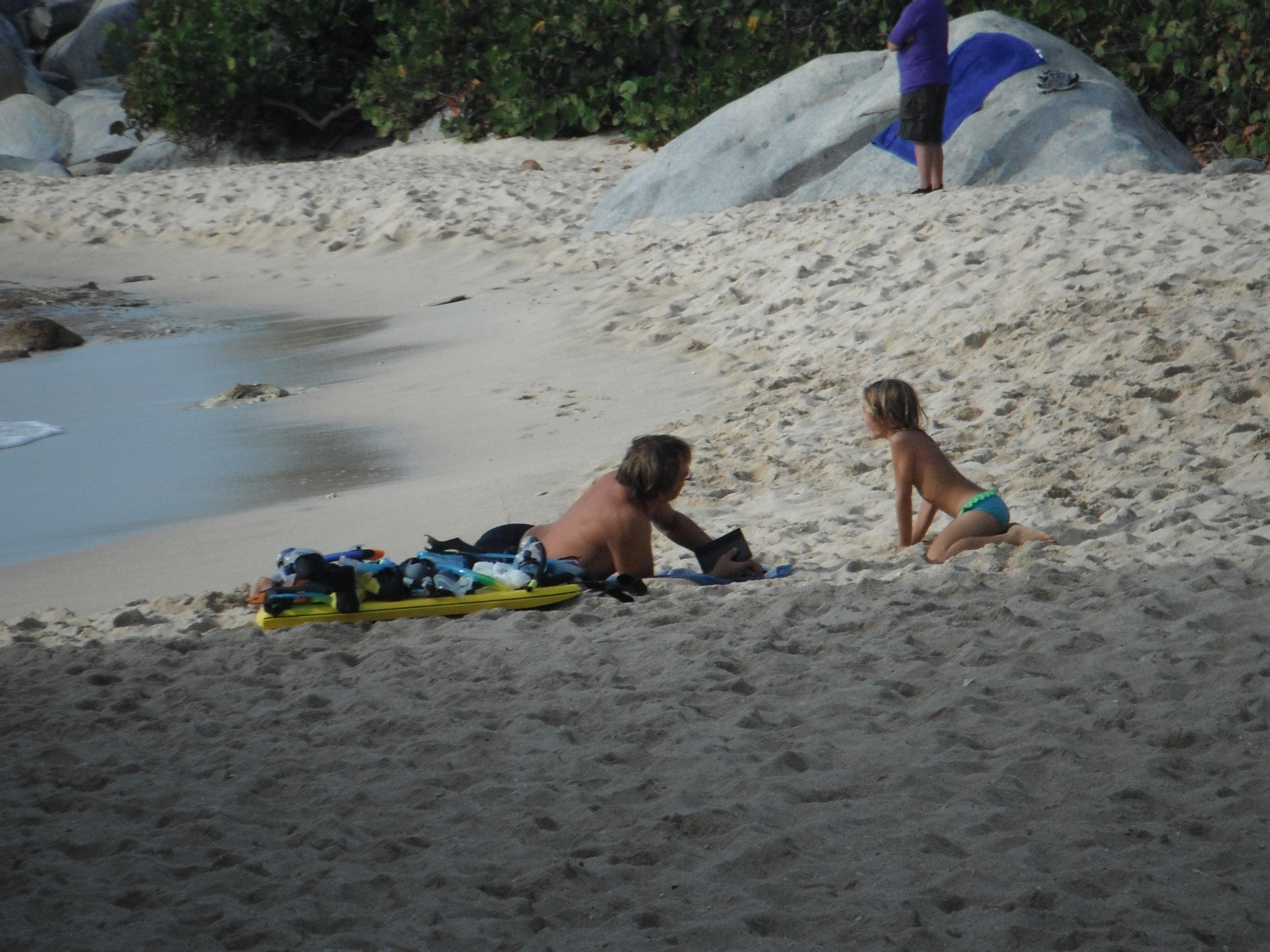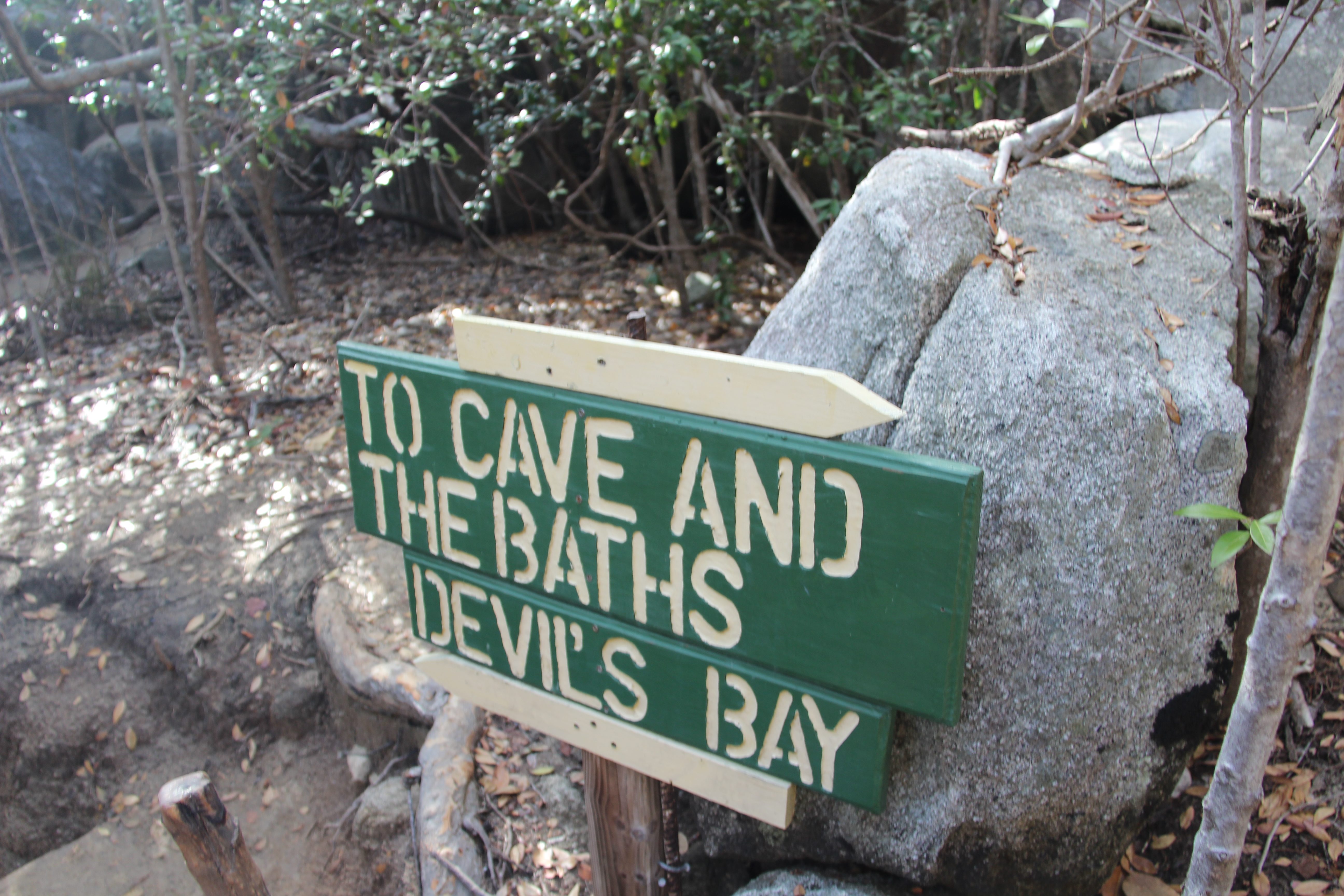 Nous retrouvons l’équipage du Bubu, parti quelques jours avant nous de St Martin. Réserve naturelle oblige, le mouillage est interdit dans la zone et nous prenons une bouée devant les mythiques Baths, sous un beau grain (comme d’hab !) et à l’arrache (c’est un peu la loi de la jungle : il faut être drôlement réactif pour ne pas se faire piquer la bouée sous l’étrave…). Les Baths sont un labyrinthe de baignoires naturelles en partie envahies par la mer, formées dans un amoncellement de blocs de granit d’origine volcanique, disséminés le long de la plage. Le spectacle est tout à fait étonnant : des petites piscines aux eaux cristallines se cachent entre les rochers ou dans les grottes creusées par le vent, les marées ou les tempêtes. Les dinghy n’étant pas autorisés à accoster, on nage jusqu’à la plage puis on chemine lentement dans le dédale de roche jusqu’à Devil’s Bay. Jolie promenade aquatico-pédestre. Les enfants se régalent de ces rochers à escalader, des grandes flaques d’eau claire où se trempouiller, des nombreuses cachettes où jouer aux pirates.