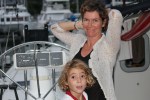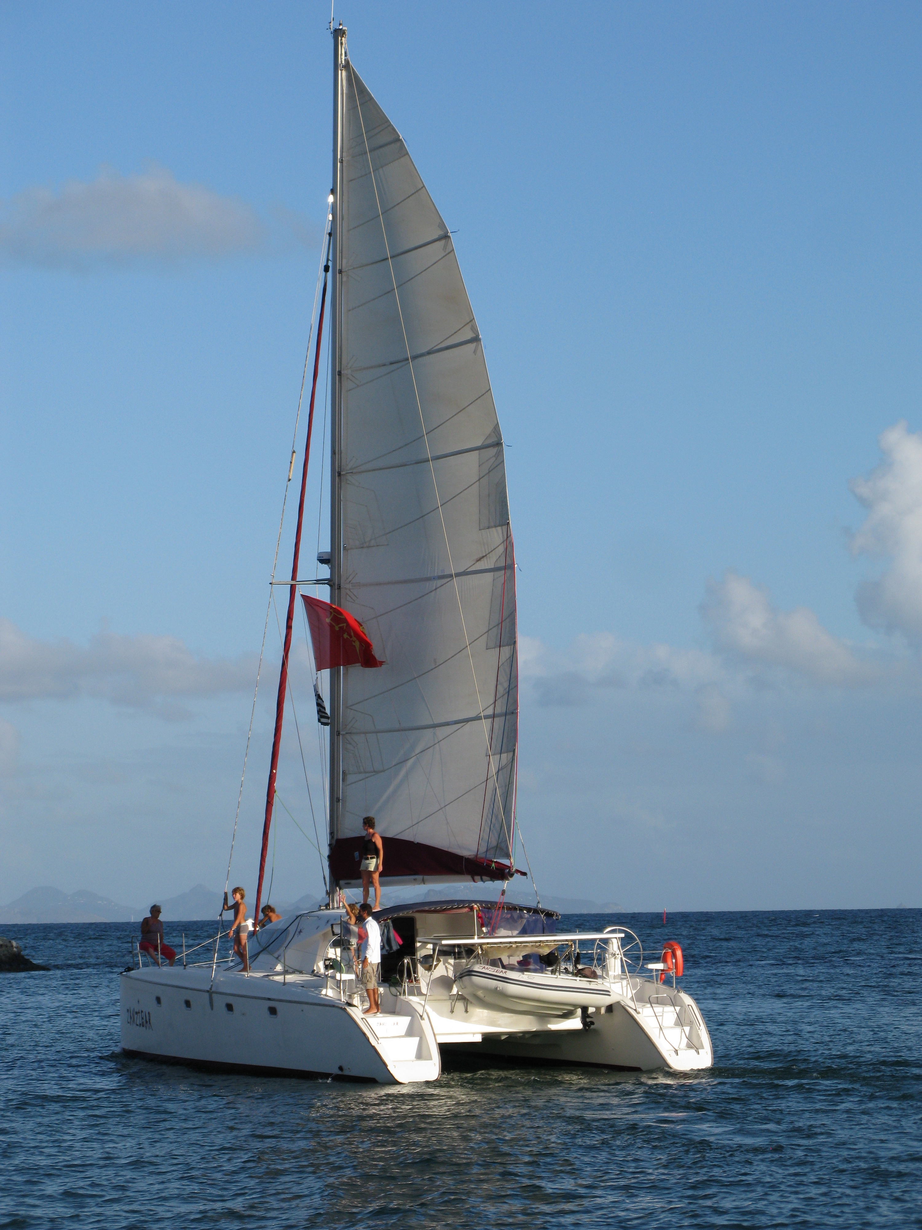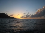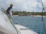 Nous achevons d’exploser l’embout de bôme après 20 minutes, dans les mêmes conditions de mer et de vent que la première fois. Nickel. Ca, c’est fait, on peut passer à autre chose ! Par exemple profiter du magnifique coucher de soleil, après avoir pétassé un vague point d’ancrage de secours pour la bordure de GV. Pas de lune mais des étoiles, et une petite houle arrière qui nous berce… Eole se fait un peu prier avant de nous emporter au grand largue sur les dernières heures de la nuit. Les enfants, enrhumés et fatigués, nous plantent au moment de prendre leur quart… Nous assurons donc bravement notre nuit sans eux, en dépit de notre petite forme post-fiestas Saint Martinoises…