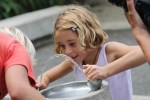 Un peu plus loin sur la route, nous nous arrêtons à la tour Yokahu, haute de 21 mètres. Du sommet on embrasse d’un coup d’œil le relief escarpé et luxuriant qui s’étend jusqu’à la mer. Juju et Thibaud découvrent, ébahis, les traditionnelles fontaines à eau américaines et boivent comme des petits chameaux tellement ça les amuse !