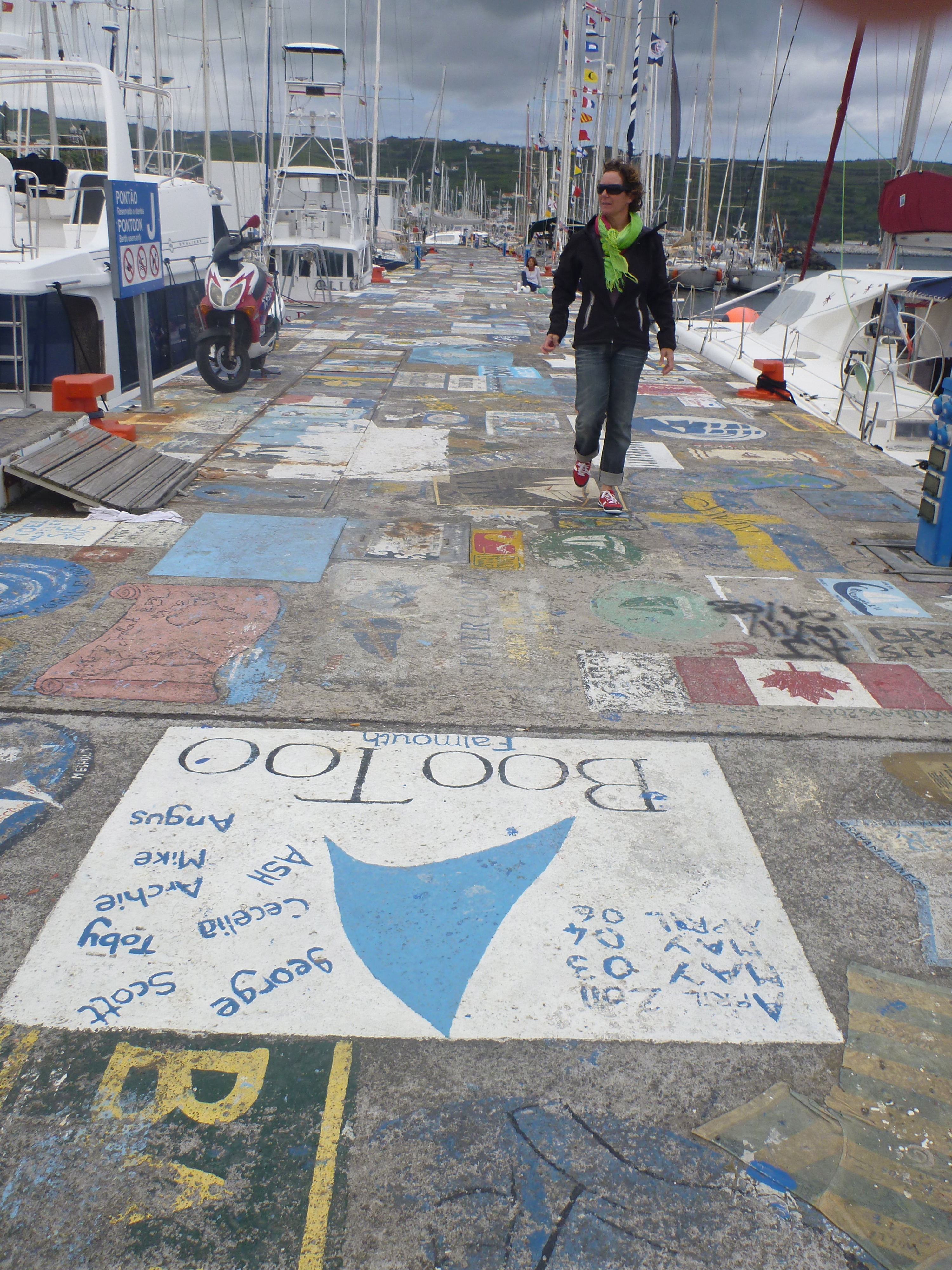 C’est le bazar dans le port d’Horta : il n’y a plus de possibilité d’amarrage à quai et on est censé rester au mouillage en attendant qu’une hypothétique place se libère. Mais nous on veut de l’eau !!! Alors qu’on progresse doucement entre les bateaux déjà à l’ancre, un immense monocoque largue les amarres en libérant 30 mètres de ponton d’un coup : nous sommes 3 voiliers à prendre d’assaut le bout de quai ainsi libéré. Maintenant la marina peut toujours se battre pour nous déloger, d’autant que très rapidement plusieurs navires se mettent à couple. Les pauvres marineros doivent vraiment galérer avec tous ces navigateurs de passage qui, sous prétexte de transat, de fatigue, de manque d’eau ou d’électricité, font leur vie comme bon leur semble… Ils n’en restent pas moins très gentils et… fatalistes devant la situation.