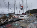 Le vent monte dès le mardi, et l’angoisse avec : les copains sont toujours sur l’eau et tentent de maintenir une vitesse suffisante pour avaler les derniers milles et arriver dans la nuit. La situation devient quand même tendue pour eux. On suit leur progression toute la soirée sur l’écran AIS et par VHF. Ils entrent dans le port vers 2 heures du matin, avec une mer déjà belle et des rafales qui les font reculer. Nous les attendons sur un quai pour les aider à s’amarrer mais ils ne peuvent absolument pas manœuvrer pour s’en approcher. Leur safran manquant leur fait cruellement défaut mais il semble surtout qu’une hélice soit aussi endommagée : impossible de diriger le bateau face au vent. De guerre lasse, ils jettent l’ancre à l’entrée du mouillage, par 12 mètres de fond et un vent qui souffle très fort : impossible de dormir dans ces conditions. Ils ne sont toujours pas au bout de leurs peines et nous sommes bien désolés pour eux, impuissants à les aider.