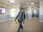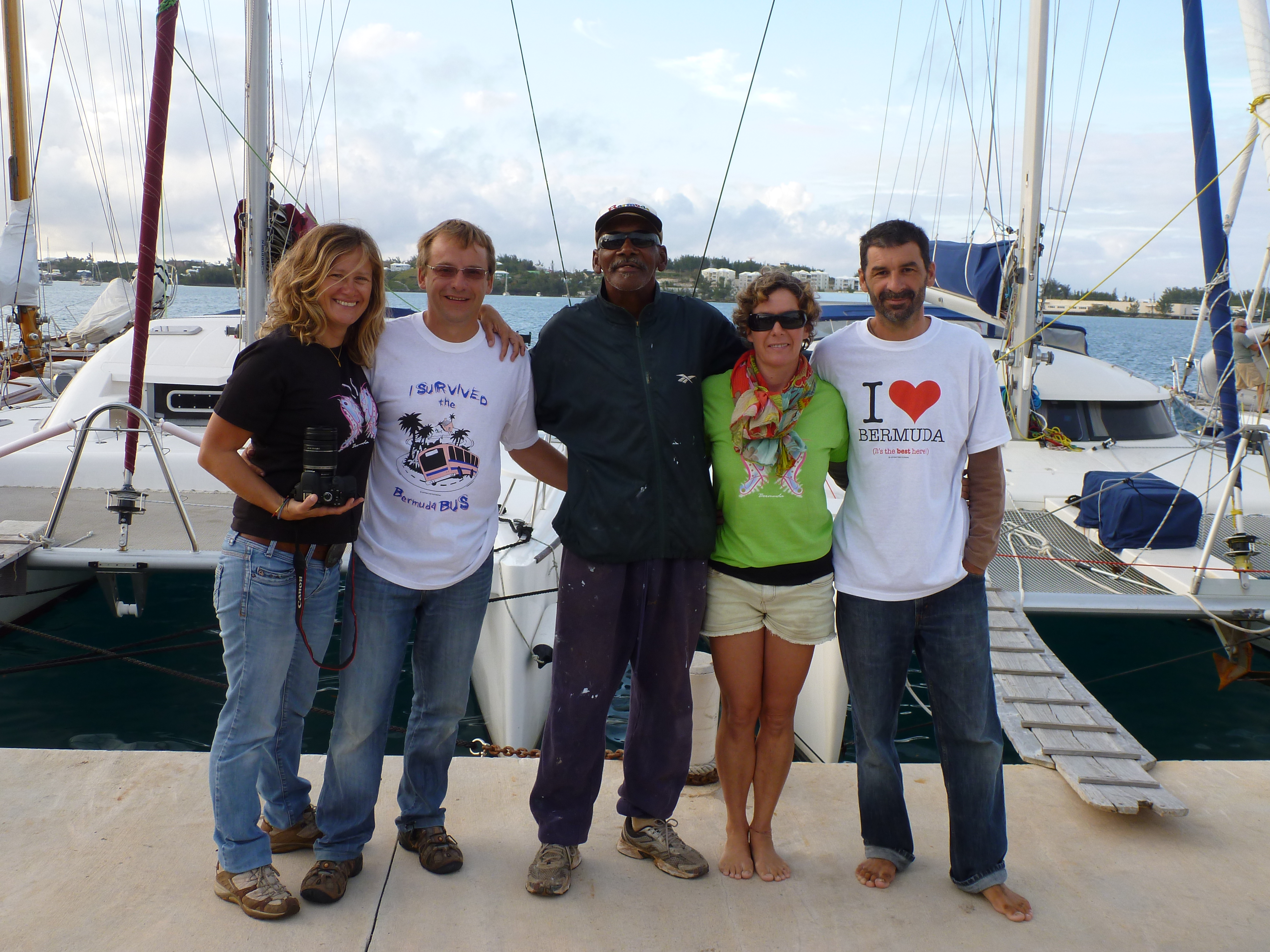 Cyril arrive le 13 mai à l’aéroport d’Hamilton, après 29 heures de voyage : Montpellier-Dublin-New York-Bermudes. Le new crew est motivé !! Et un peu fatigué quand même… D’autant qu’il reste coincé à l’immigration faute d’adresse à destination et de preuve d’embarquement sur un navire… Il a déjà eu du mal à convaincre les autorités américaines, là ça coince complètement. L’agent Patricia, sa nouvelle amie, nous fait appeler désespérément dans le hall des arrivées (où nous nous inquiétons de ne pas le voir sortir avec les autres passagers) mais il y a tellement de bruit qu’on ne l’entend pas. Lasse, elle finit par venir chercher le cap’tain et accepte d’échanger son prisonnier contre la promesse d’un mail régularisant sa situation. Il peut maintenant avancer d’une case et passer la douane avec les filtres à gasoil, les cames de bôme, les courroies d’alternateur, un peu de cned, un sac étanche, les savons « eau de mer », les secrets d’arôme Knorr, un peu de rosé, la carte sim de l’iridium, ses palmes, son masque, sa combi… (il a du se séparer du stock Haribo, faute de place : Pascale, Julie et Ugo, ayez une petite pensée pour nous en vous gavant avec nos bombecs, vautrés au chaud sur le canapé !!)… Ca fatigue les douaniers rien que de regarder dans son énorme sac de plongée jaune : ils le laissent passer gentiment sans payer aucune taxe. Ne reste plus qu’à prendre le bus pour St Georges. Fastoche !