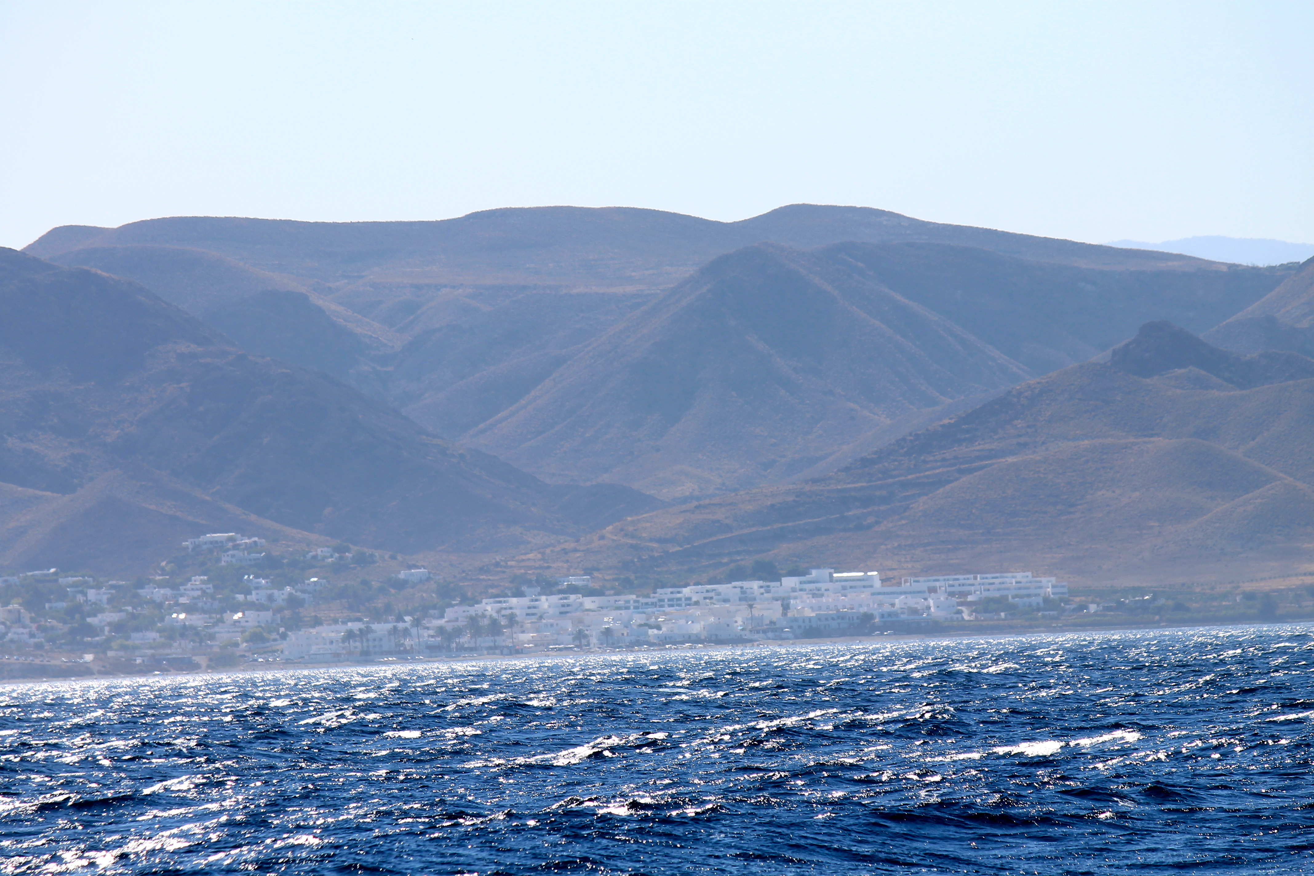 30 juin – On ne s’attarde pas à Aguadulce et reprenons vite la mer pour passer le Cabo de Gata en direction du petit port de San José, juste au nord de la pointe. On a l’intention d’y passer la soirée à terre, Espagne en finale de coupe d’Europe de foot oblige (pas pour le foot évidemment, mais pour l’ambiance !). Sauf que là aussi ça affiche complet… Qu’à cela ne tienne, tant pis pour le foot, on continue sur quelques milles pour aller jeter l’ancre à la Cala San Pedro, dont Matthieu nous a vanté la beauté. Et il avait raison : des falaises calcaires qui se jettent dans l’eau turquoise, un joli village aux maisons blanches baigné de la lumière dorée du crépuscule, c’est vraiment très beau. Mais au moment