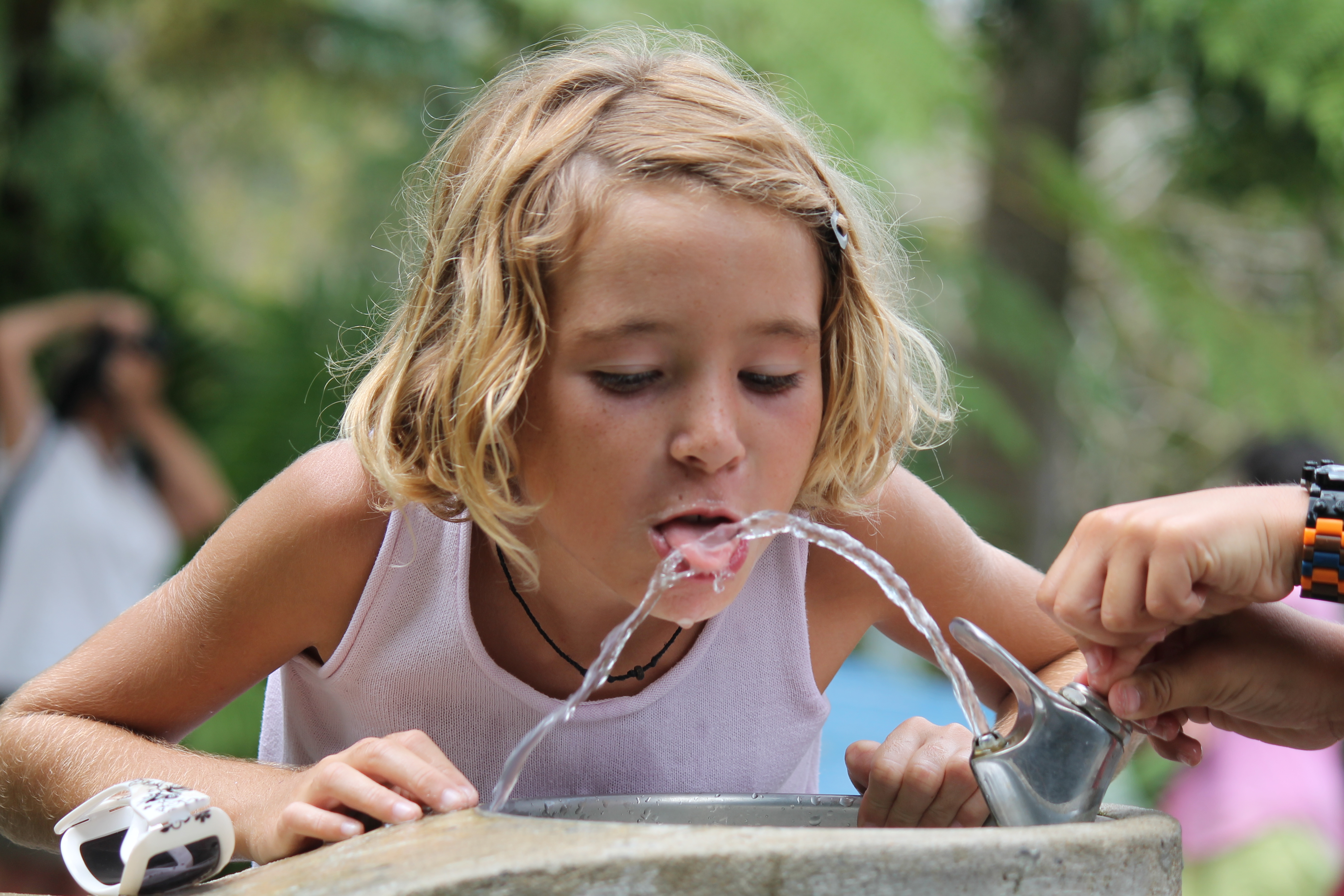 Un peu plus loin sur la route, nous nous arrêtons à la tour Yokahu, haute de 21 mètres. Du sommet on peut embrasser d’un coup d’œil le relief escarpé et luxuriant qui s’étend jusqu’à la mer. Juju et Thibaud découvrent, ébahis, les traditionnelles fontaines à eau américaines et boivent comme des petits chameaux tellement ça les amuse !